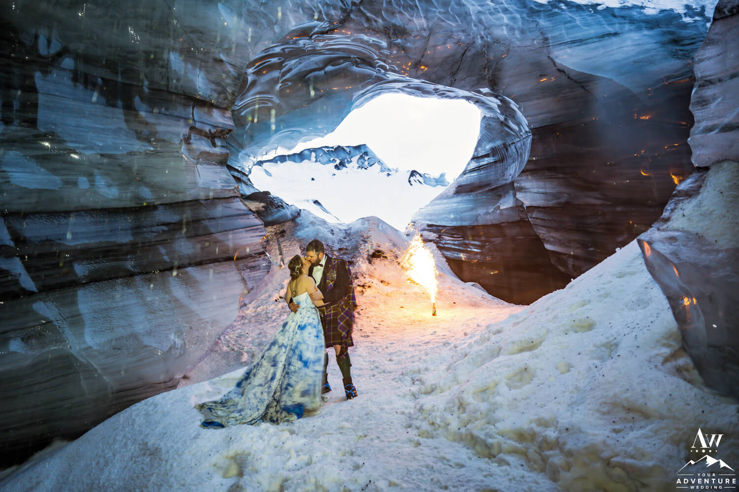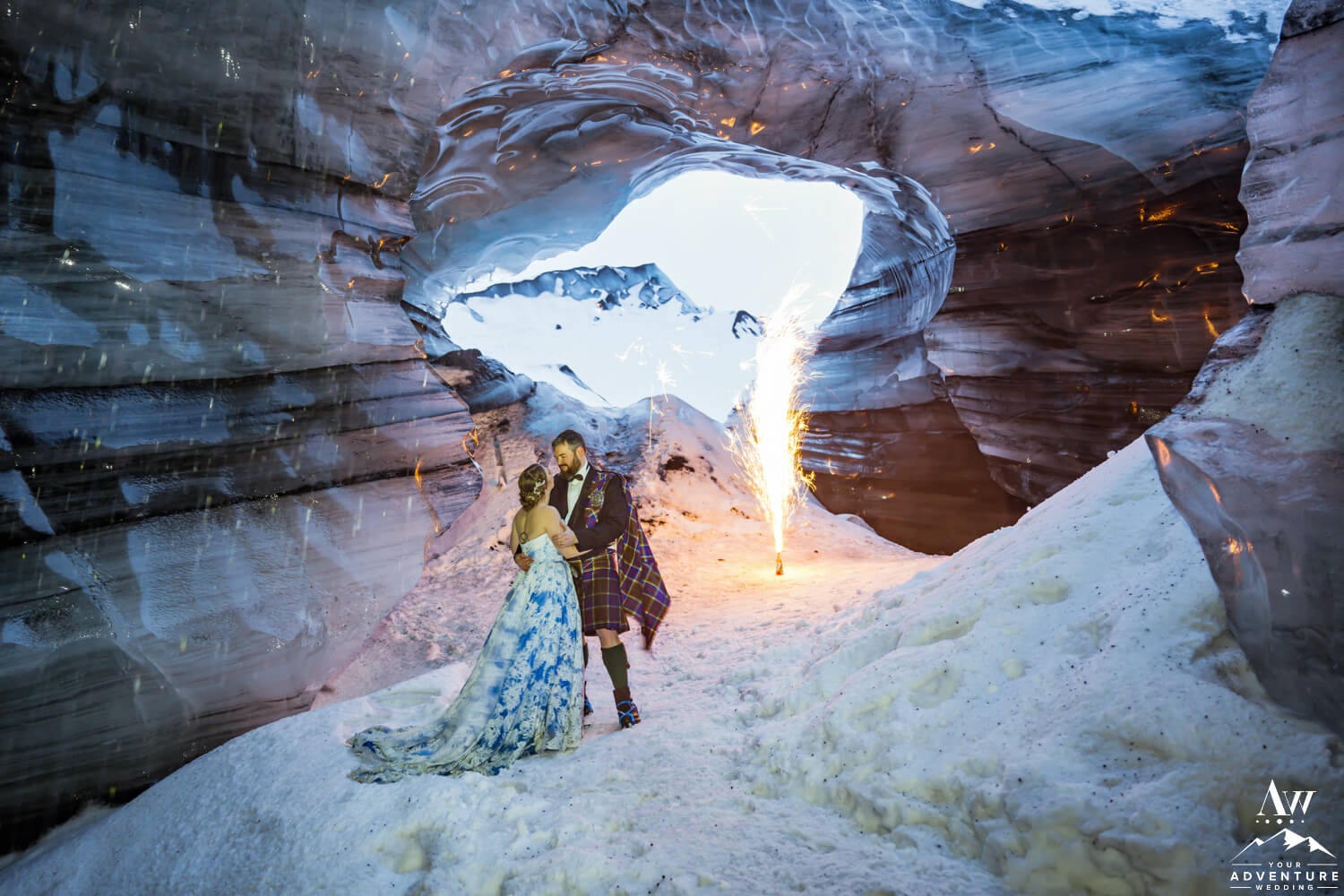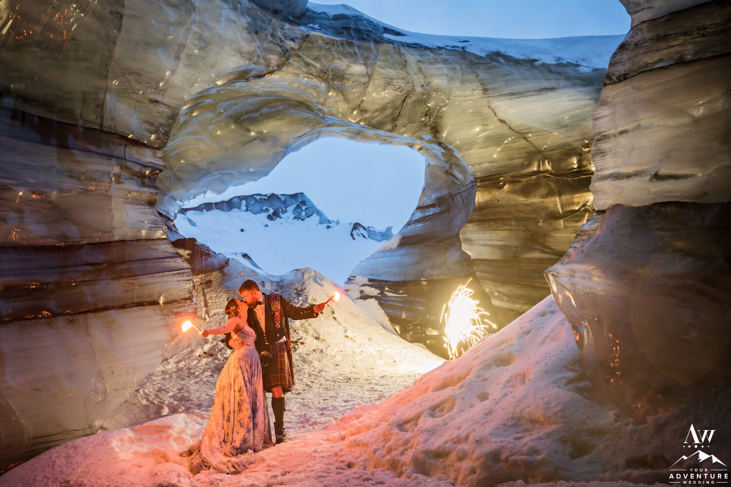 After a hike up and into the cave the couples eyes marveled over the grandeur of the area. Additionally also over the fact it’s a once in a lifetime spot! Further, the pair crossed rivers, rain, and wind. The spot to create some nighttime magic, is at the sinkhole area of the ice cave. It was there that the flares and ground fireworks would be picturesque as you’ll see below from our Iceland wedding photographer!