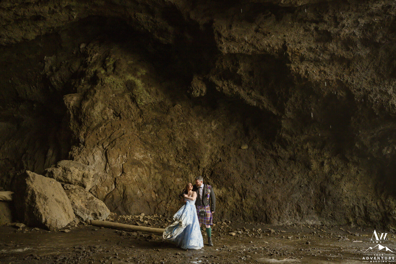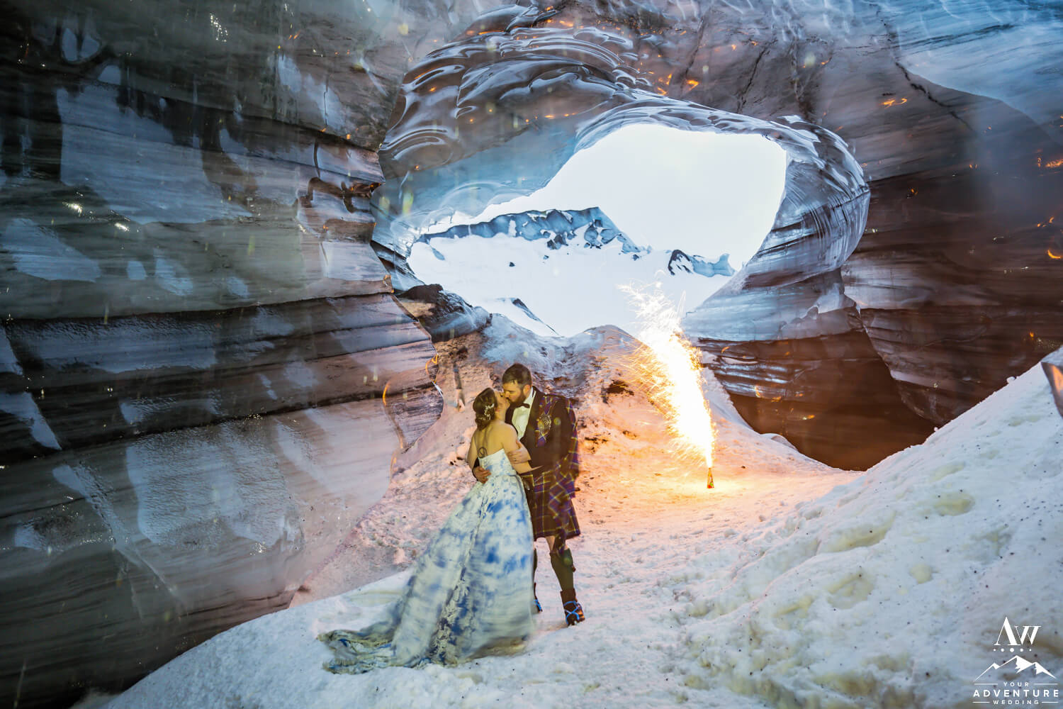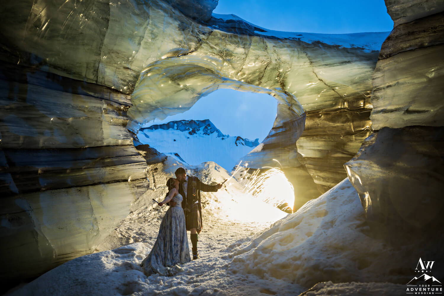 After a hike up and into the cave the couples eyes marveled over the grandeur of the area. Additionally also over the fact it’s a once in a lifetime spot! Further, the pair crossed rivers, rain, and wind. The spot to create some nighttime magic, is at the sinkhole area of the ice cave. It was there that the flares and ground fireworks would be picturesque as you’ll see below from our Iceland wedding photographer!