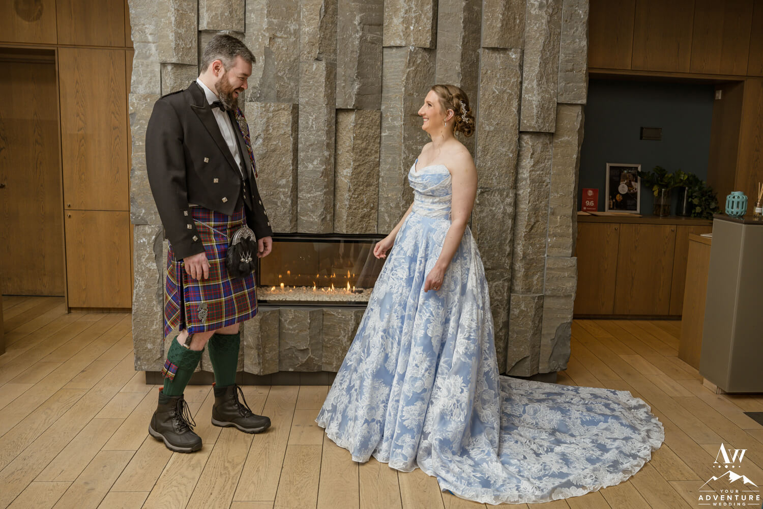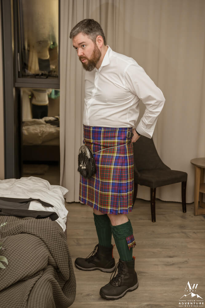 Long before sunrise their immersive wedding experience began at Hotel Vik. First, our Iceland hair and makeup team began crafting Elizabeth’s fabulous style. Second our local wedding photographer grabbed the brides two wedding dresses, details, and the grooms Scottish attire. Third, shortly before the group loaded into the super jeep, Elizabeth and Alfred held a sweet first look.