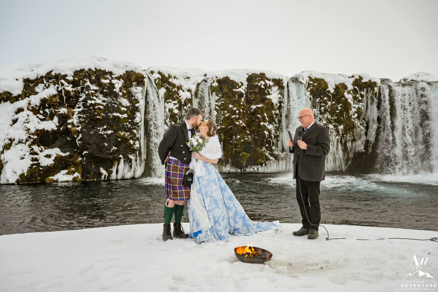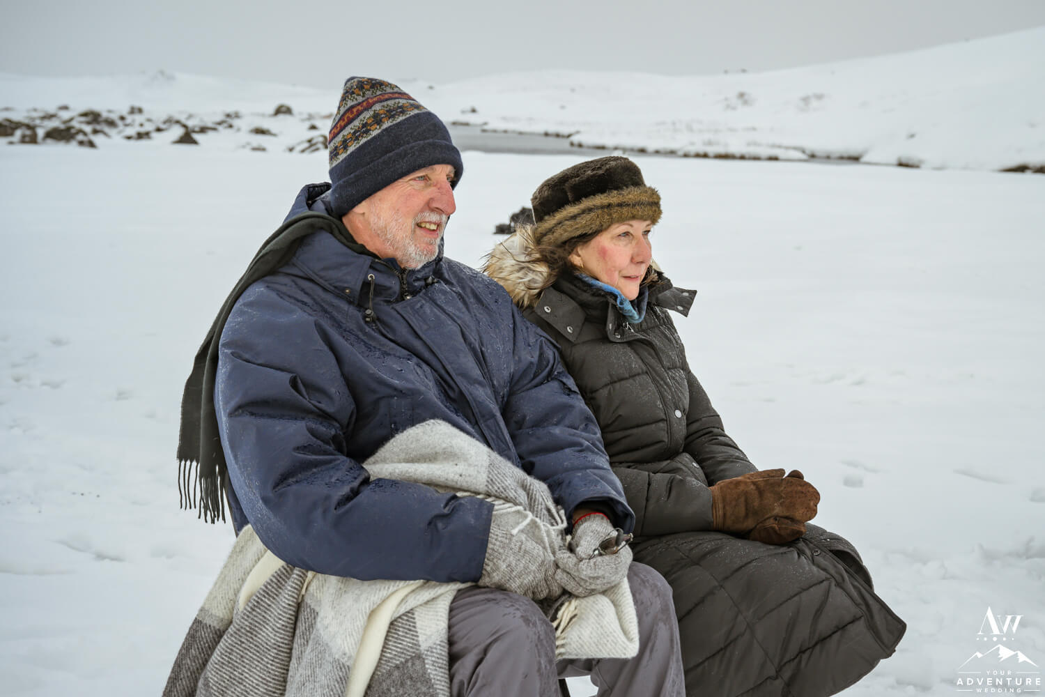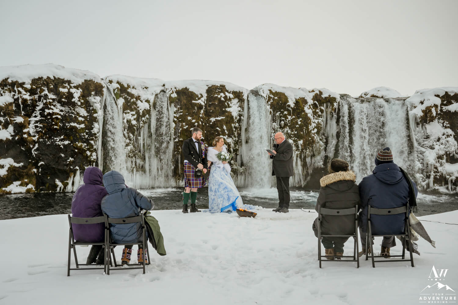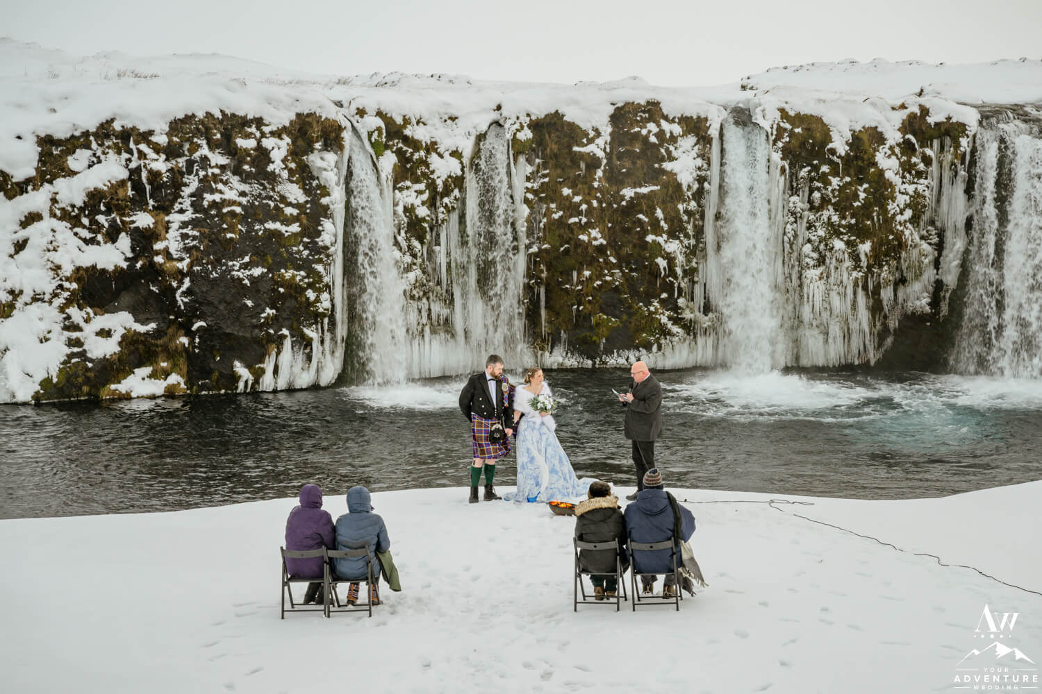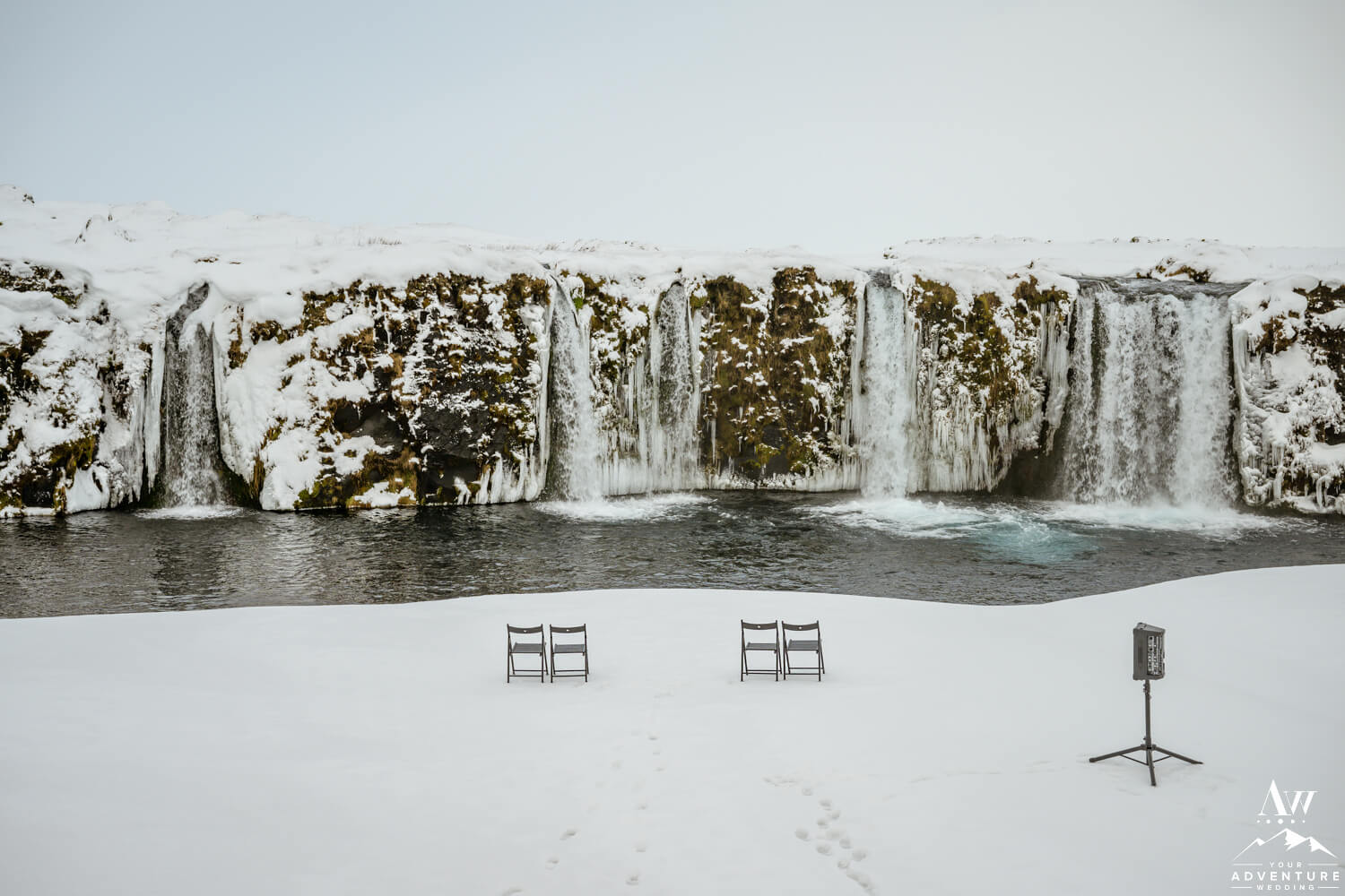 Talk about a winter wonderland! It was S-N-O-W-Y all along the way to their immersive wedding at a waterfall. Upon arrival, our Iceland Wedding Planner team setup the ceremony. For example, black wooden folding chairs, sound system, and romantic firepit!