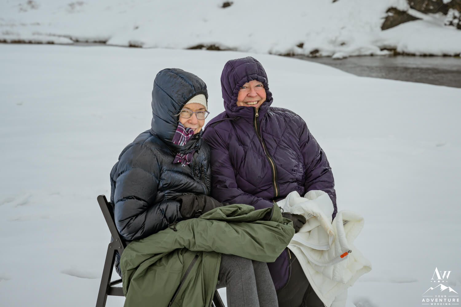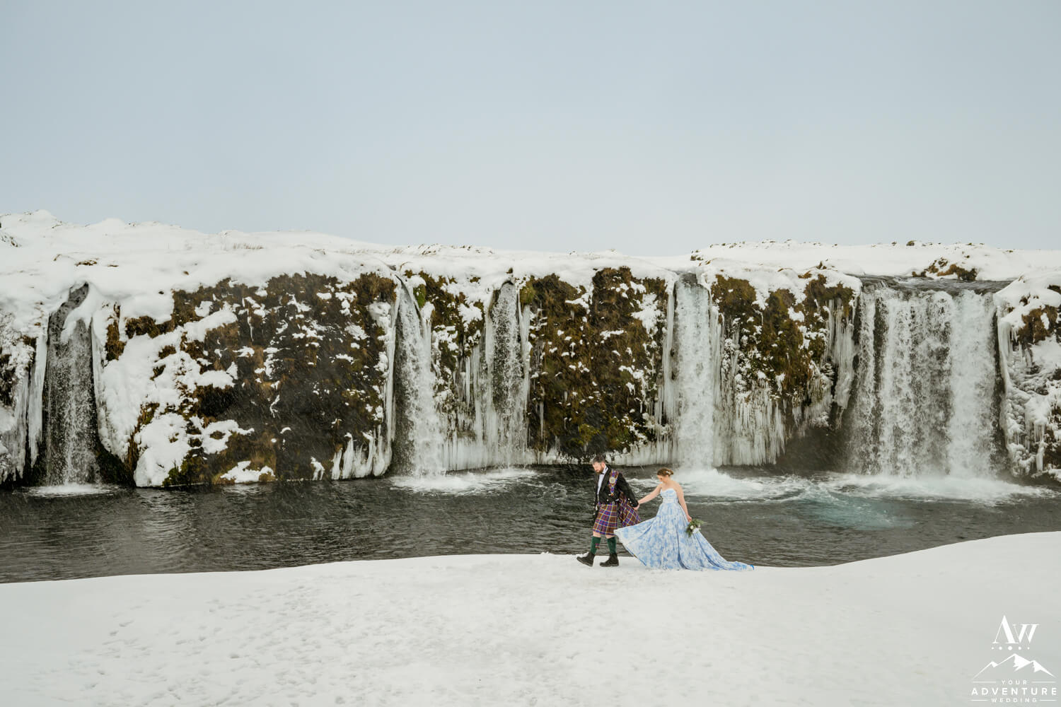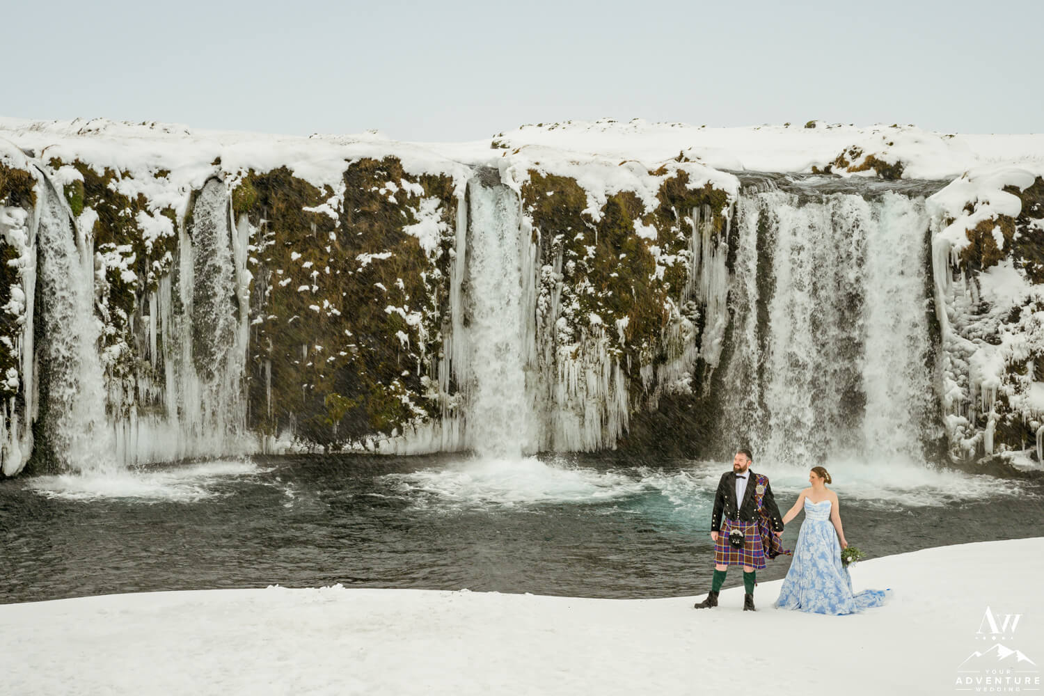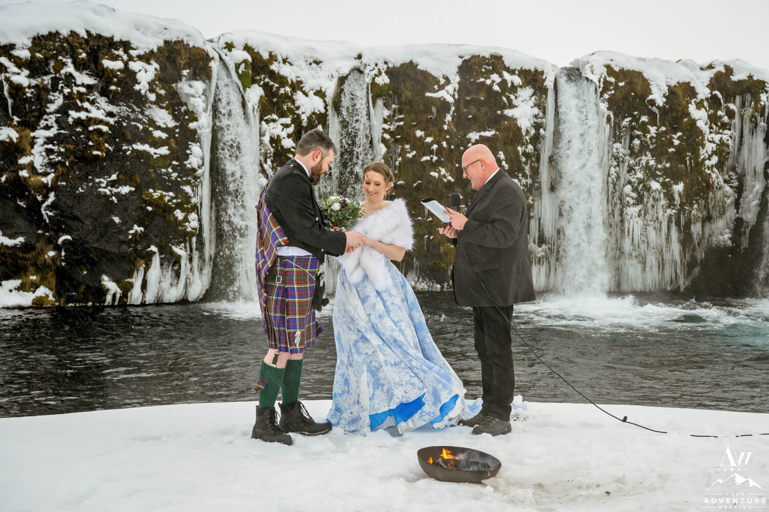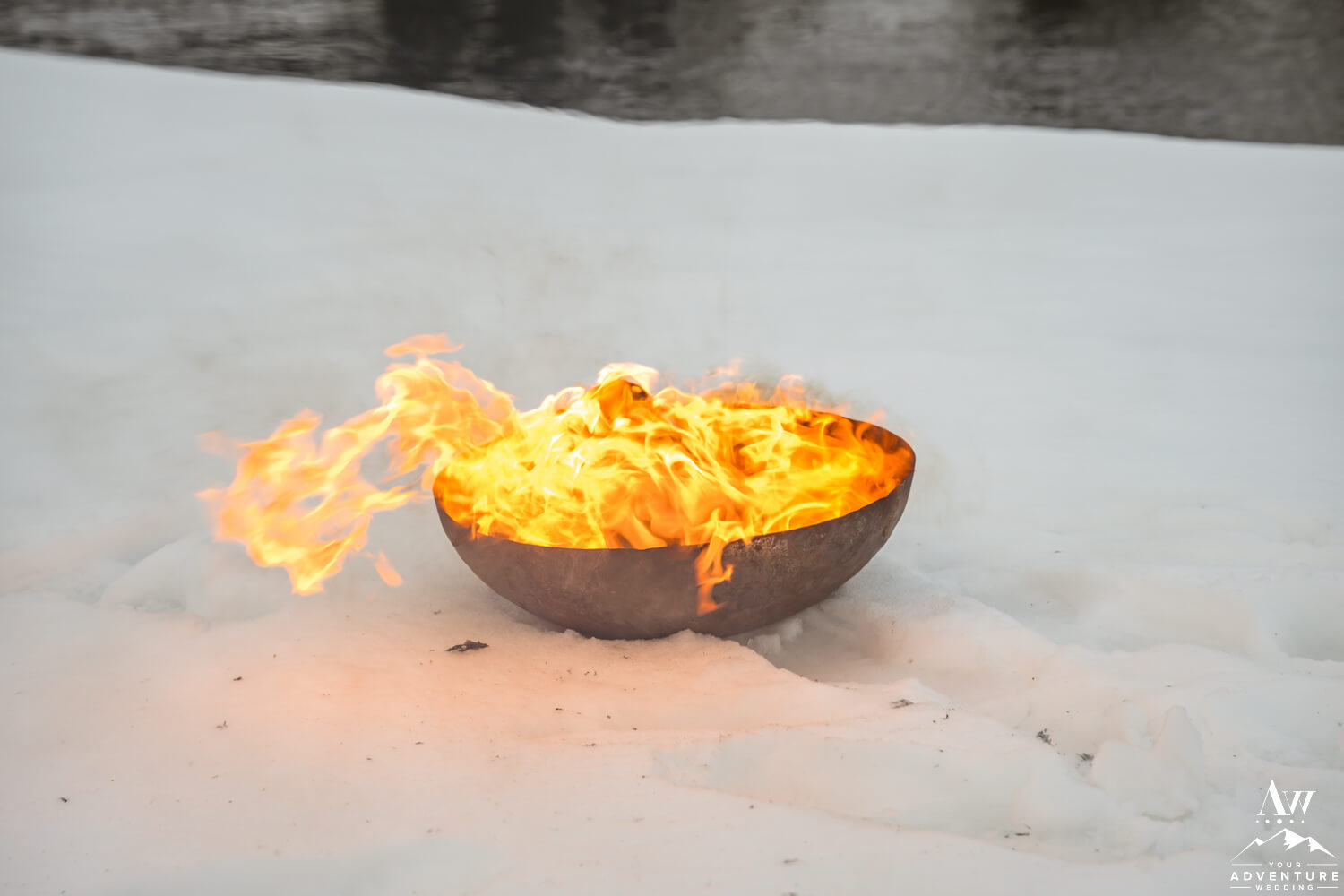 Talk about a winter wonderland! It was S-N-O-W-Y all along the way to their immersive wedding at a waterfall. Upon arrival, our Iceland Wedding Planner team setup the ceremony. For example, black wooden folding chairs, sound system, and romantic firepit!