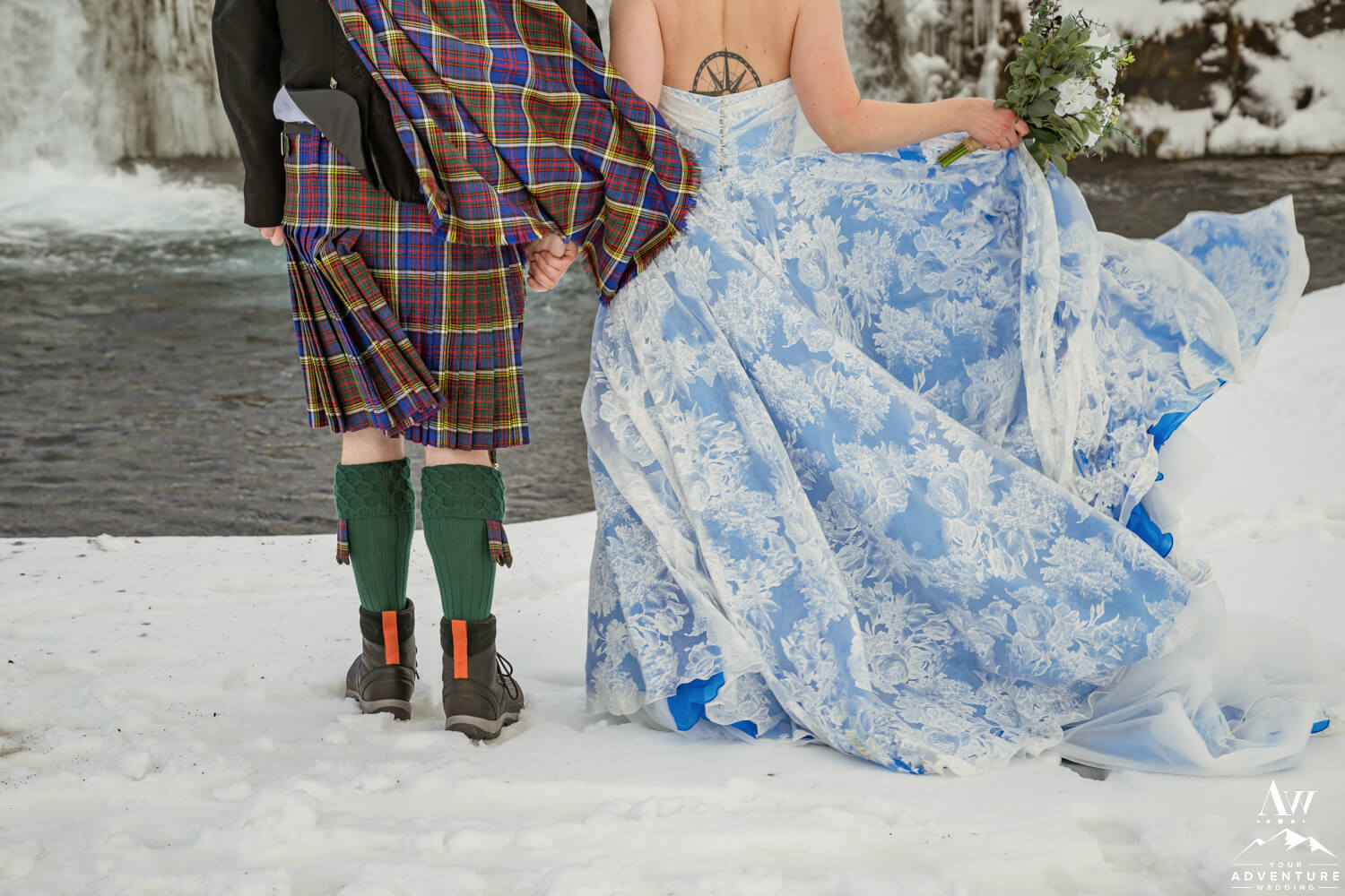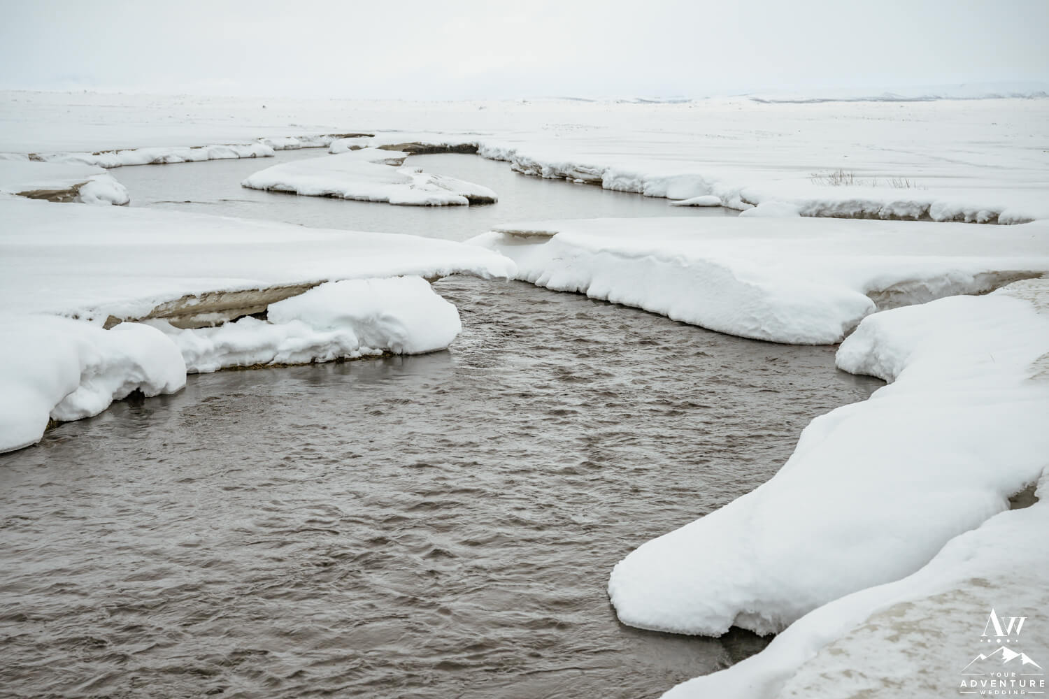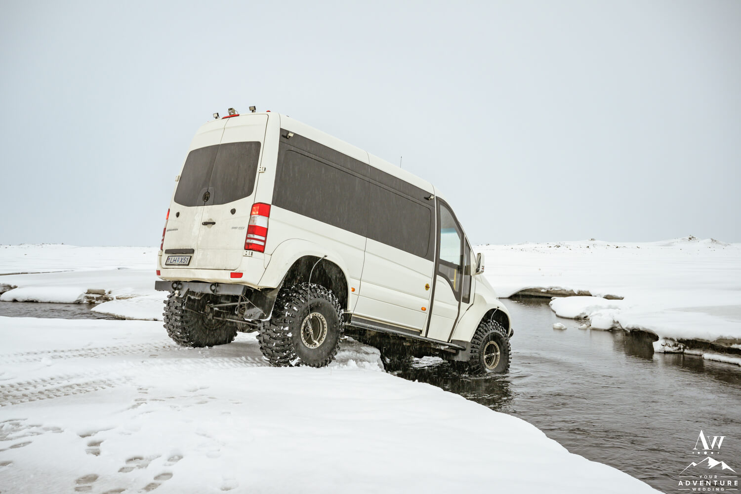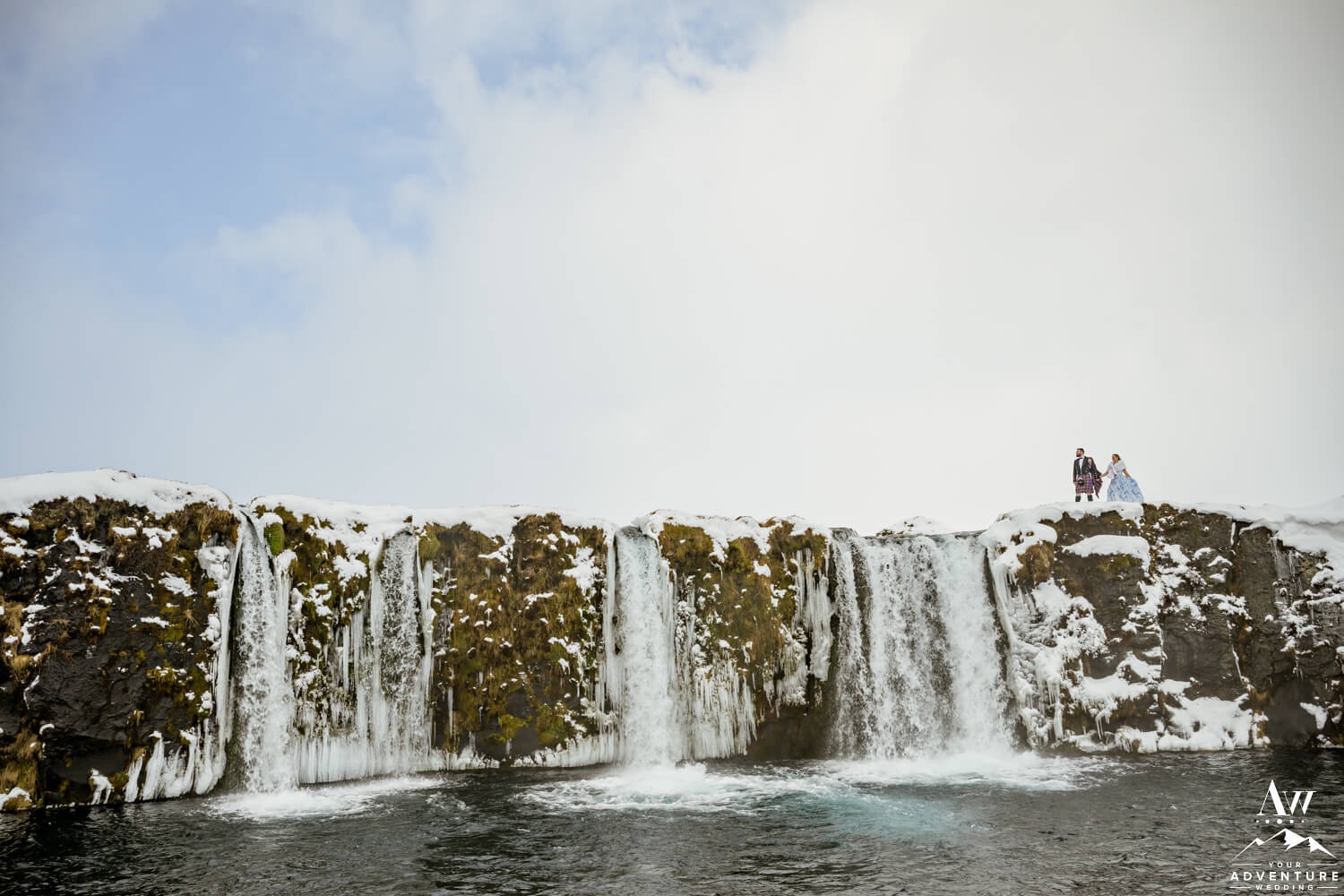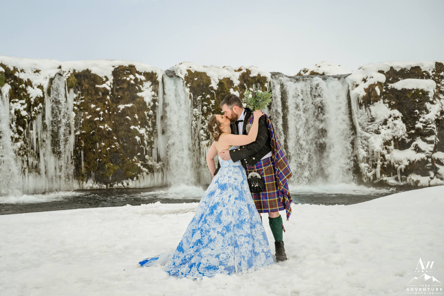 Talk about a winter wonderland! It was S-N-O-W-Y all along the way to their immersive wedding at a waterfall. Upon arrival, our Iceland Wedding Planner team setup the ceremony. For example, black wooden folding chairs, sound system, and romantic firepit!