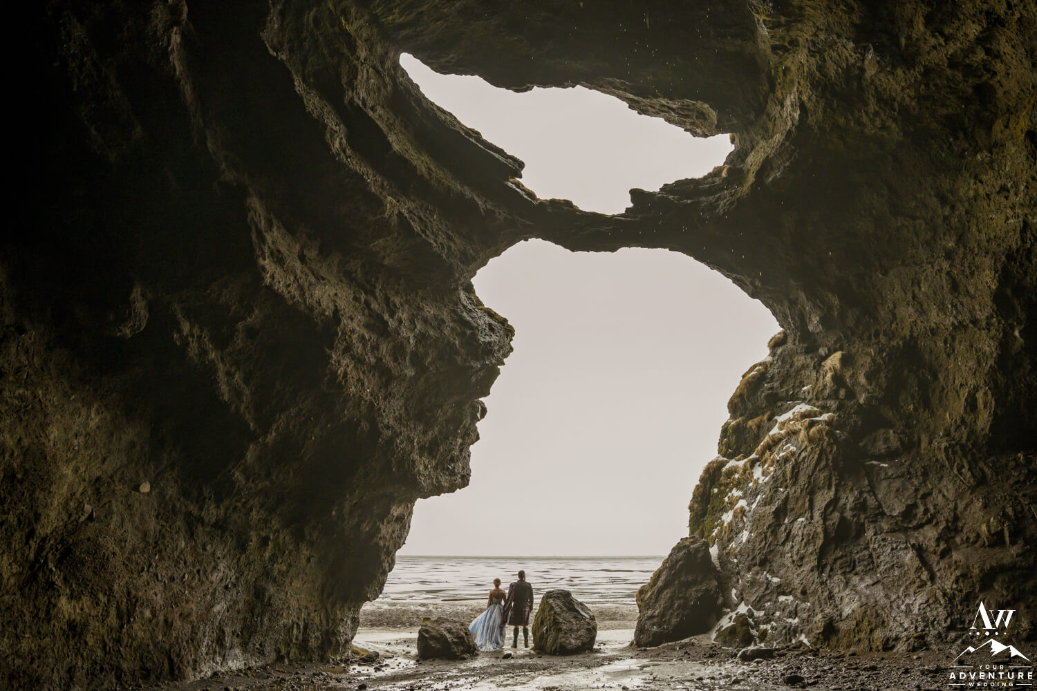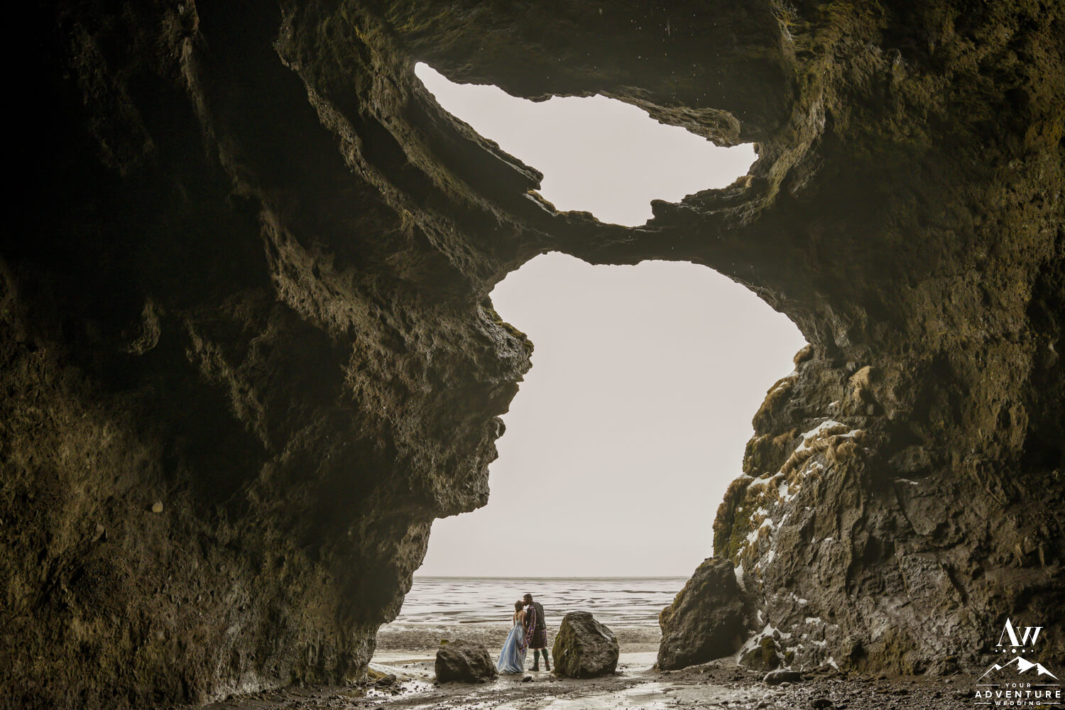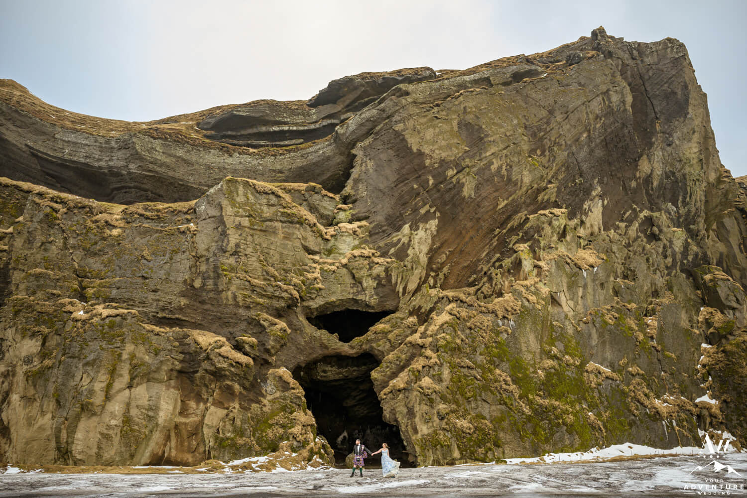 Next, as part of the immersive wedding experience, the newlyweds and their guests warmed up with a coffee, hot chocolate, Icelandic donuts and a first dance! How fun right?! Also they learned about the history of the cave and saw why many refer to the cave inside of the mountain, Hjörleifshöfði as the token “Yoda” cave.