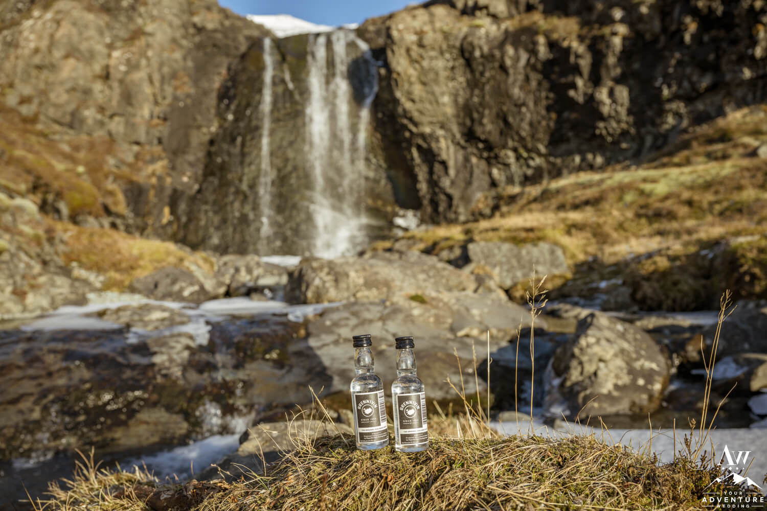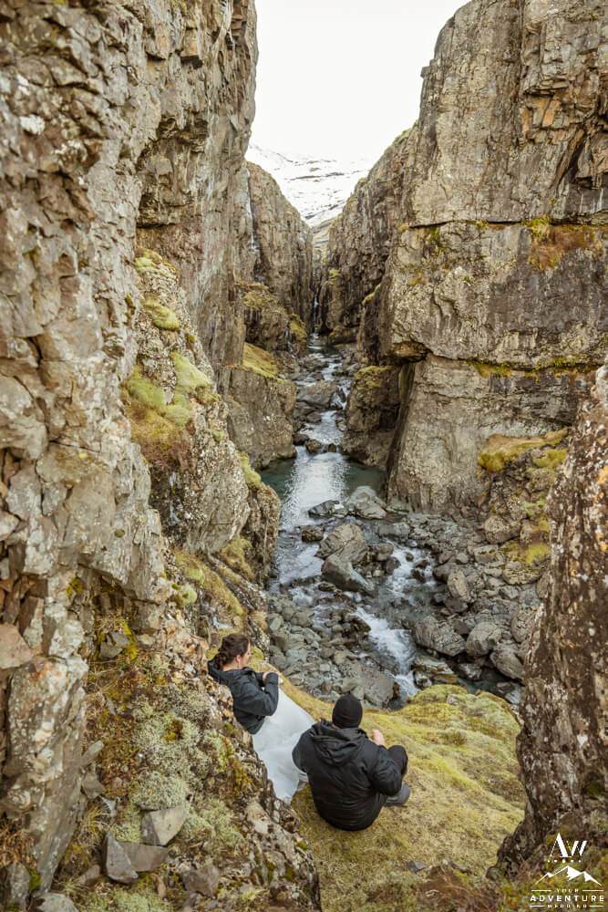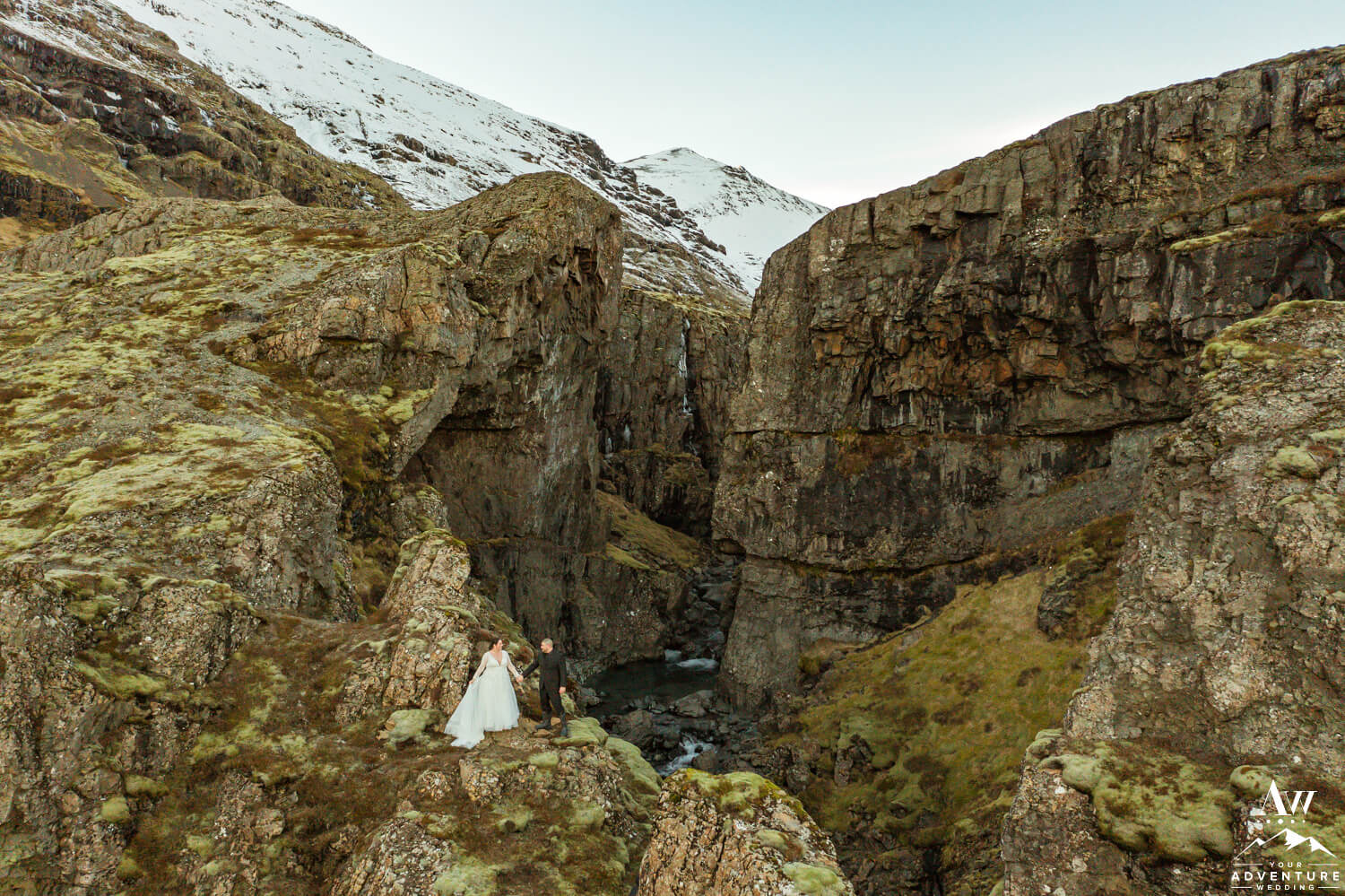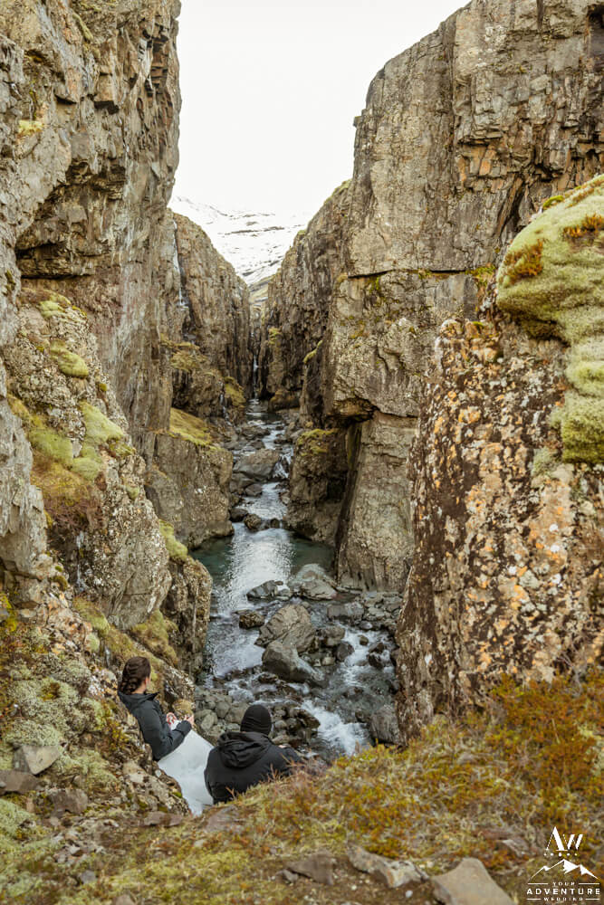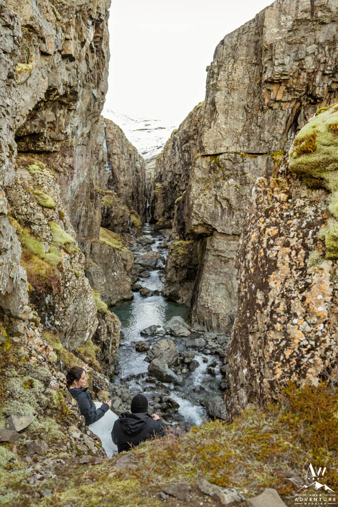 Icelandic rivers ebb and flow in lots of different ways. First, some are raging to create hydropower for our tiny country in the North Atlantic. Second, others craft themselves into extraordinary waterfalls of all sizes. Third, few exude a see through blue that becomes a bookmarker in your brain. Well the latter is next to discover on Brandi and Matt’s February elopement adventure! Meanwhile, after they explored both sides and the natural cave the pair sat and marveled over the beauty this narrow canyon while trying out some Landi (Icelandic moonshine) too!