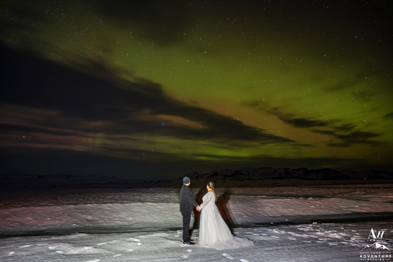 When you embark on a full day adventurous February elopement with our Iceland Wedding Planner team, we always offer the opportunity to head back out over dinner. To do what you might wonder? Well of course sunset or nighttime wedding photos!