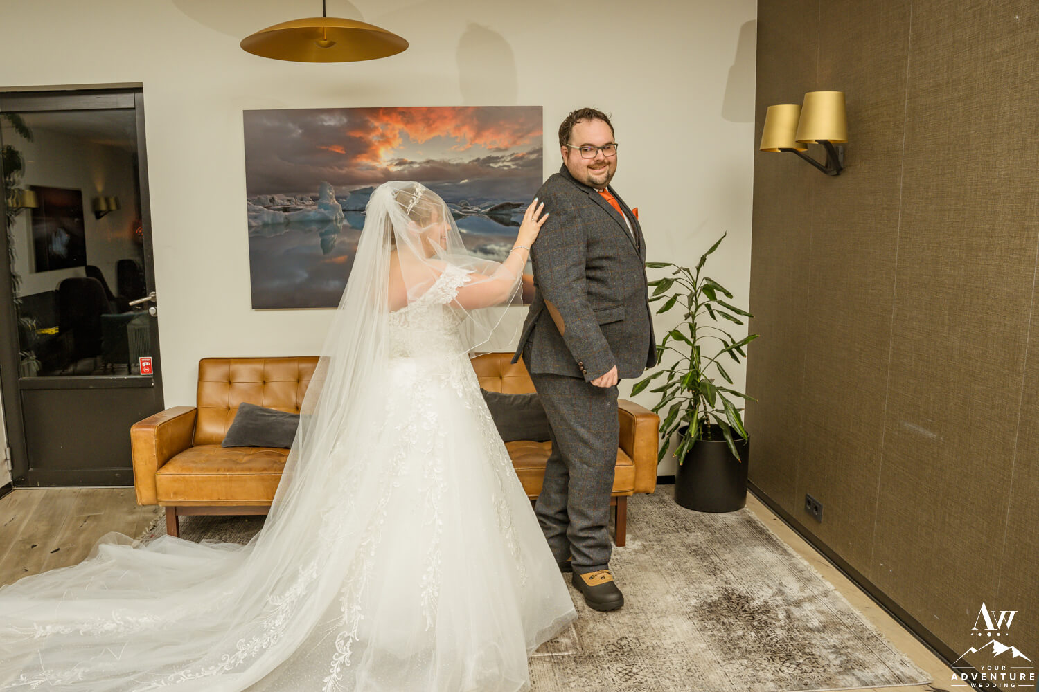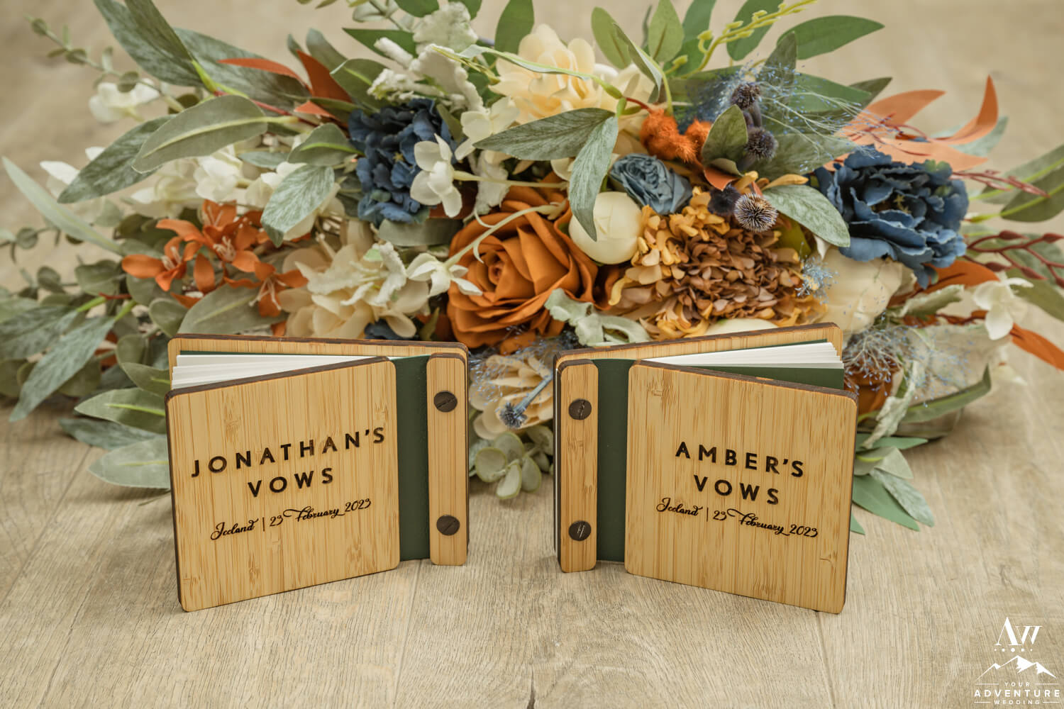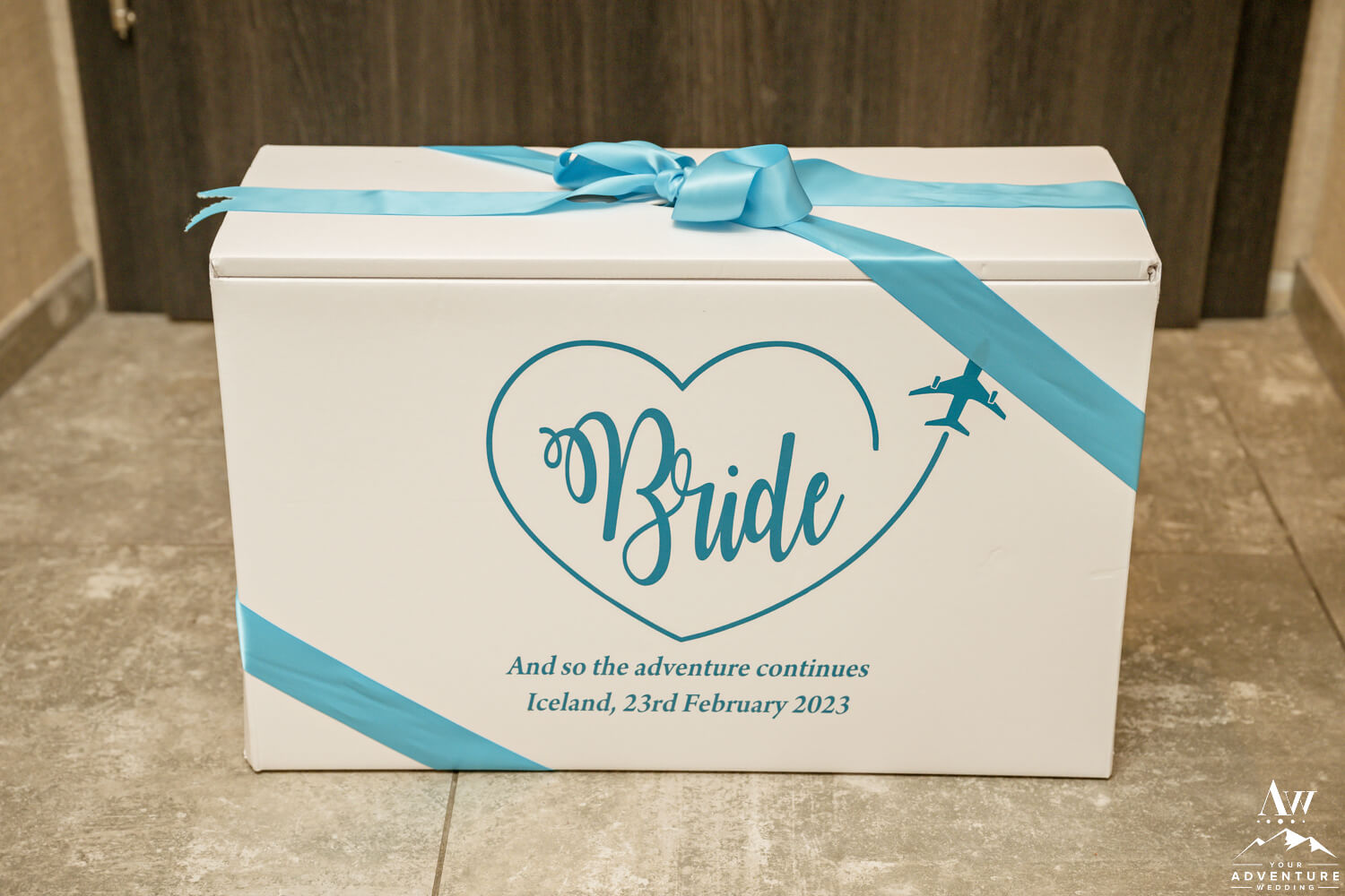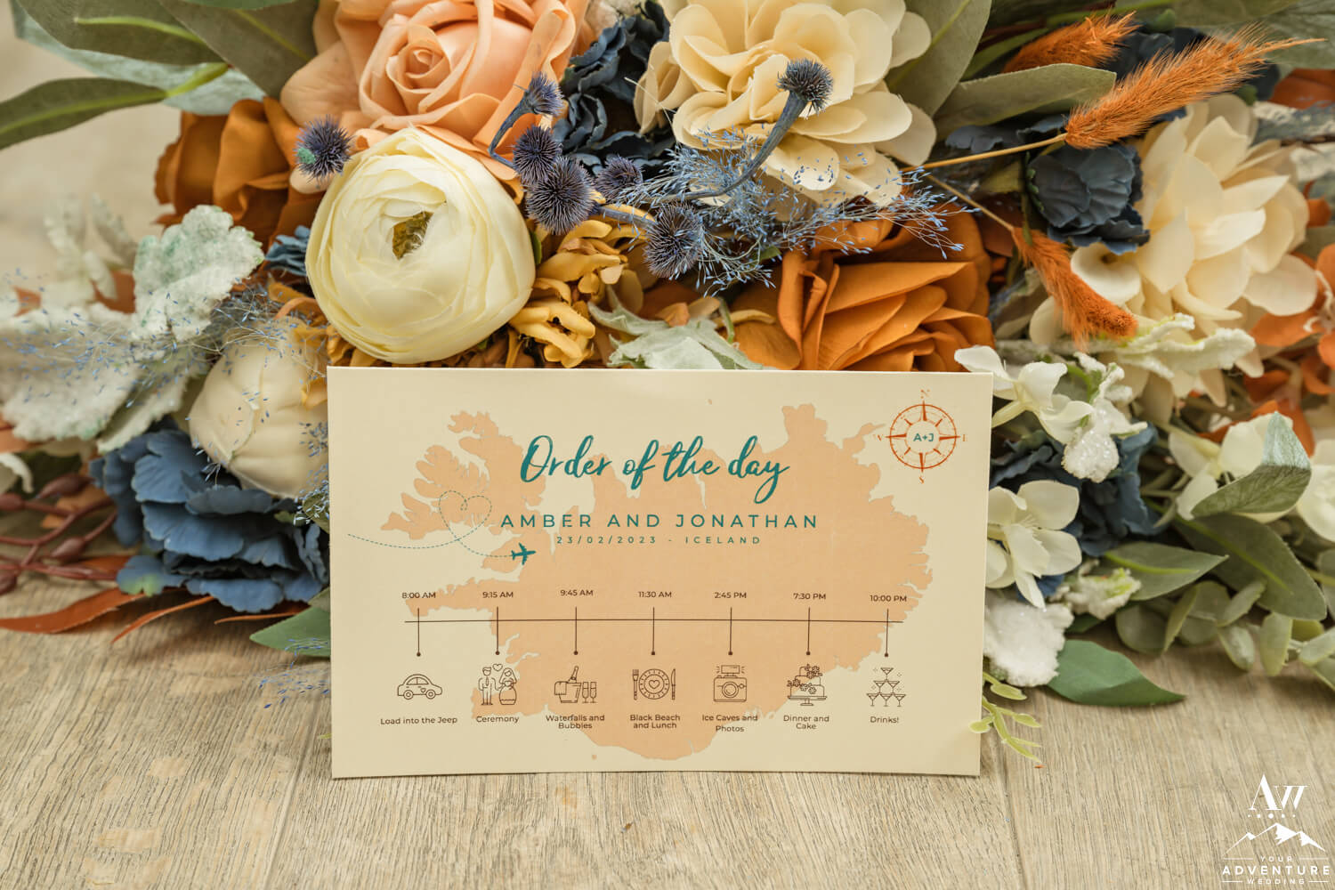 Our Iceland wedding hairstylist and photographer went to work capturing the abundant details. To illustrate, items like a fabulous wedding dress, groom details, vow books, etc! Also the pair surprised their guests with a welcome bag and timeline card, how fun right?!