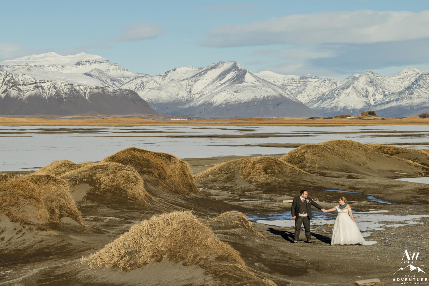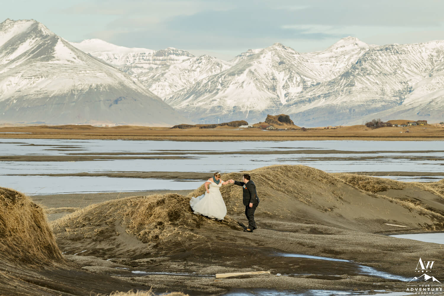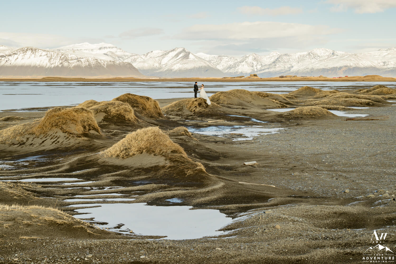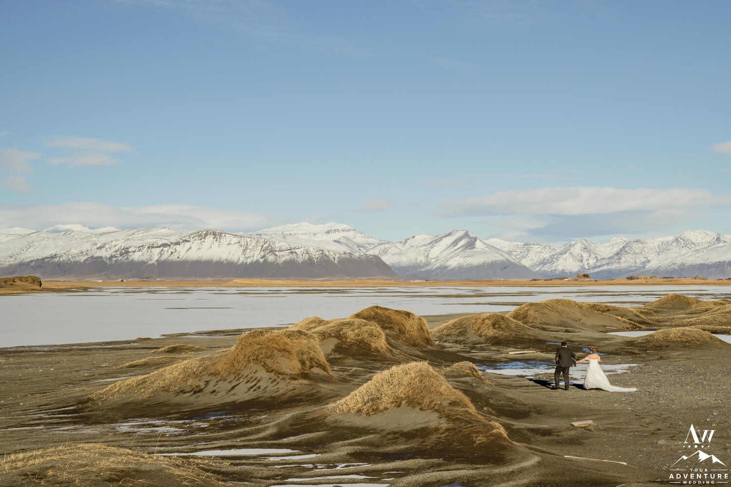 Next, while on the journey out from the frozen waterfall wedding ceremony location, we were lucky enough to spot reindeer! Meanwhile, the next Iceland wedding location was a black sand beach full of beautiful sand dunes, incredible mountain and glacier views! Which angle do you like more… From the drone or from the ground?