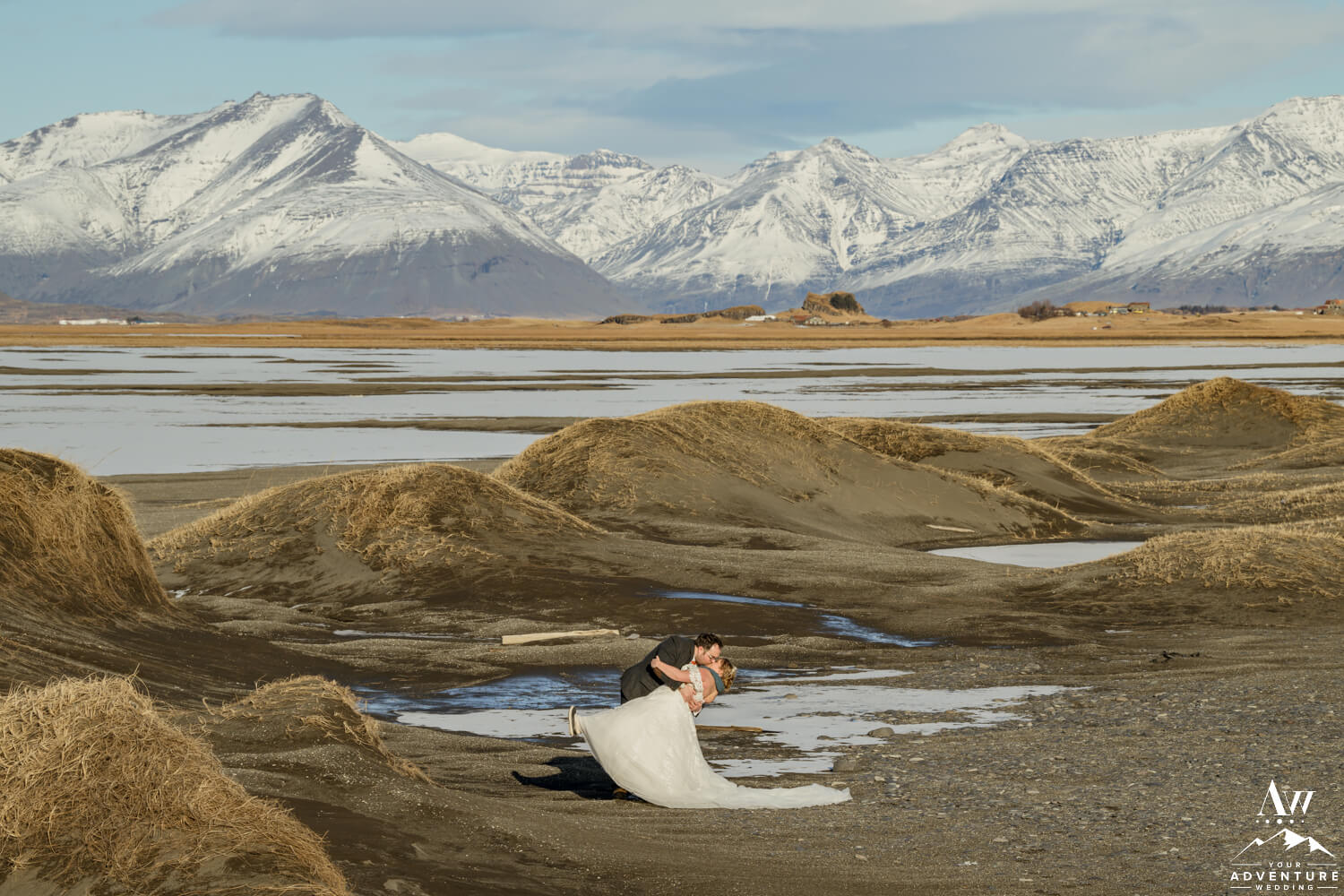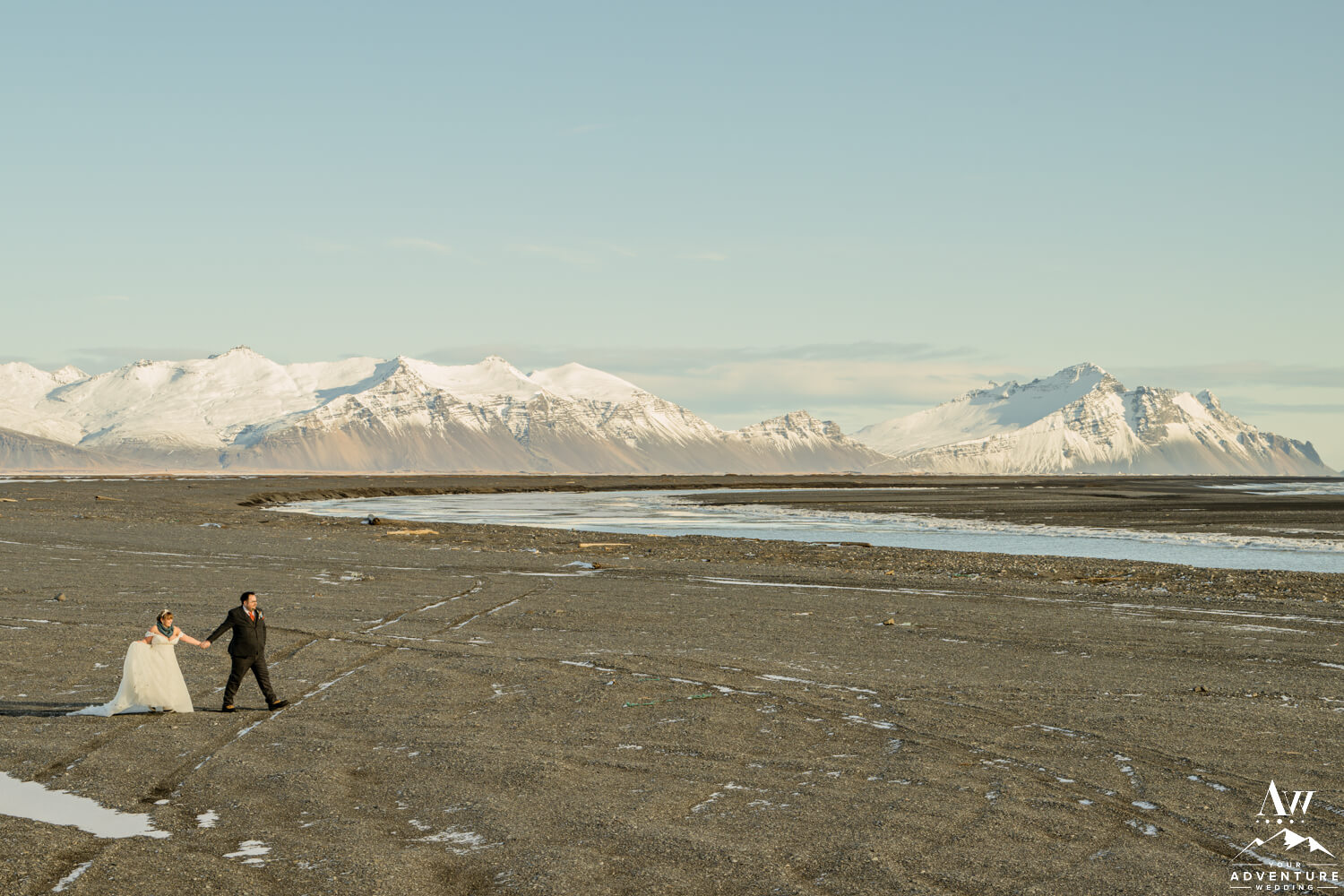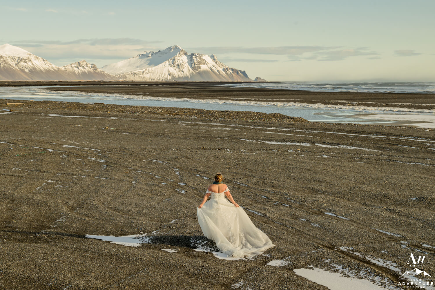 Next, while on the journey out from the frozen waterfall wedding ceremony location, we were lucky enough to spot reindeer! Meanwhile, the next Iceland wedding location was a black sand beach full of beautiful sand dunes, incredible mountain and glacier views! Which angle do you like more… From the drone or from the ground?