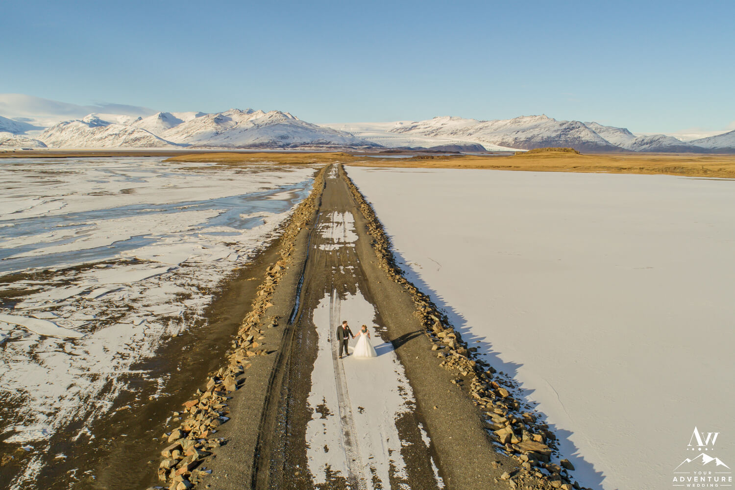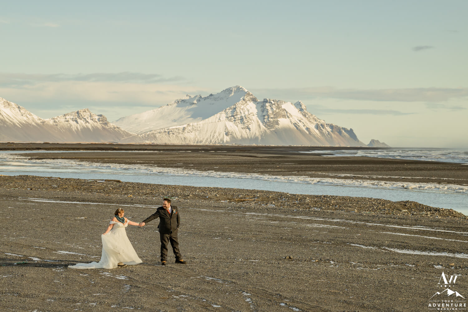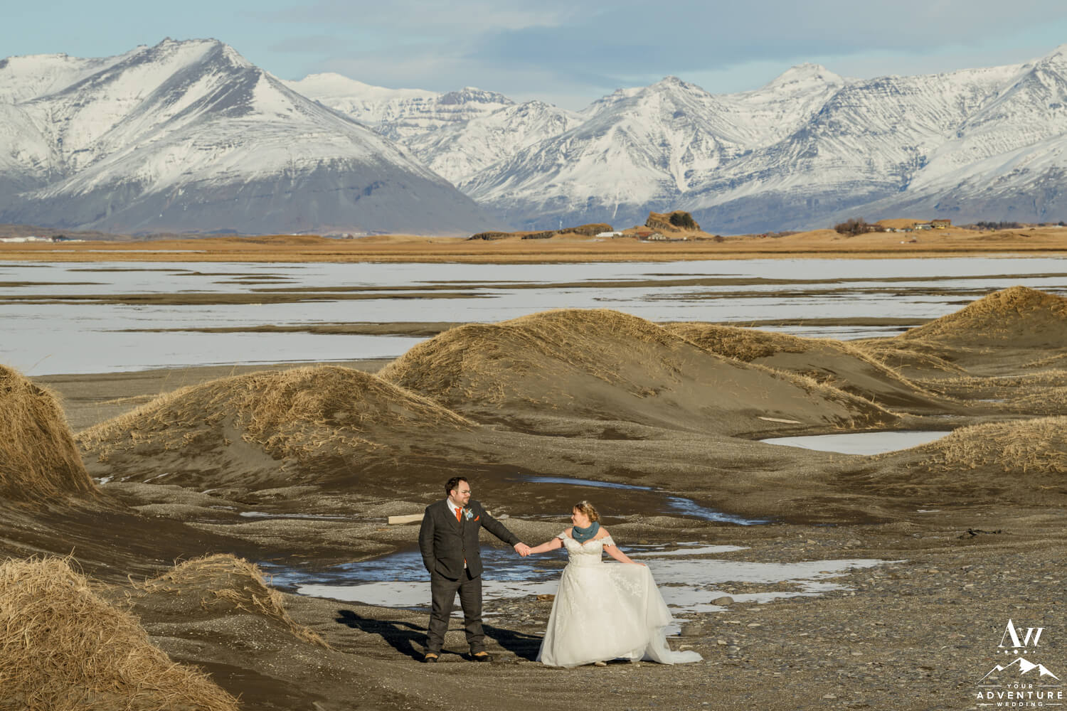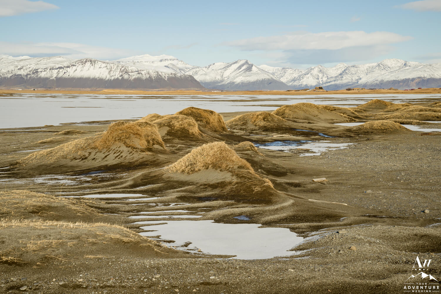 Next, while on the journey out from the frozen waterfall wedding ceremony location, we were lucky enough to spot reindeer! Meanwhile, the next Iceland wedding location was a black sand beach full of beautiful sand dunes, incredible mountain and glacier views! Which angle do you like more… From the drone or from the ground?