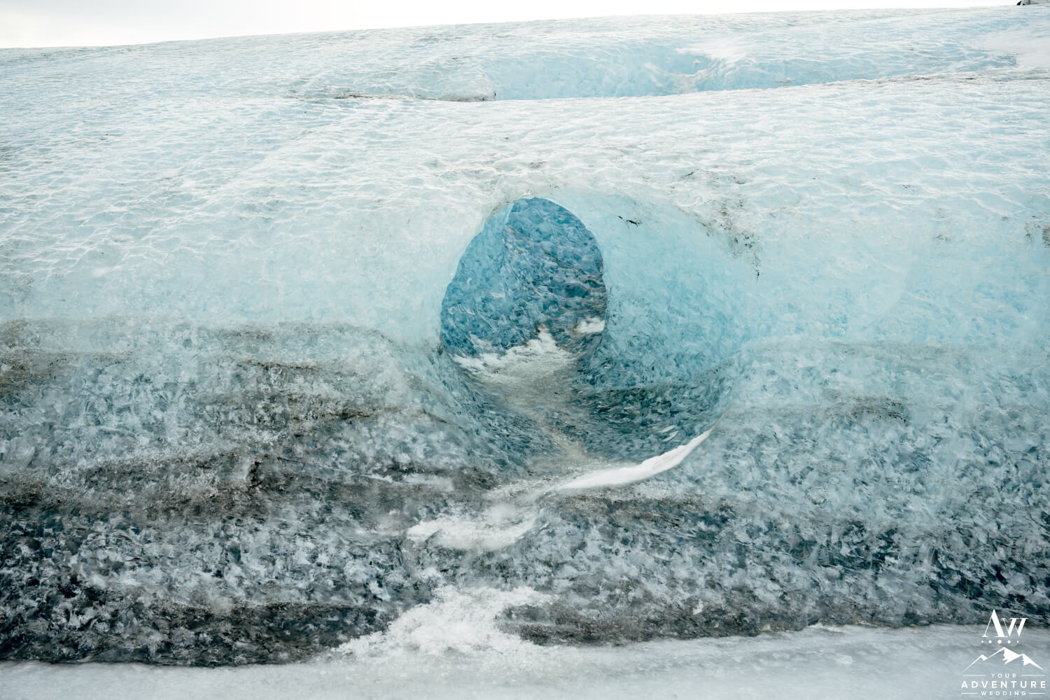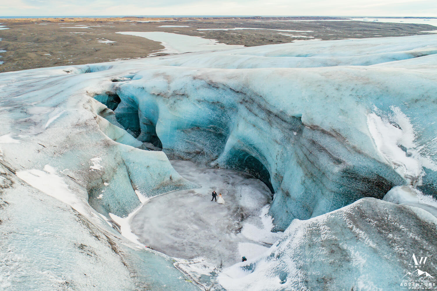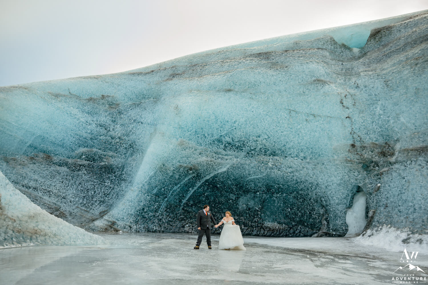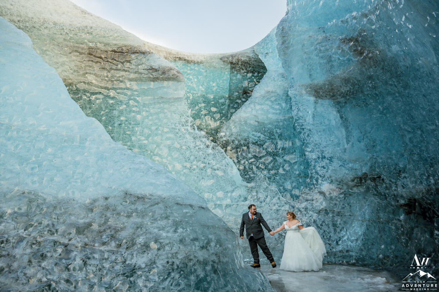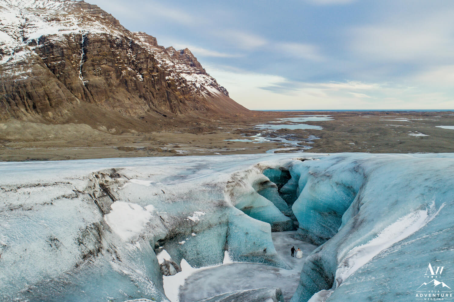 Is it possible that a glacier sinkhole (or moulin) can be more exciting than an ice cave? But know a sinkhole is a type of ice cave we have in Iceland. Allow our adventurous frozen waterfall wedding newlyweds and local Iceland wedding photographer to show you the unforgettable beauty…