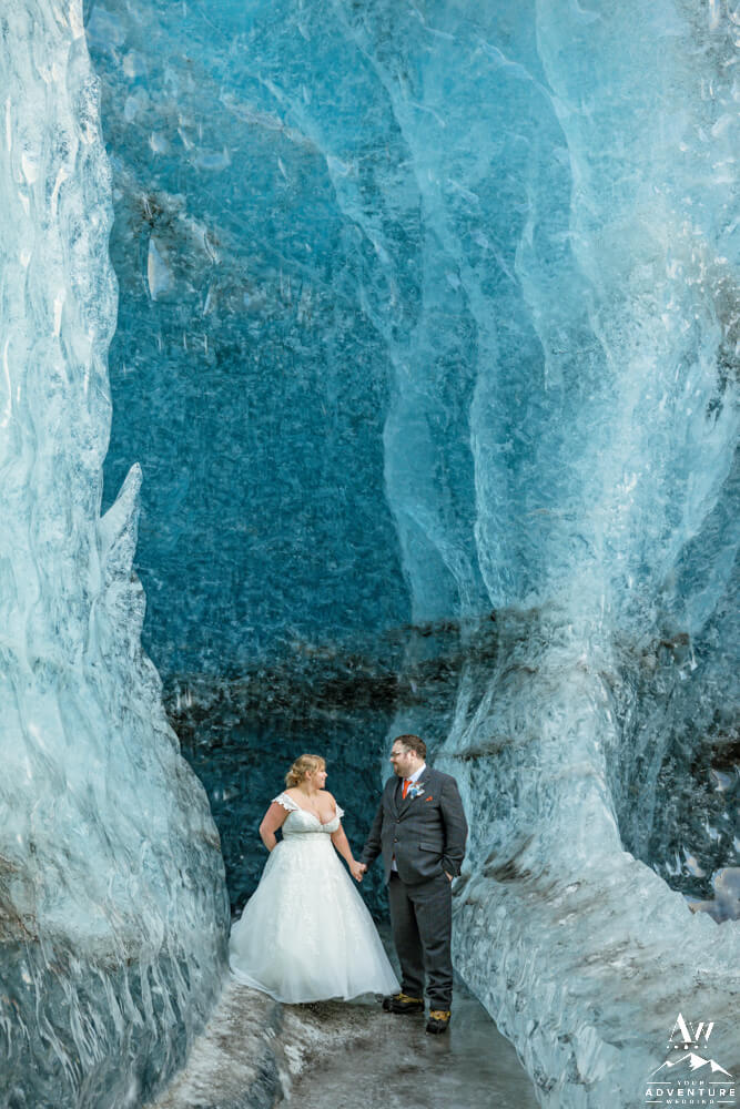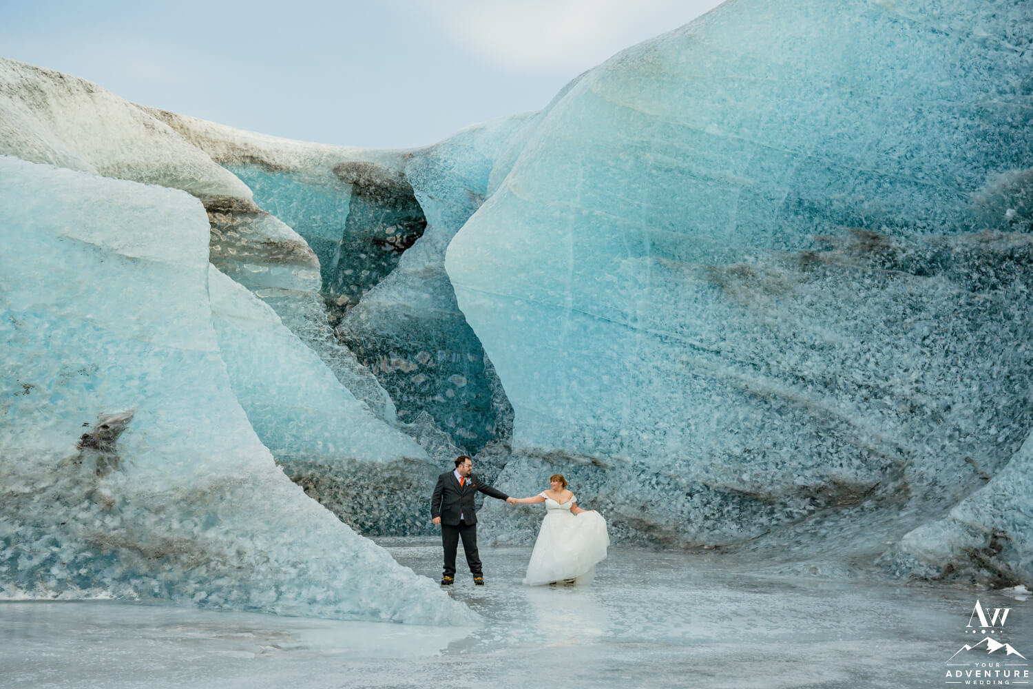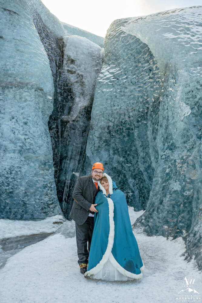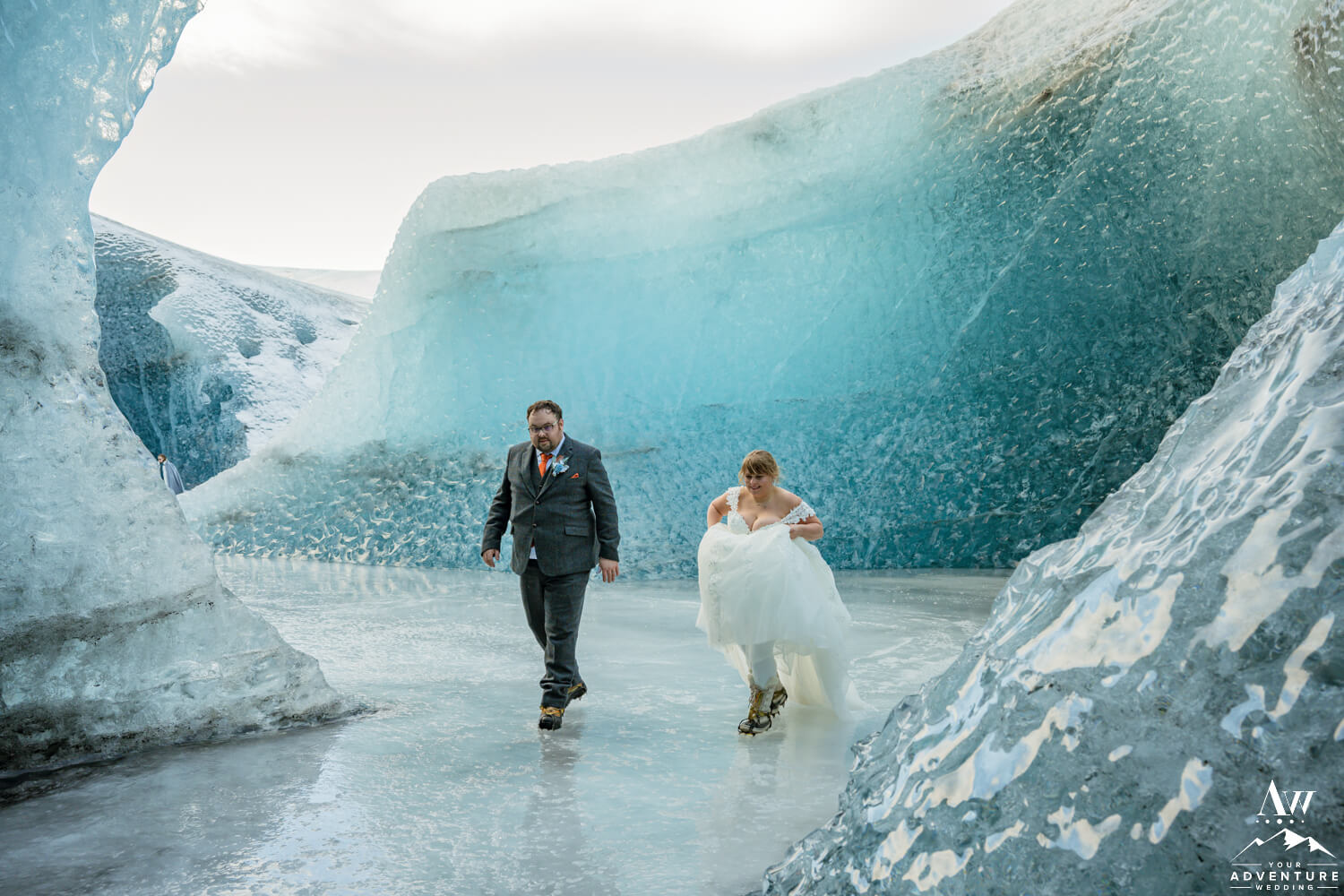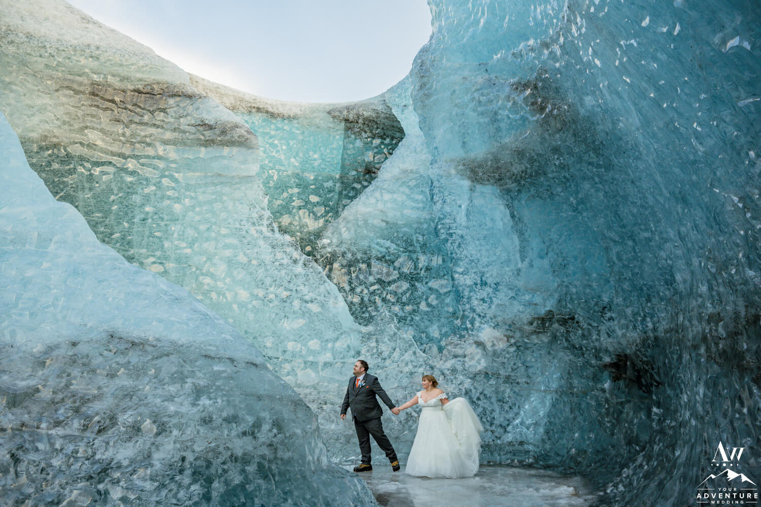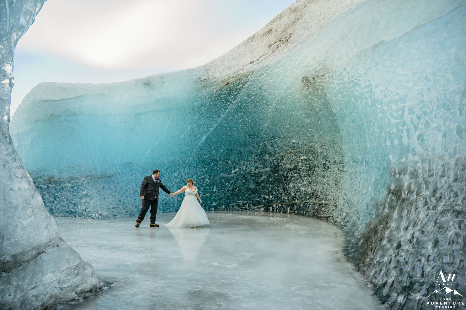 Is it possible that a glacier sinkhole (or moulin) can be more exciting than an ice cave? But know a sinkhole is a type of ice cave we have in Iceland. Allow our adventurous frozen waterfall wedding newlyweds and local Iceland wedding photographer to show you the unforgettable beauty…