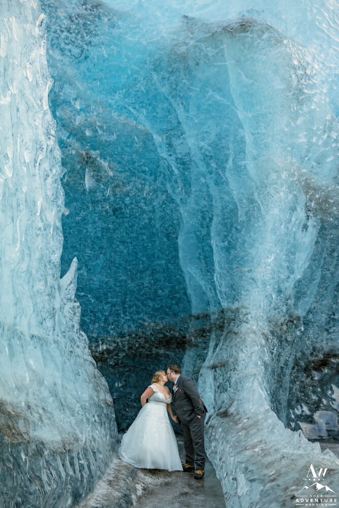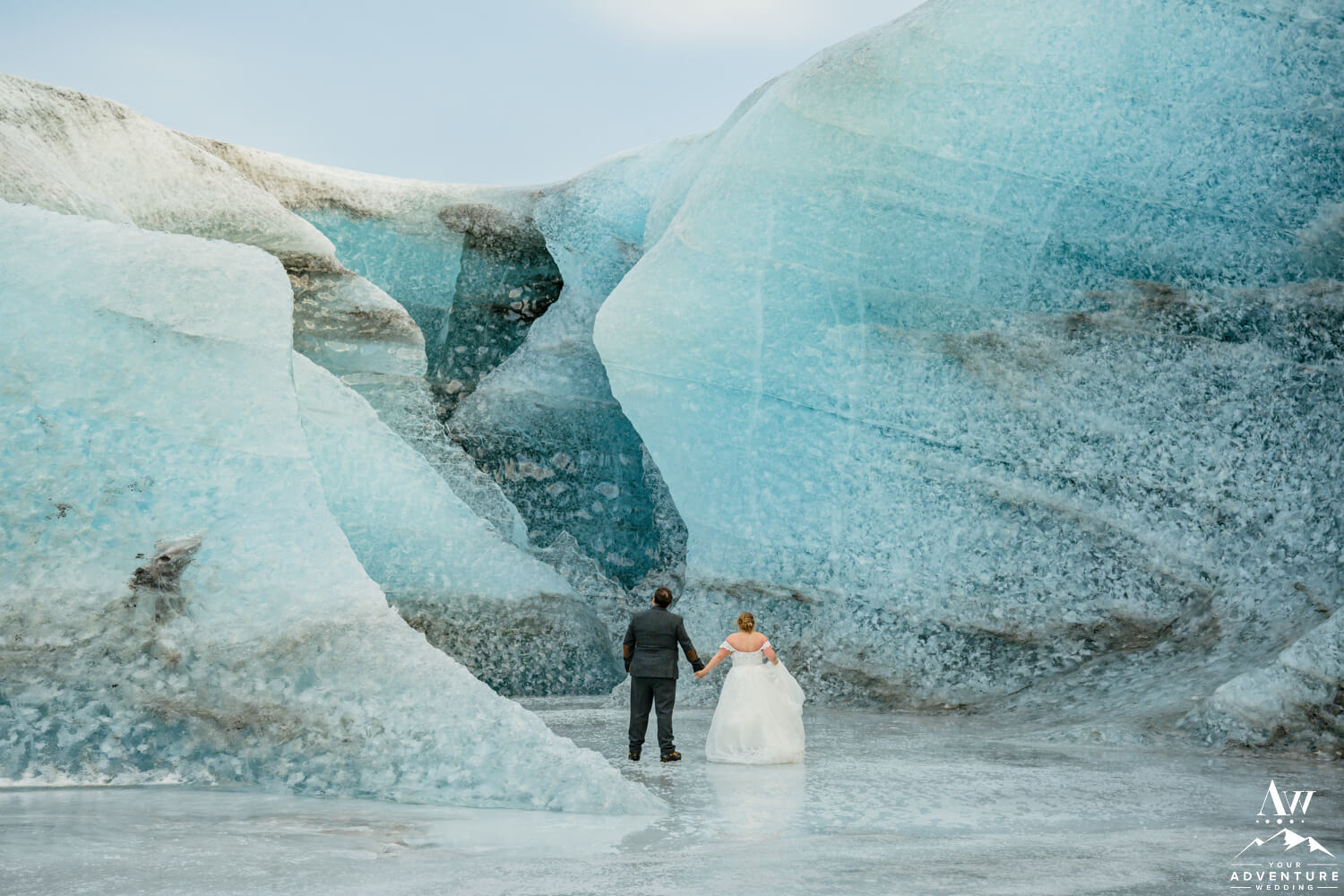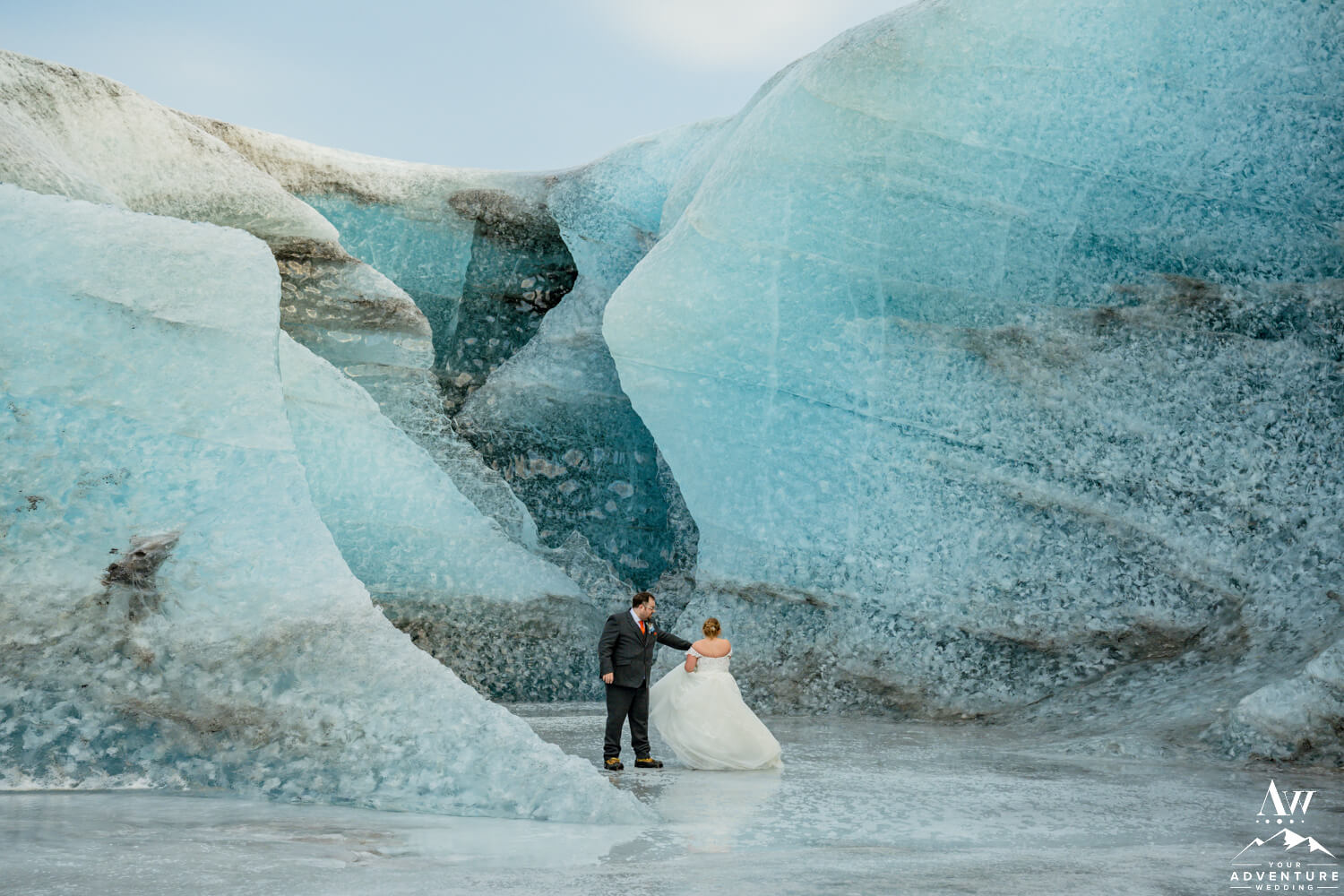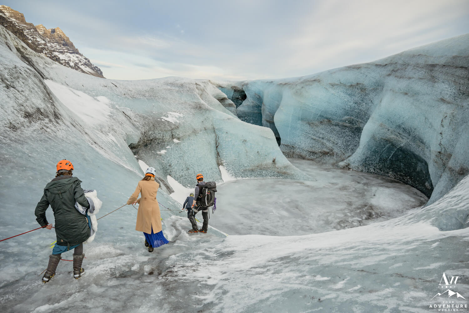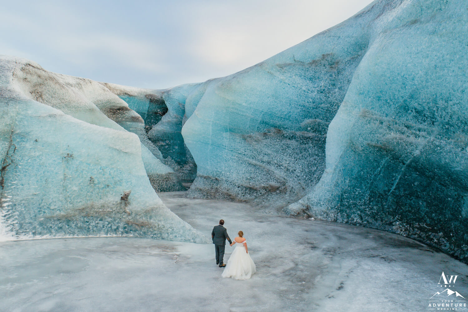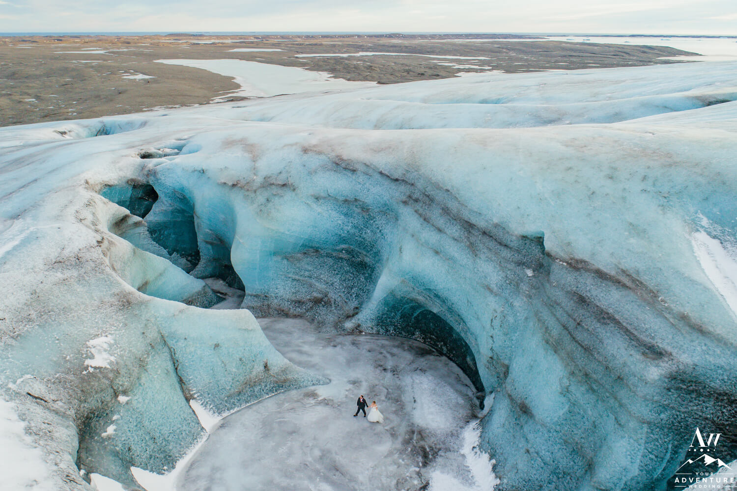 Is it possible that a glacier sinkhole (or moulin) can be more exciting than an ice cave? But know a sinkhole is a type of ice cave we have in Iceland. Allow our adventurous frozen waterfall wedding newlyweds and local Iceland wedding photographer to show you the unforgettable beauty…