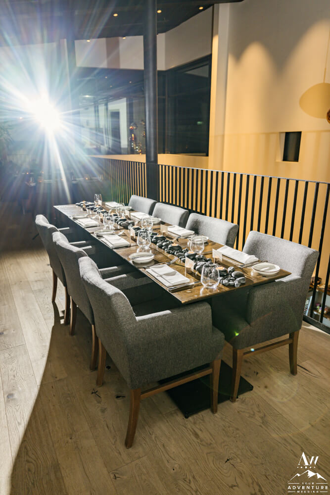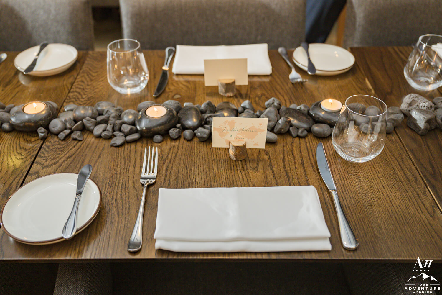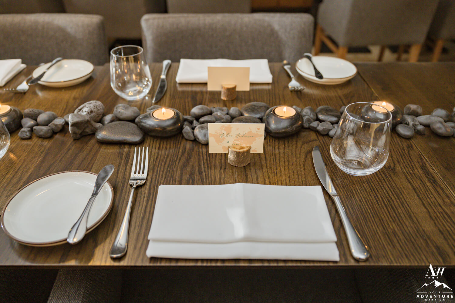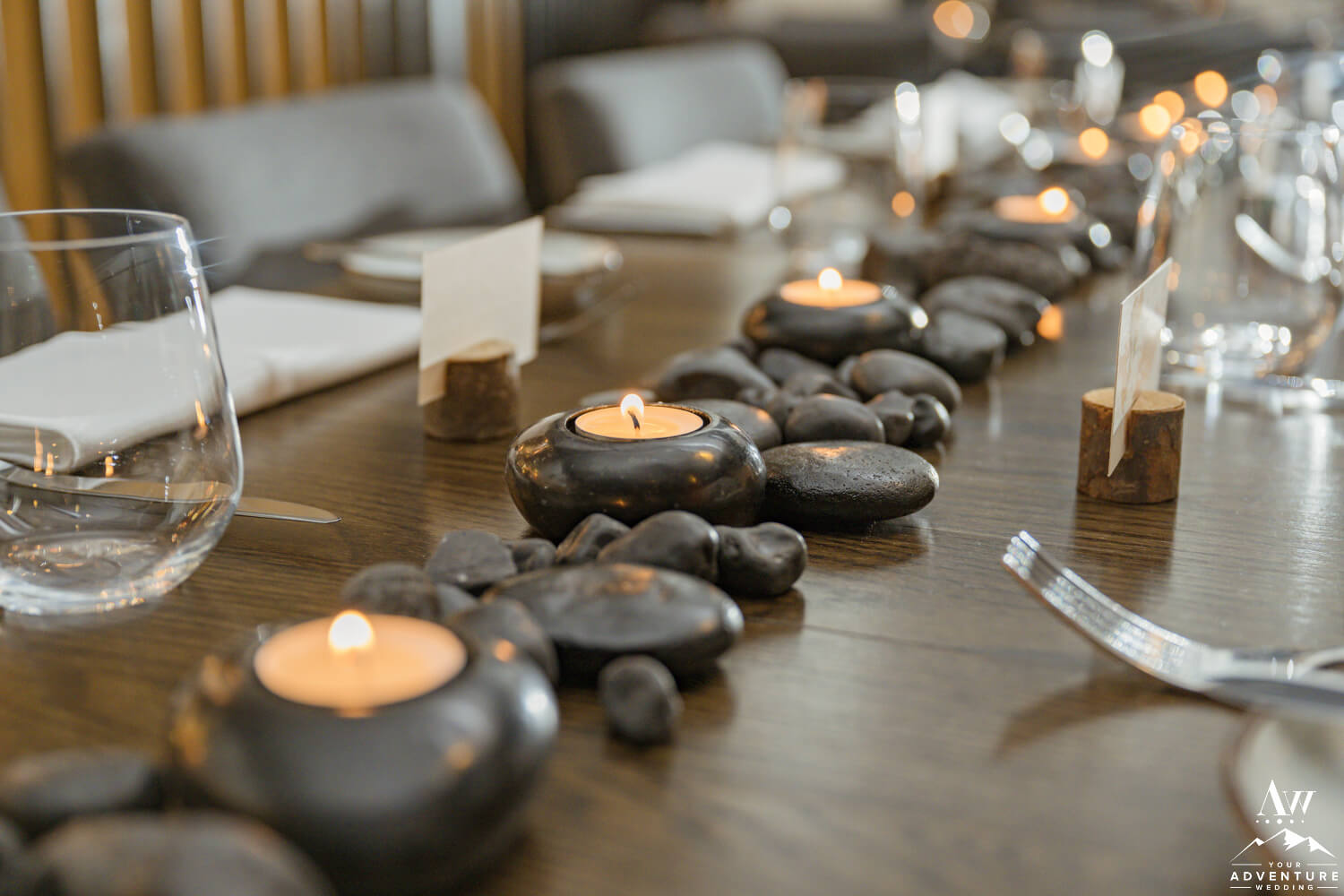 Long after the sun set the Iceland wedding group arrived back to the Fosshotel Glacier Lagoon. After 30 or so minutes of rest and refresh time they gathered again for a delicious dinner. Furthermore, you’ll see that their wonderful table décor is from our rental collection. And how lovely is that basalt rock table runner with matching tealights?!