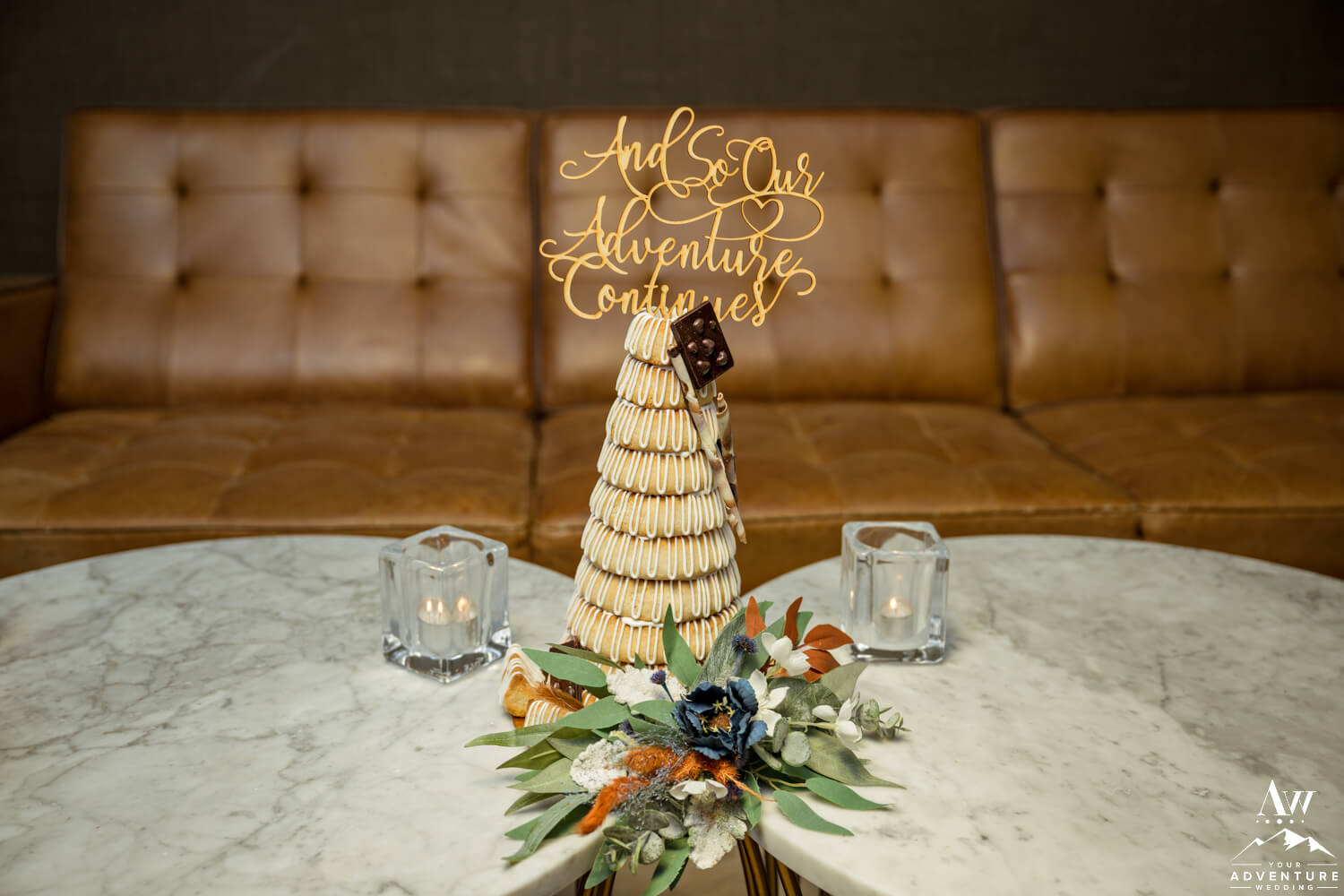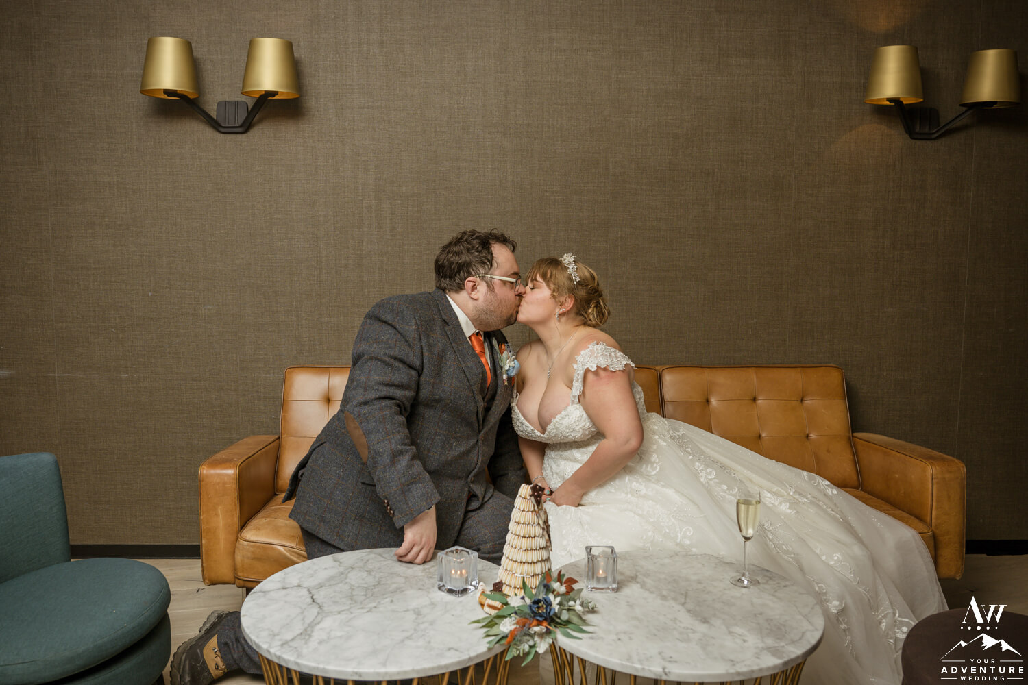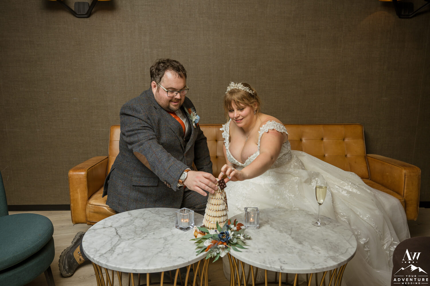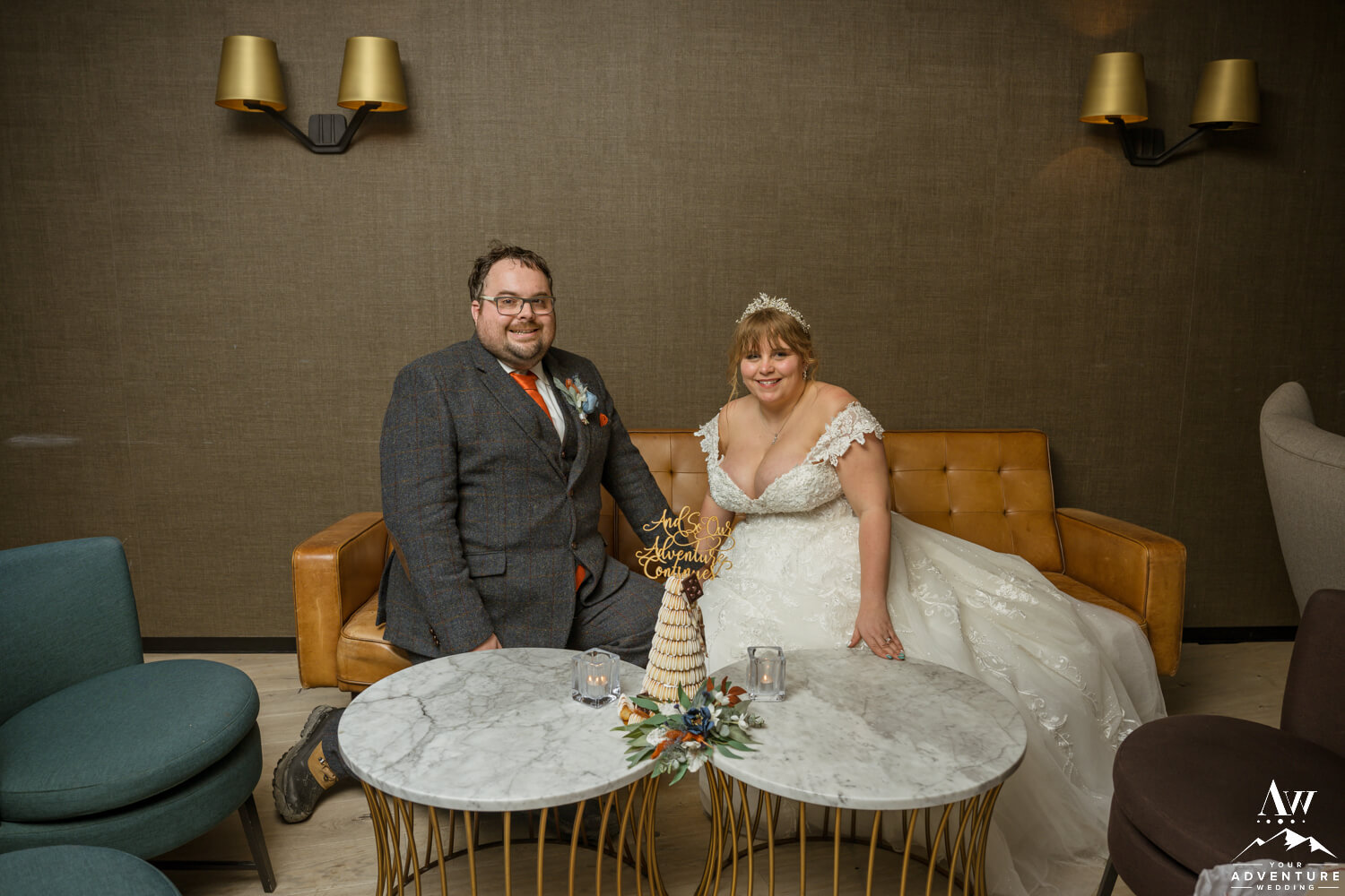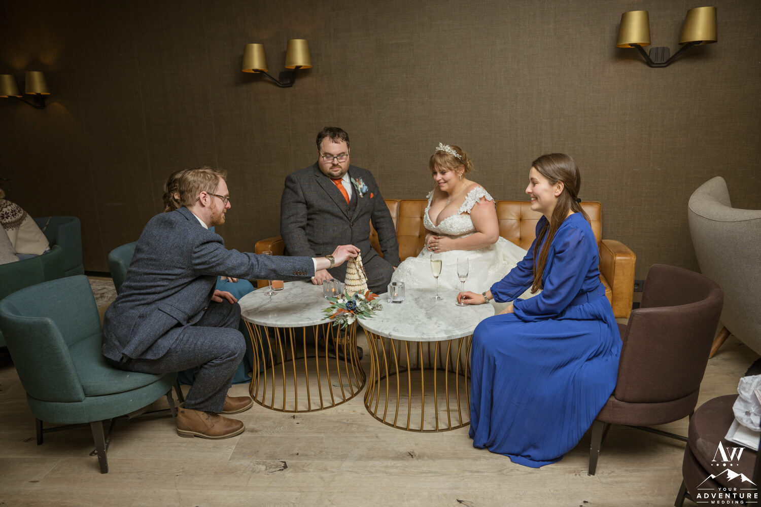 Concluding their evening meal after the frozen waterfall wedding adventure the group gathered in the lobby bar area. Why? Well for the Iceland wedding cake tradition! But wait, that’s not all that happened…