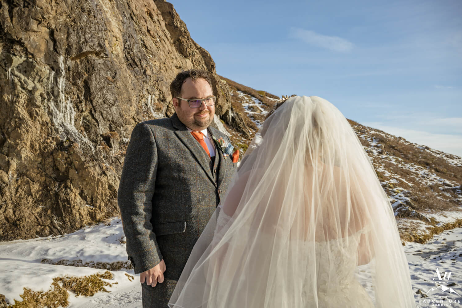 Shortly before the crew grabbed their adventure wedding go bags, and loaded into the super jeep to embark on the frozen waterfall wedding… Amber and Jonathan shared a few quite moments doing a first look!