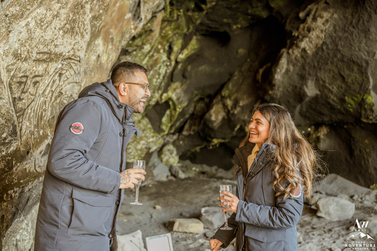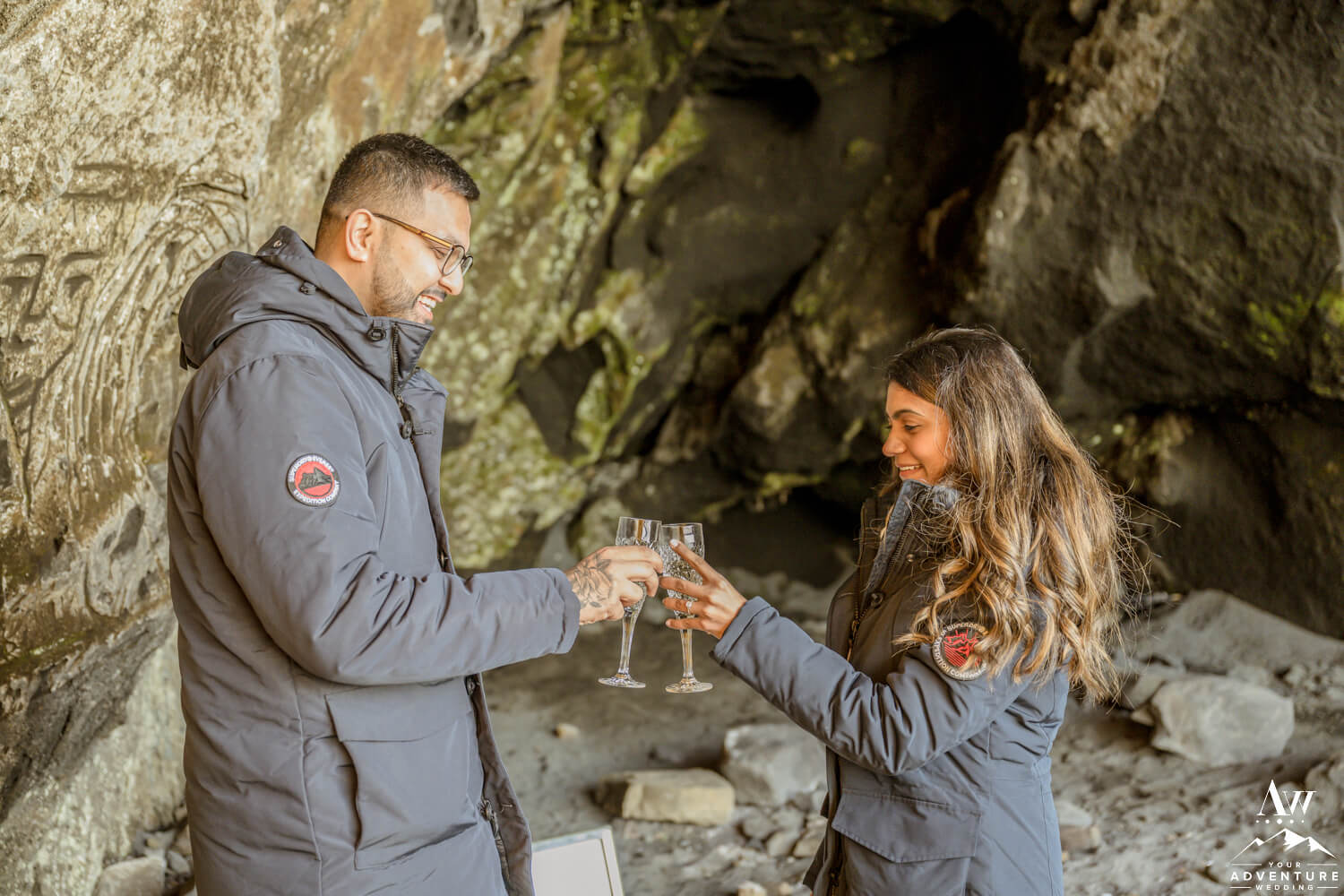 Mukund came to our Iceland Wedding Planner team in hopes of planning an adventurous private proposal. Him and his soon to be fiancée Jinkal were visiting Iceland for a few days in November last year. And if you know anything about the winter months in Iceland, the weather can be nuts! Also, it can look like sunrise or sunset light all day. You know the kind that is all warm and glowy. And these two got lucky with a day that was full of the last for their cave proposal in Iceland!