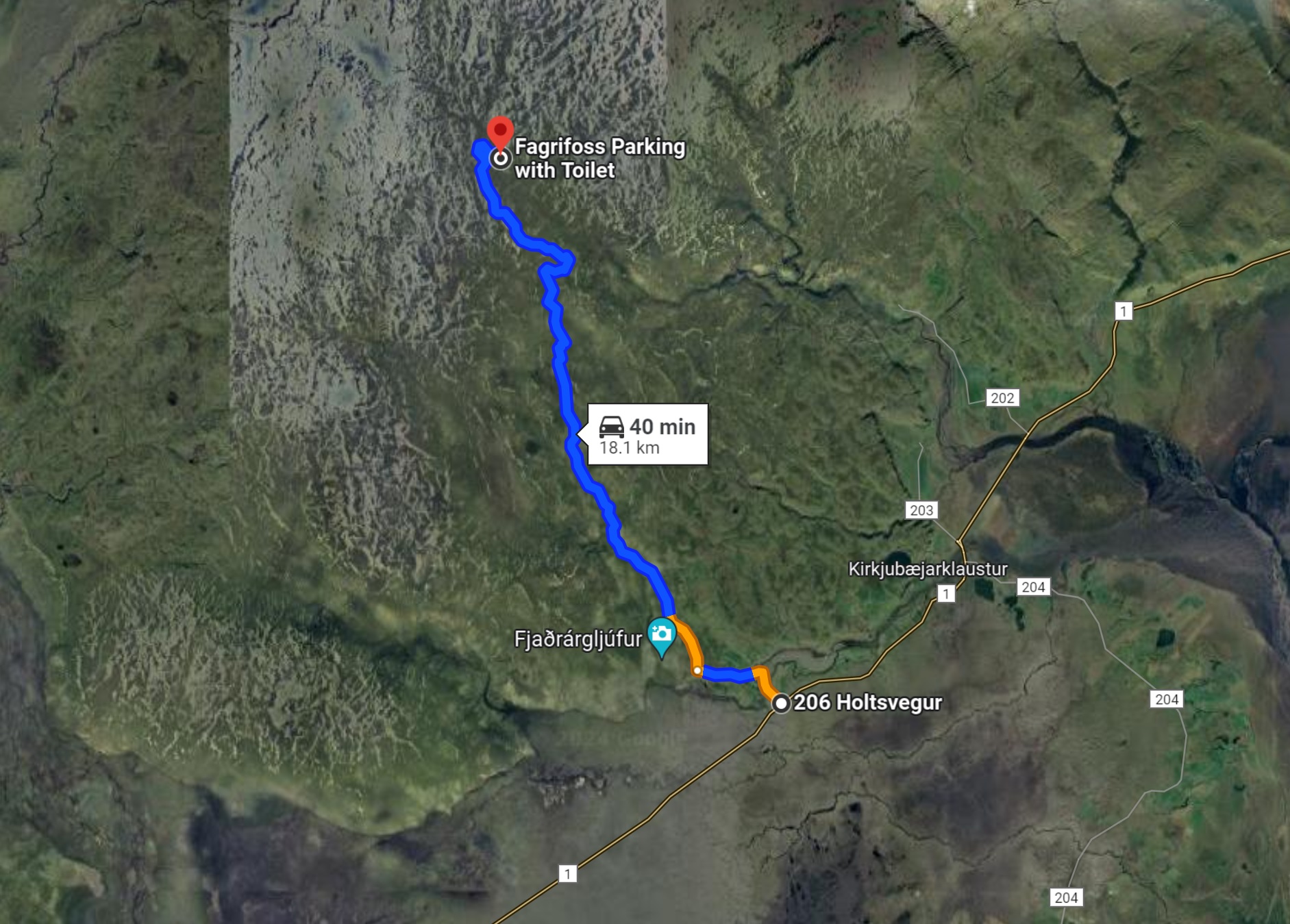 From Route 1 Fagrifoss is approximately a 40-60 minute detour one way plus however long you wish to spend there. Well worth the stop to experience this offbeat highland waterfall. Next, if you’re coming from the West heading East you’ll turn LEFT onto Route #206 which is also referred to as Holtsvegur. Follow the road back about 2.3km. Additionally, follow the below photos for more step by step directions to guide you to Fagrifoss…