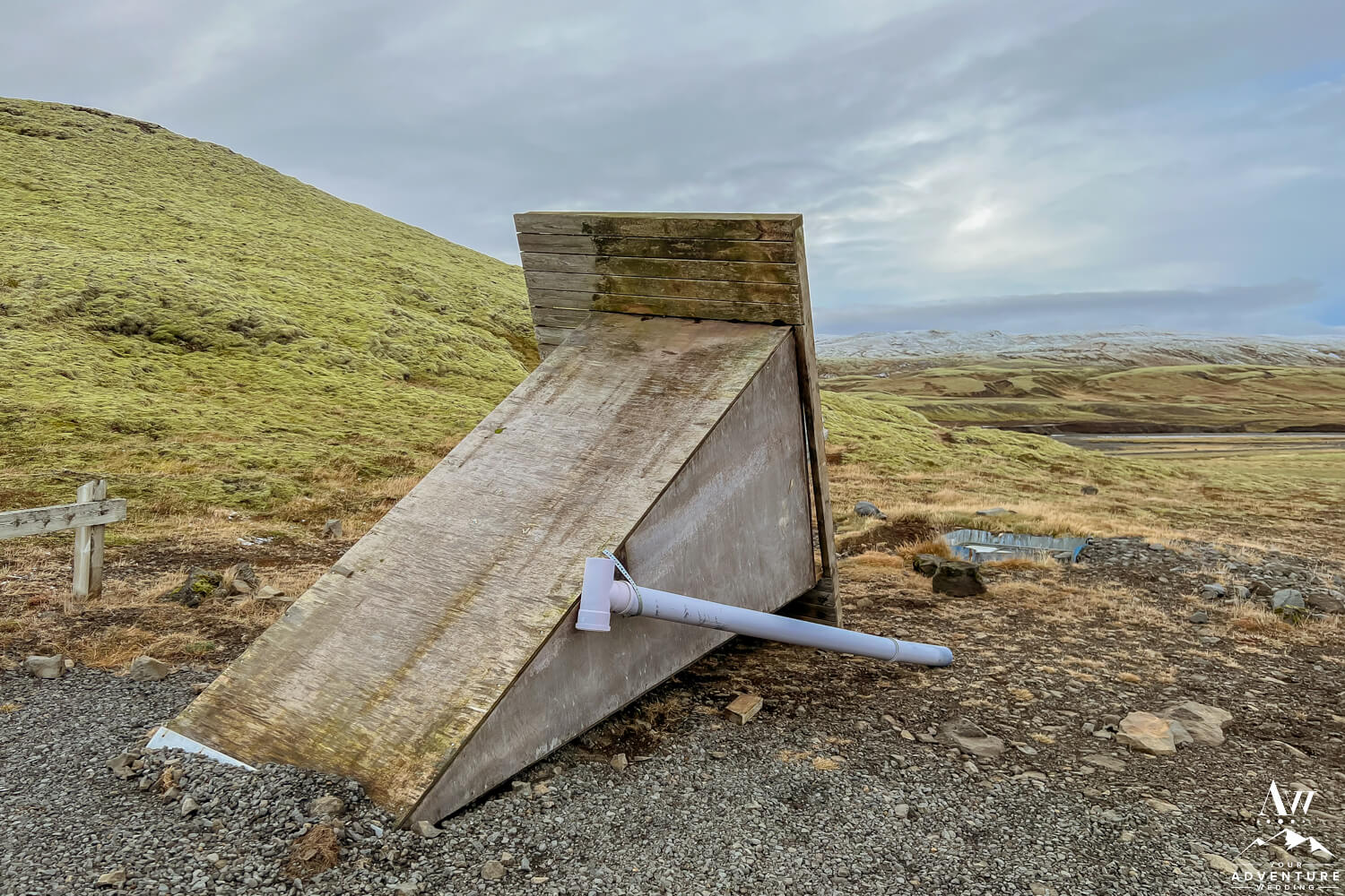 - Normally the outhouse at Fagrifoss is upright but we had visited in November after a storm had likely pushed it over.