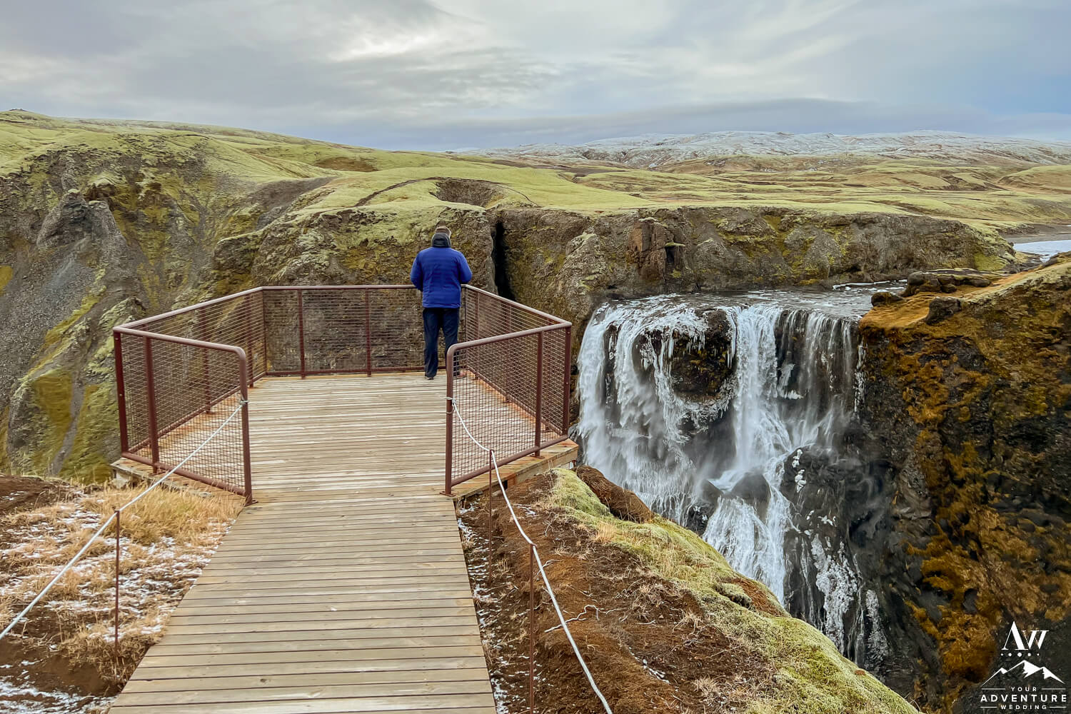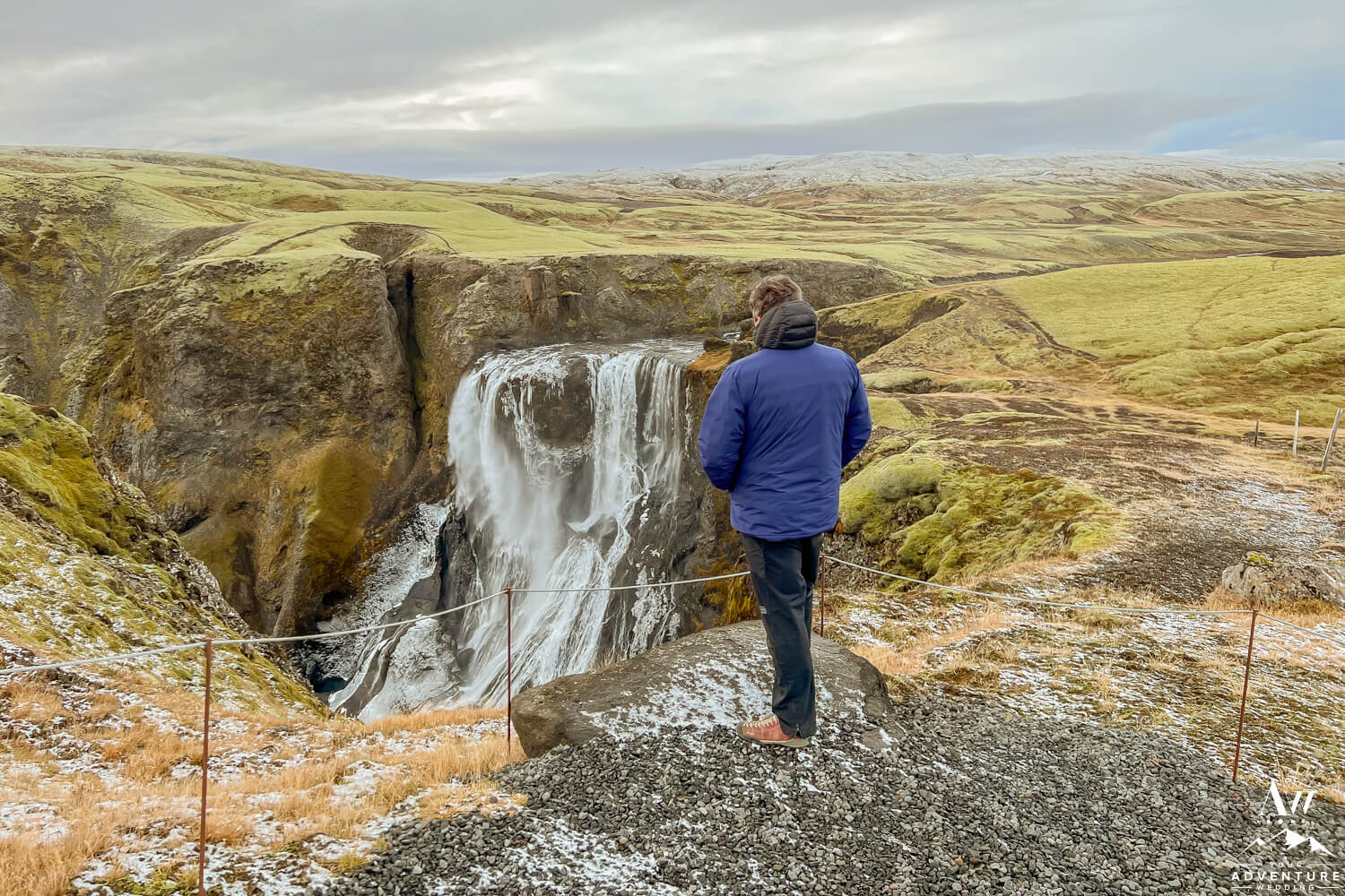 - Hiker on the Fagrifoss Waterfall Viewing Platform.