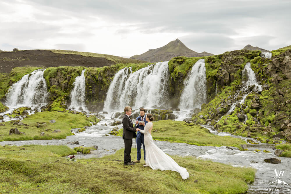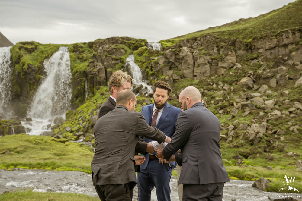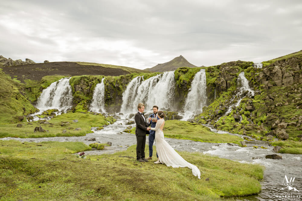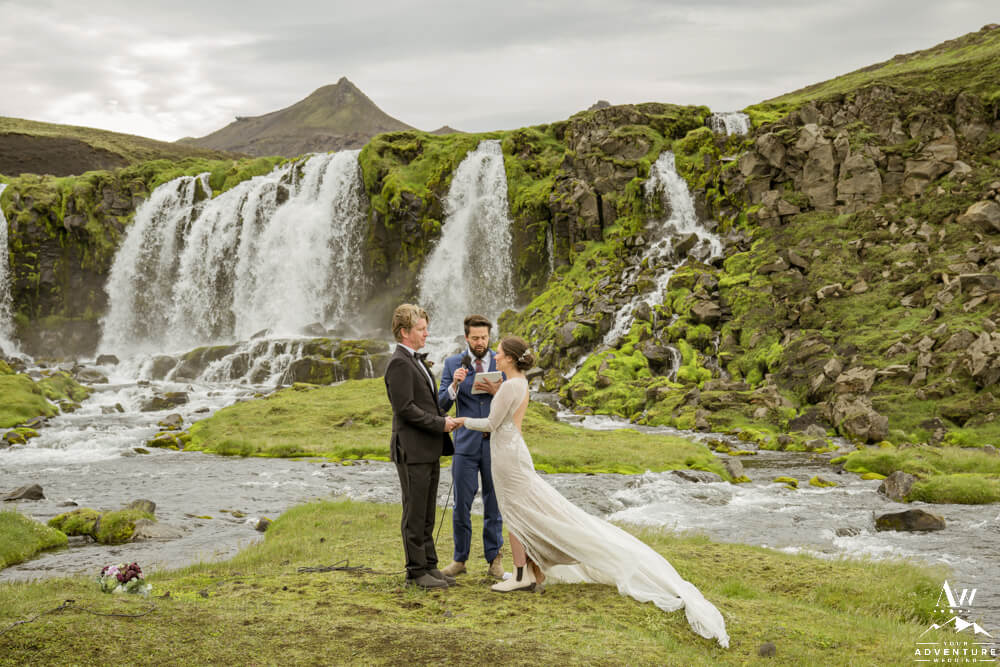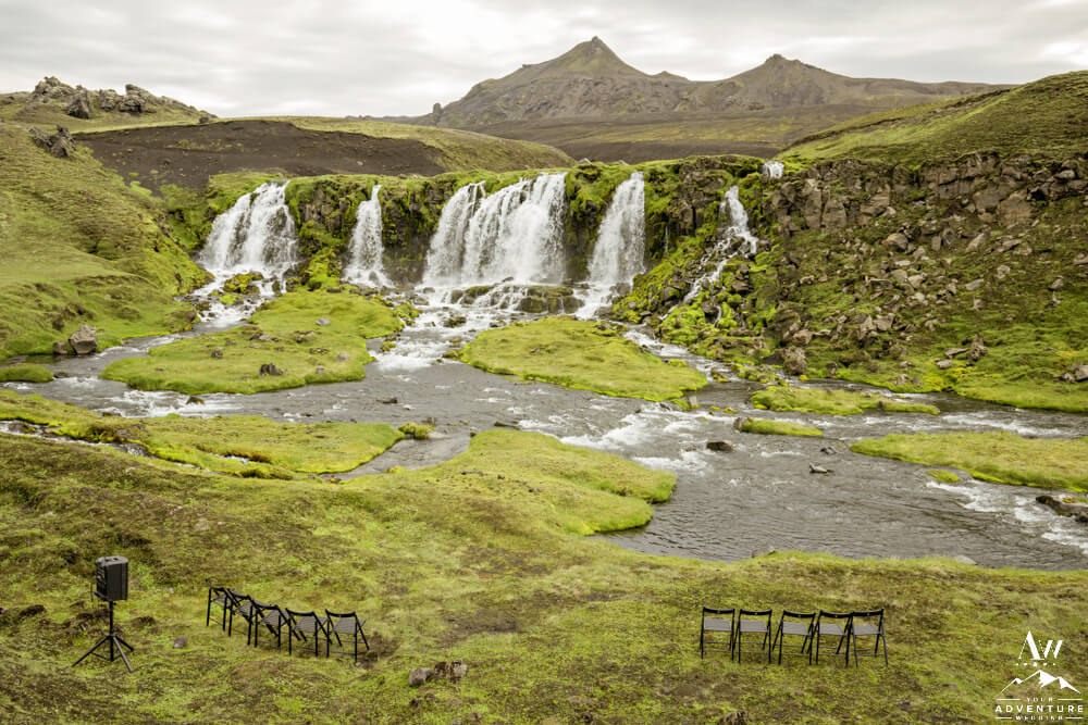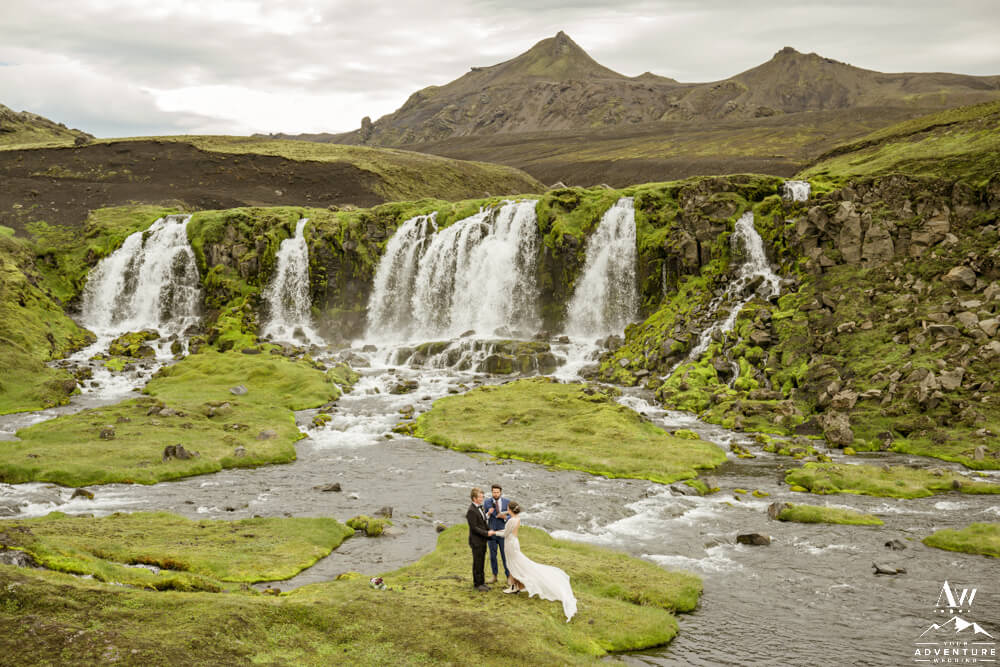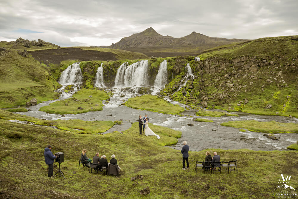 Next, the group ventured into the Iceland highlands for an exciting drive to the Summer waterfall wedding ceremony location! On arrival, the group was in complete awe over the beauty of the waterfall. After our Iceland Wedding Planner team setup the ceremony the guests took their seats.