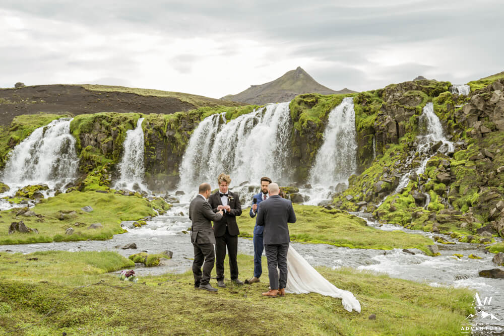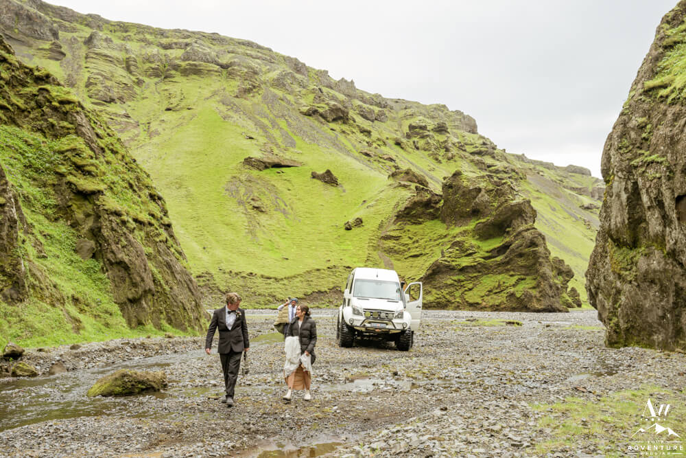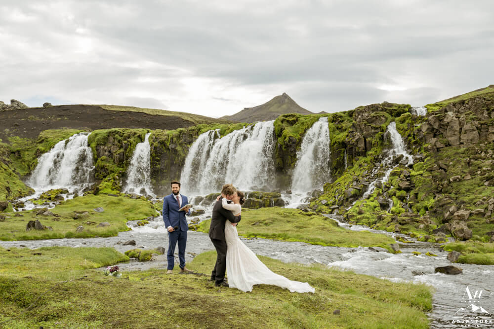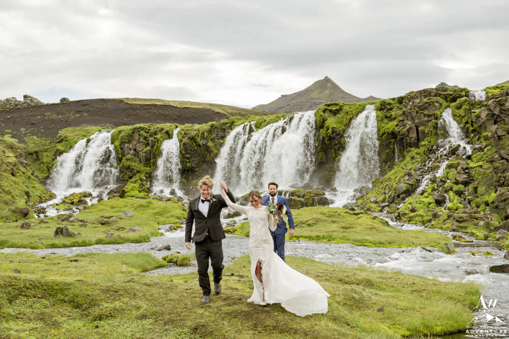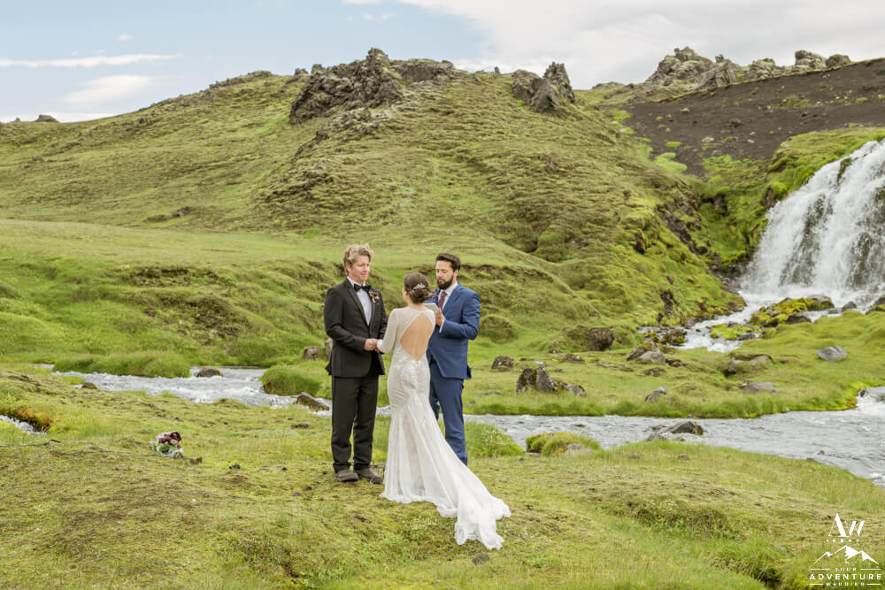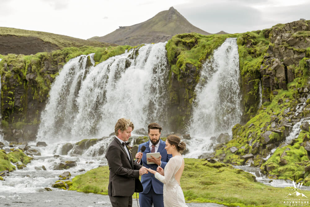 Next, the group ventured into the Iceland highlands for an exciting drive to the Summer waterfall wedding ceremony location! On arrival, the group was in complete awe over the beauty of the waterfall. After our Iceland Wedding Planner team setup the ceremony the guests took their seats.