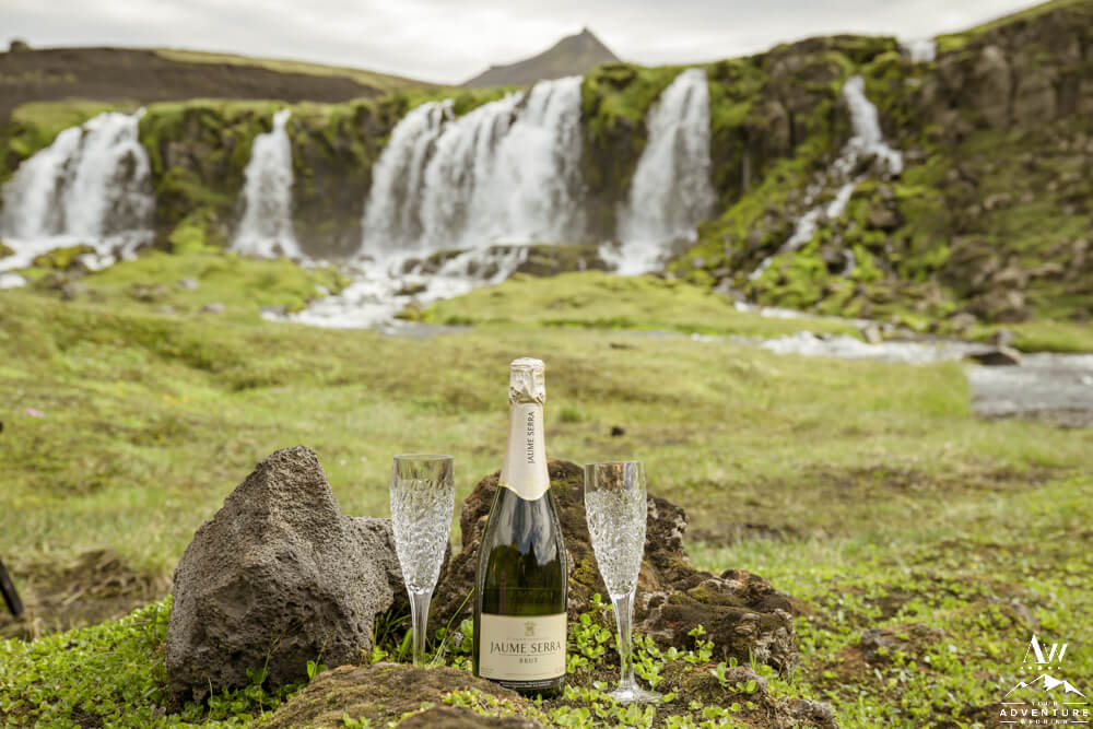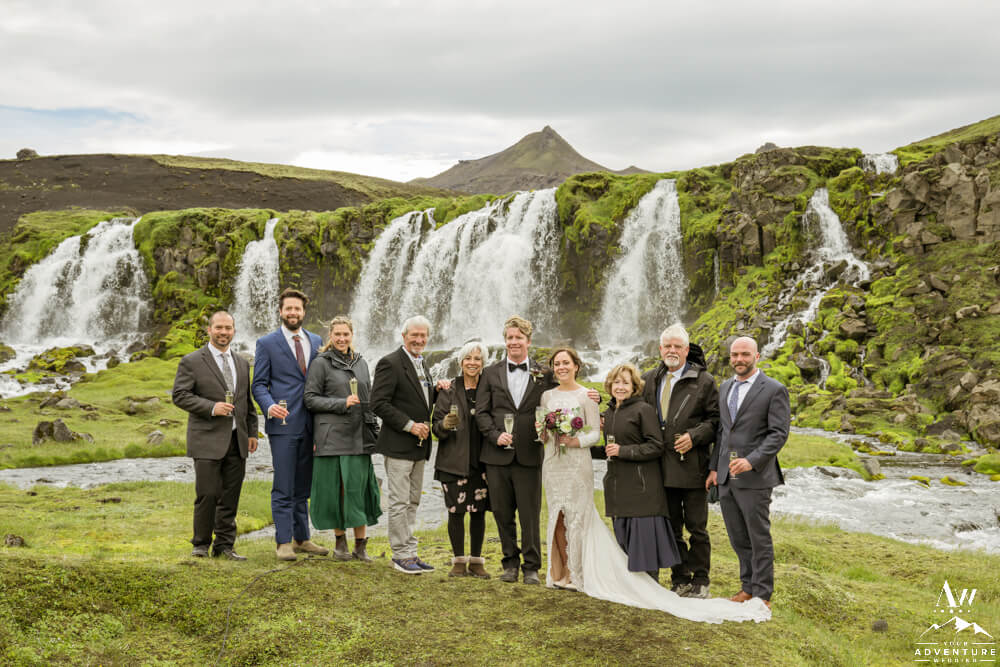 Following the ceremony, bubbles were shared with a sweet toast to the newlyweds. Our Iceland wedding photographer captured all of the family and friends compositions. After, the newlyweds enjoyed a tiny bit of alone time by exploring the waterfall all around it. And how stunning are their Summer waterfall wedding photos?!