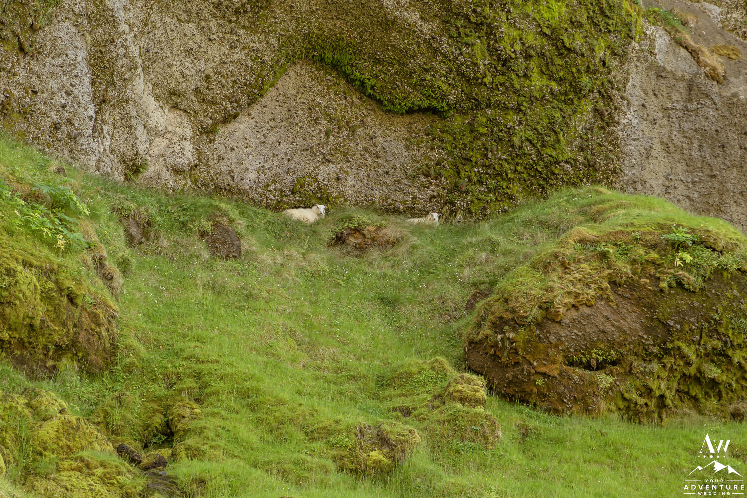 - Sheep relaxing within Stigafoss Canyon.