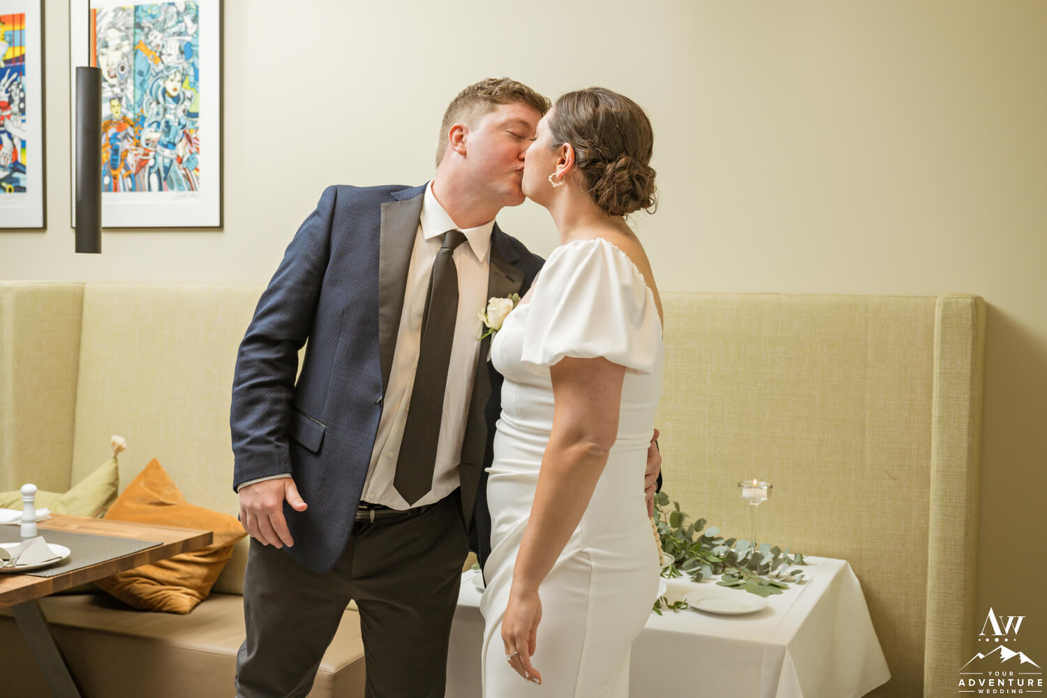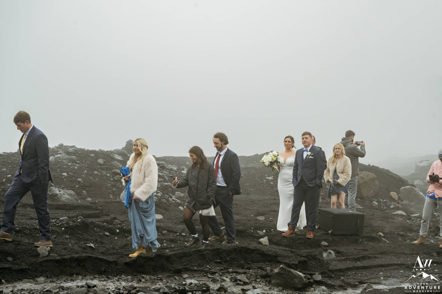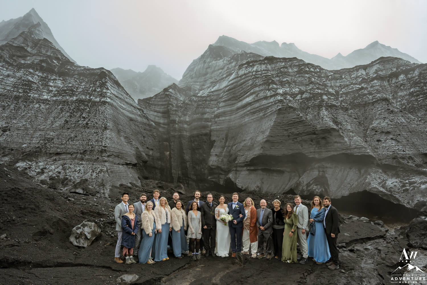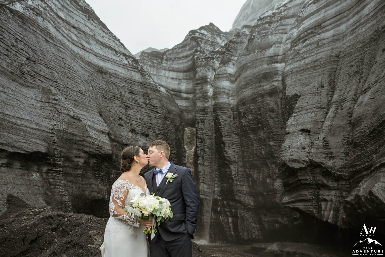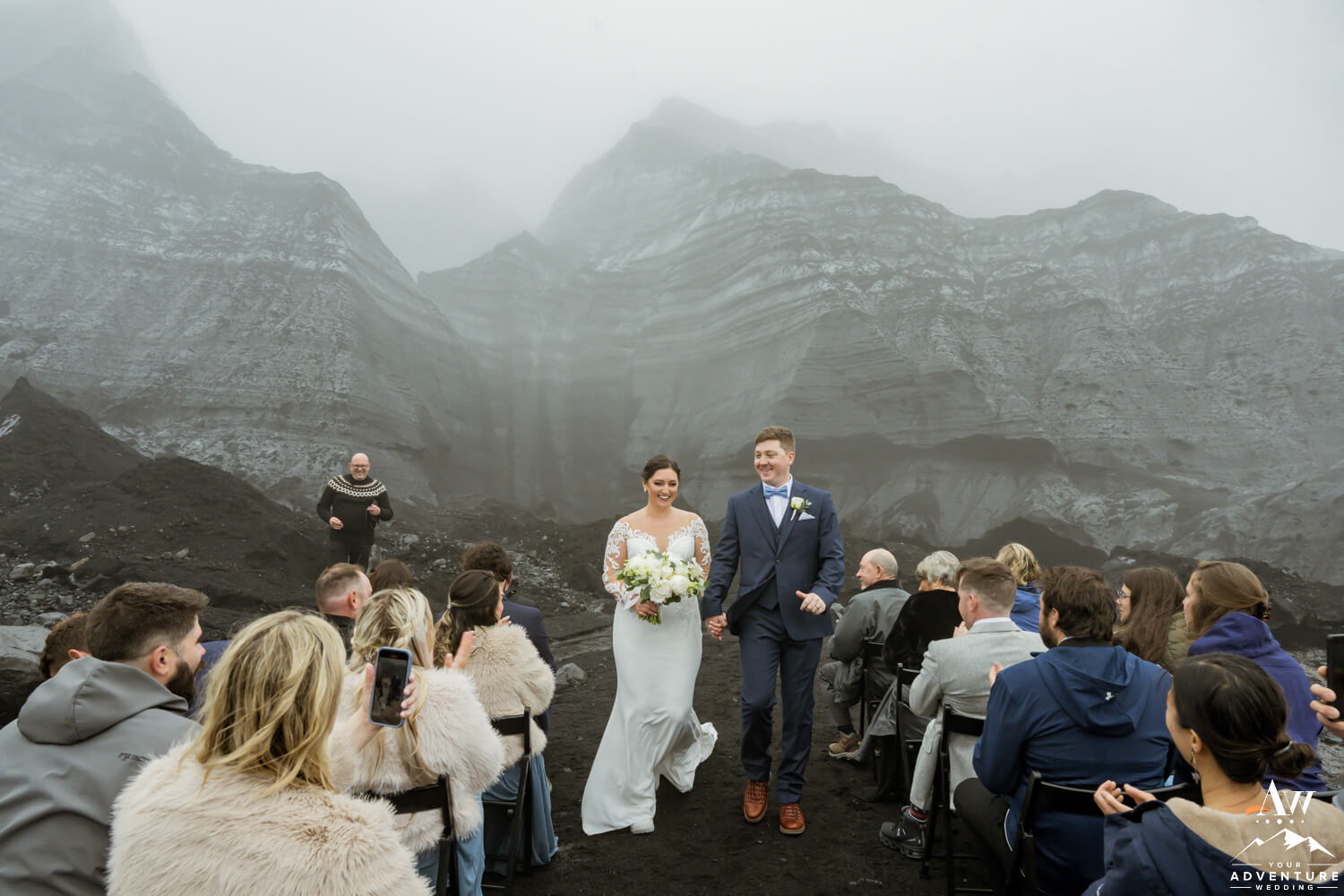 Once their ~20 guests settled into their seats and the couple took to the front in front of the glacier waterfall, fog rolled in. Honestly, it made their June glacier wedding ceremony feel like we were on a completely different planet! The pair exchanged rings and a kiss making them newlyweds!