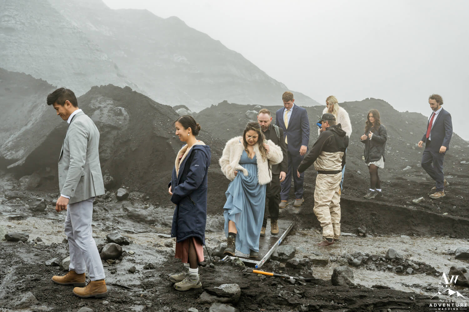 No matter the time of year, heading up to an offbeat glacier outlet is a journey. Which is perfect for the experience driven wedding Justin and Jessica desired. After turning off the main road, the adventure elevated. Guests had no idea where they were going but trusted it was somewhere epic since they’ve come to celebrate Justin and Jessica.