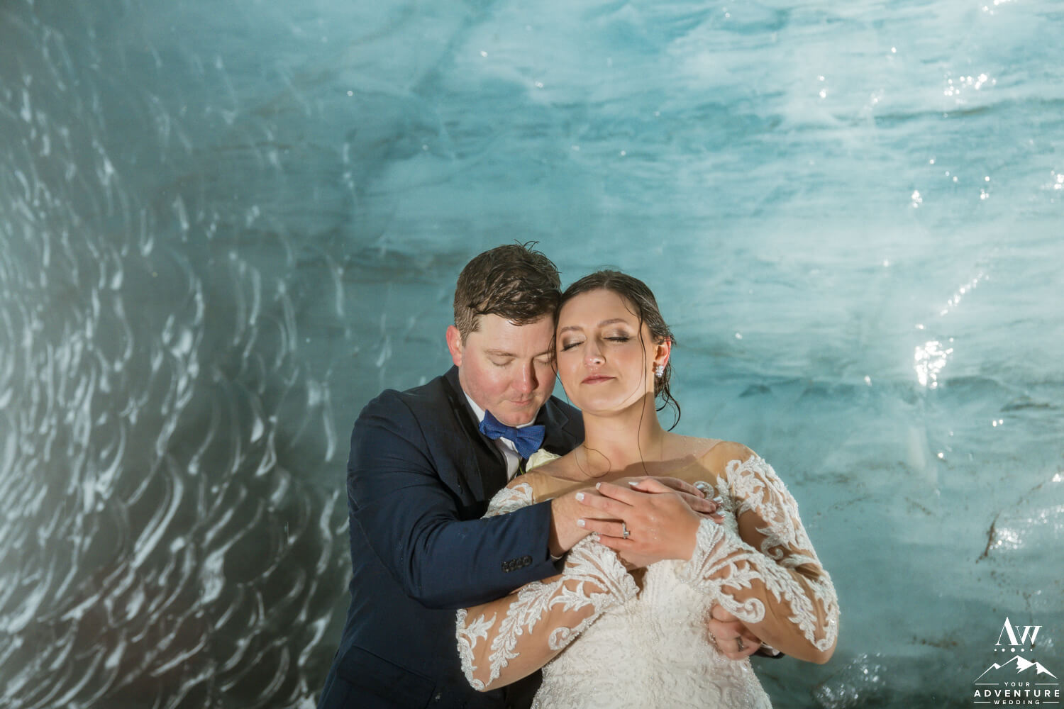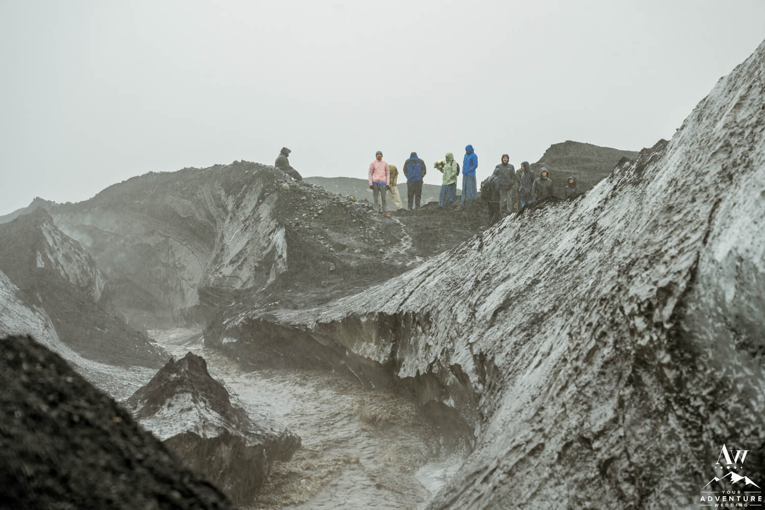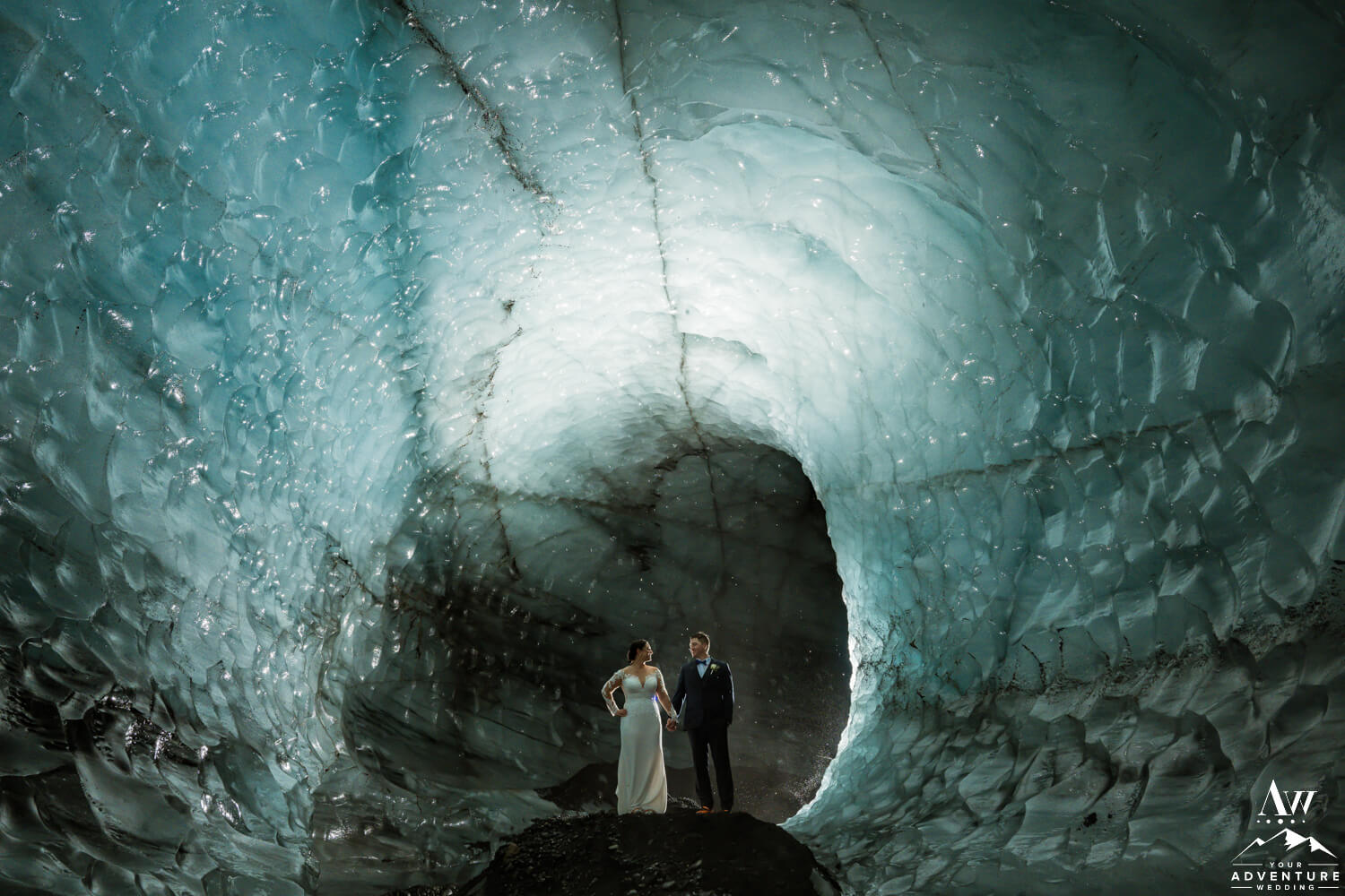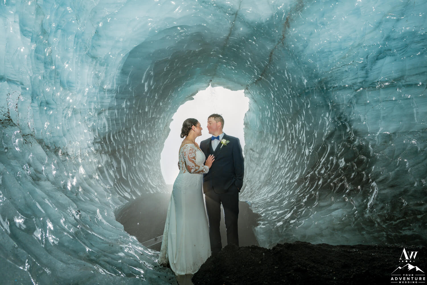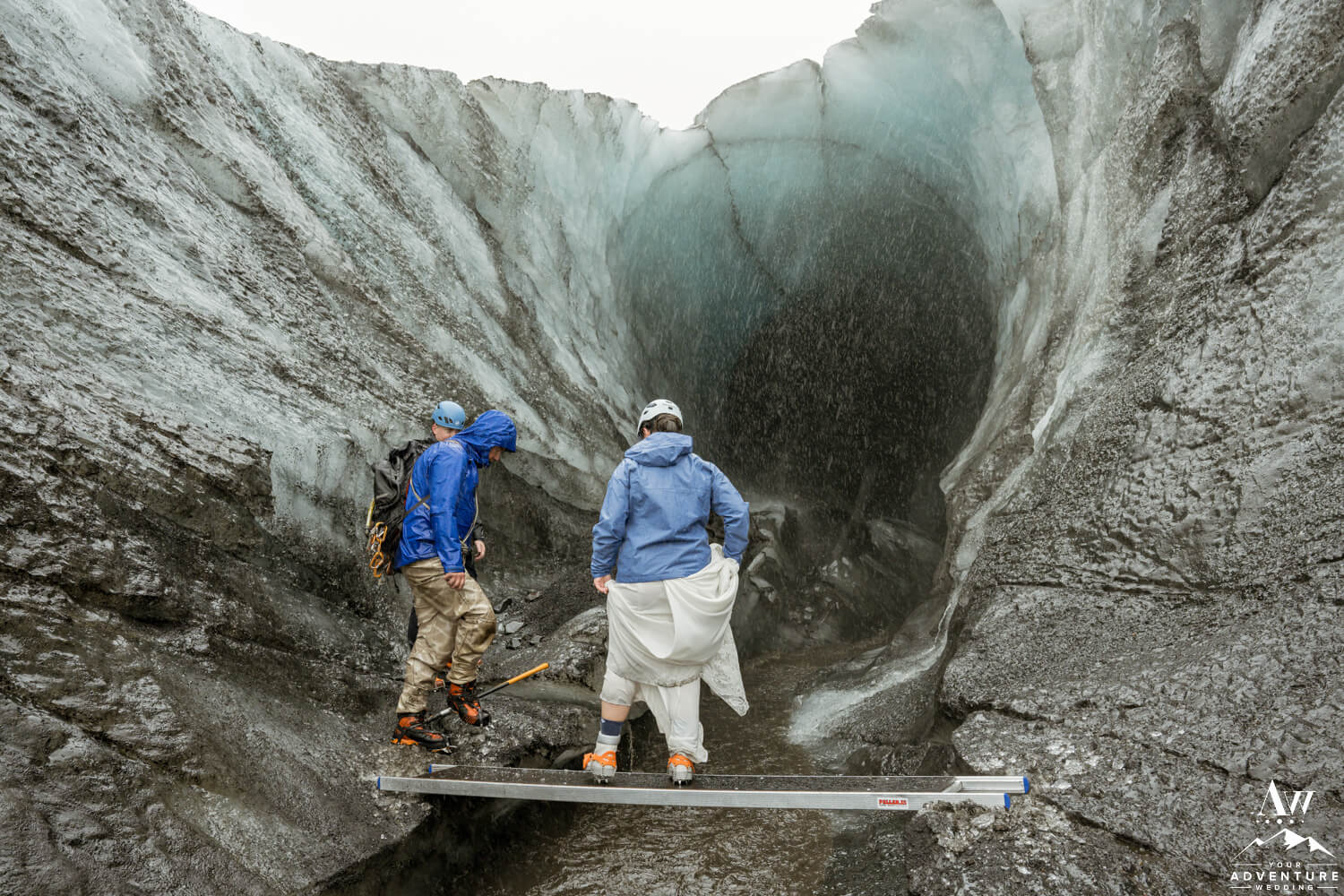 Following the June glacier wedding ceremony, the newlyweds and a few of their more adventures guests hiked up to our private ice cave. The wind and rain got a bit more extreme, but our team got the couple in and out safely. Additionally, our Iceland wedding photographer crafted some incredible shots! How epic is this Summer ice cave?!