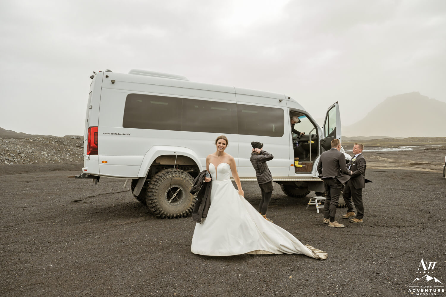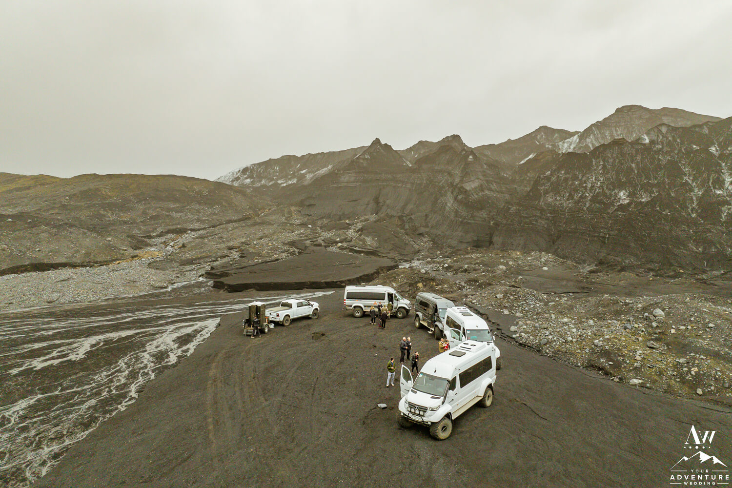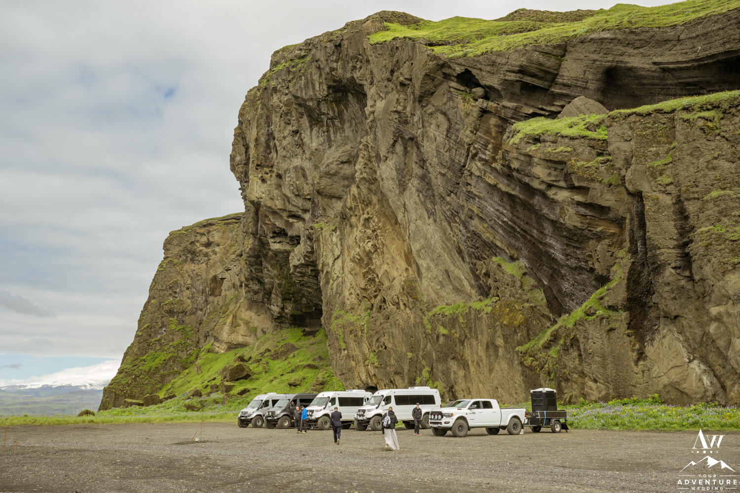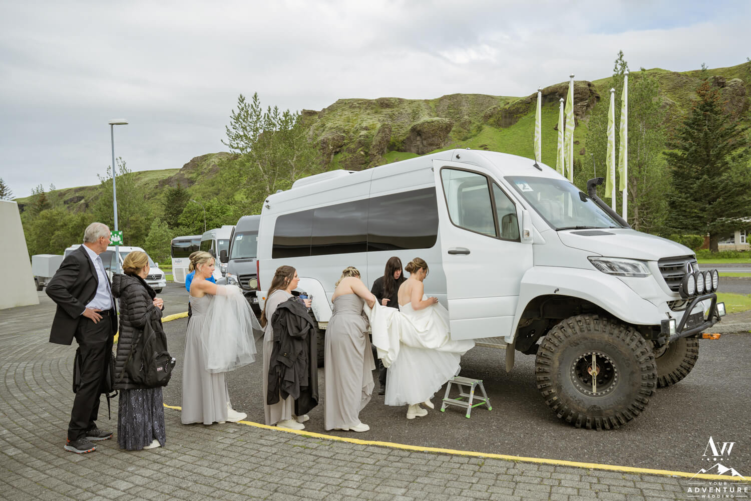 First, July 6th 2023 began full of sunshine and positive vibes at Hotel Klaustur. Second, Emma and Johann chose to have a super awesome bridal party and got ready together amplifying the excitement. Third, our Iceland hair and makeup team along with our photographer, and day of planner got right to work! Fourth, Emma wanted to share a special first look with her father before the days adventures began. Fifth, the group with adventure wedding go bags in tow, loaded into the super jeeps and headed out for the day!
