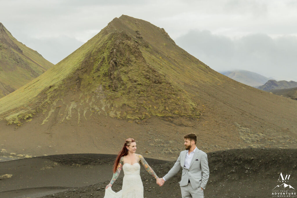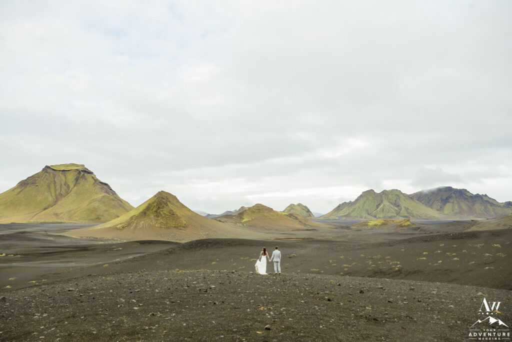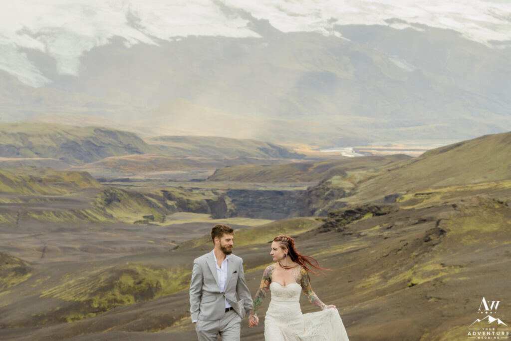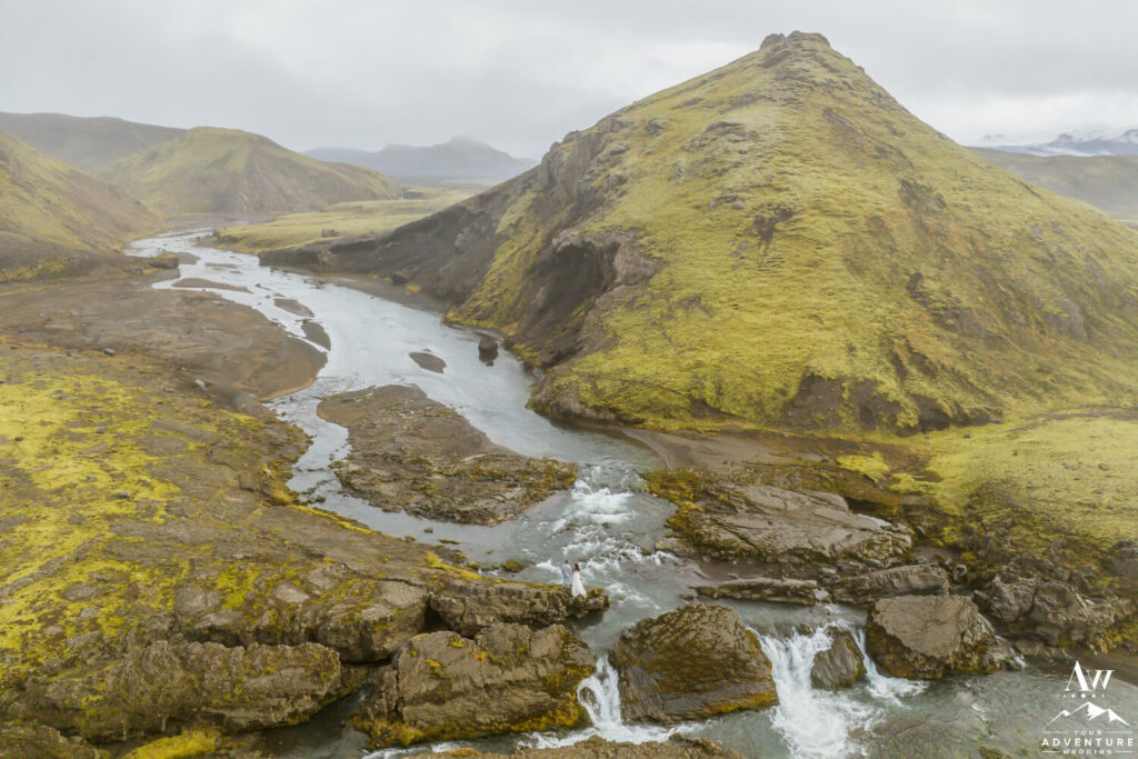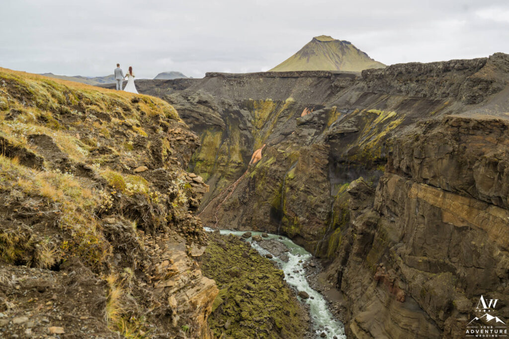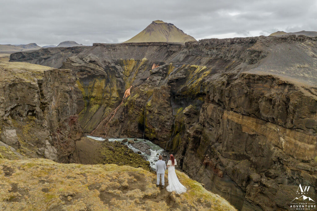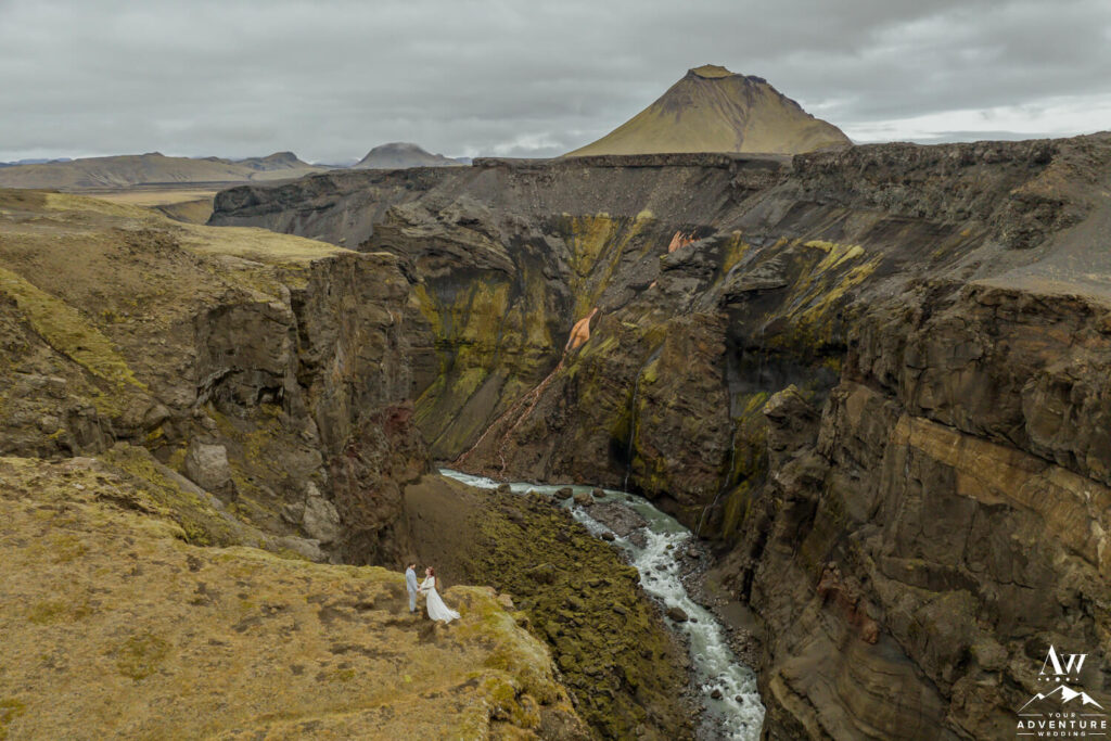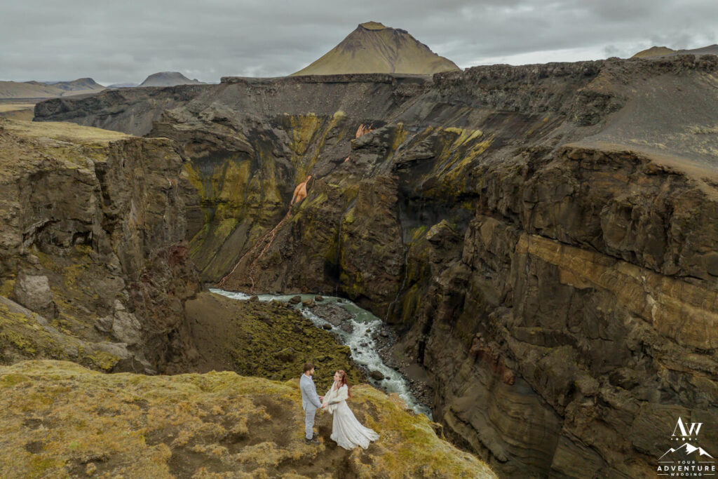 As they emerged from the natural caves, they were greeted by a vivid canyon that stretched as far as the eye could see. Additionally, the area offered panoramic 360-degree views of Iceland’s stunning highlands. But which photos do you like more… From the ground or from the drone our Iceland elopement photographer captured?