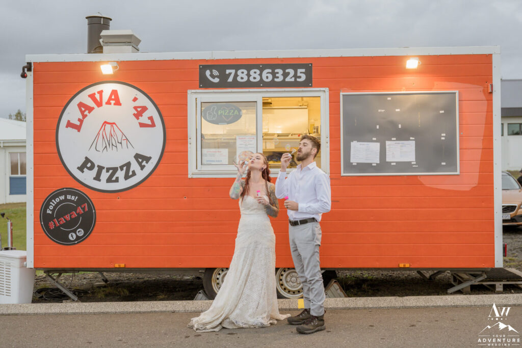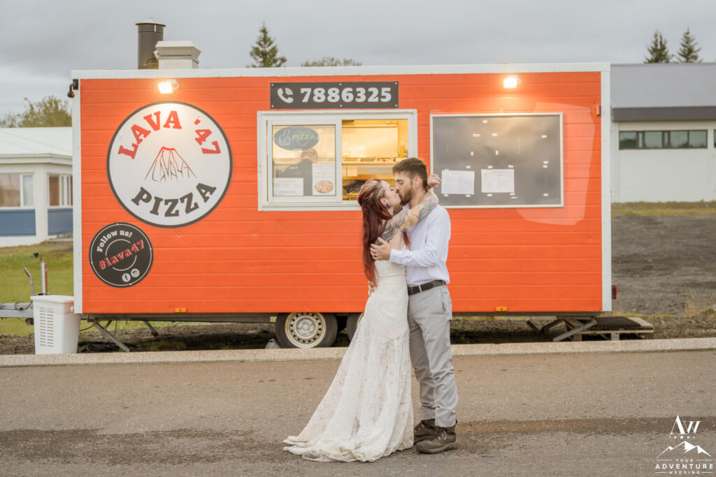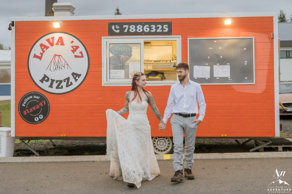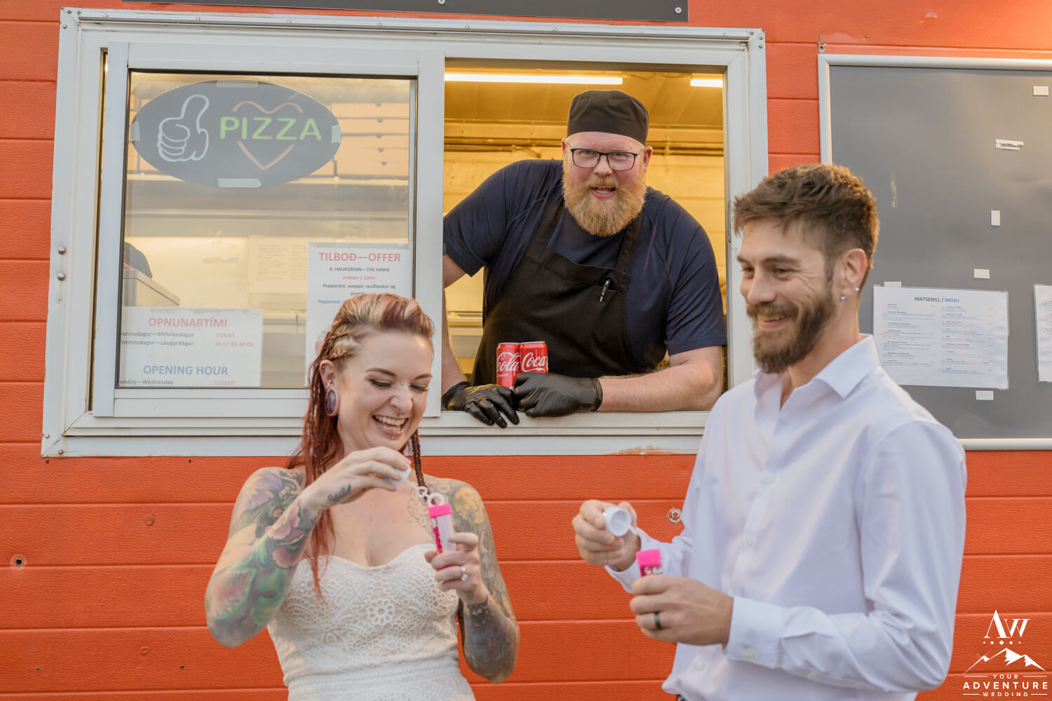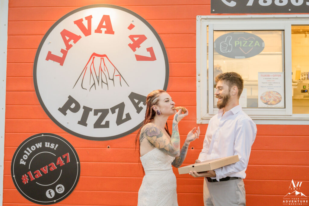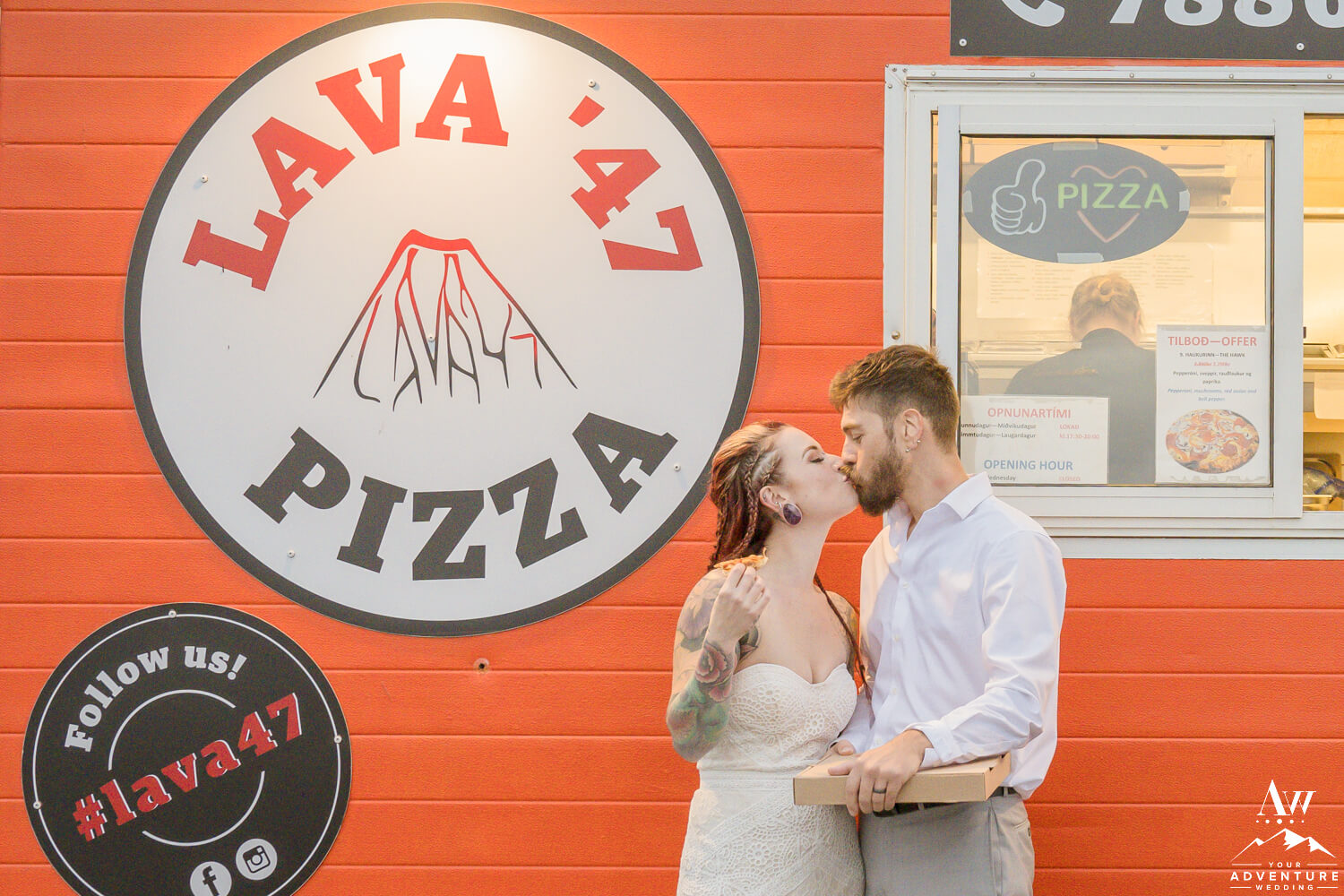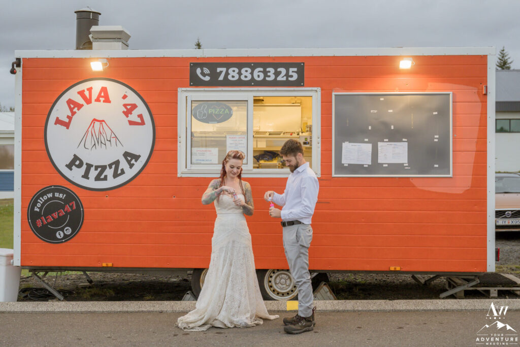 Following an unforgettable day of exploration and love, the newlyweds returned to their host hotel. However, when they came to our Iceland Wedding Planner team they wanted non-traditional elements. Well now it was time for one… To illustrate, the hightailed it across the street to enjoy a delicious pizza feast from the Lava 47 pizza truck! Besides that delicious adventure, they also chose to embark on the Iceland wedding cake tradition (kransakaka), making for a fun and unconventional way to conclude their once-in-a-lifetime September hiking elopement!