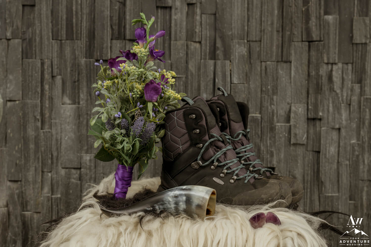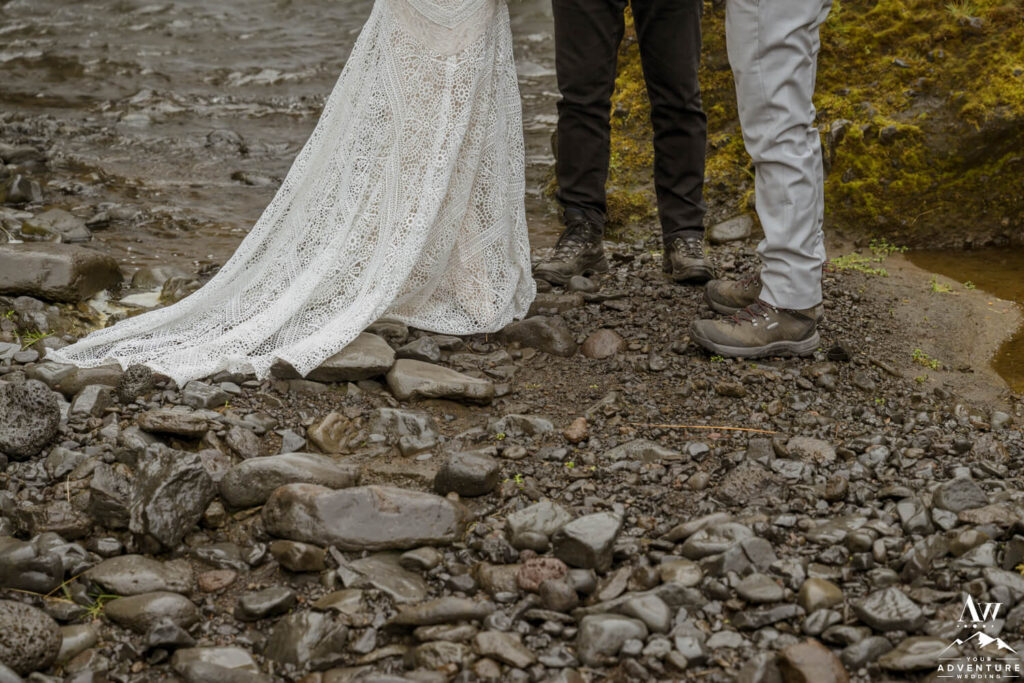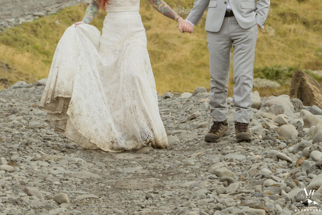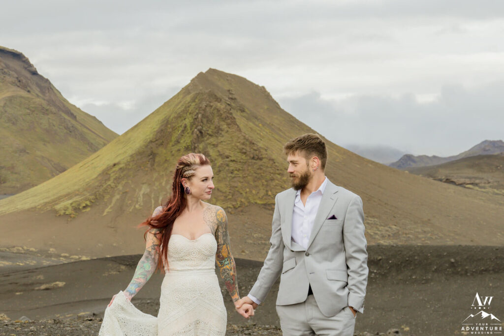 Emily decided to do her own hair and makeup. Aaron donned sweet groom details and Emily had a boho inspired Iceland wedding dress! Meanwhile, can we pause for a sec and admire their Iceland wedding rings that are engraved? Additionally, they grabbed their “go bags” and they set off into the Icelandic wilderness, ready to embrace the beauty and challenges of the Highlands!