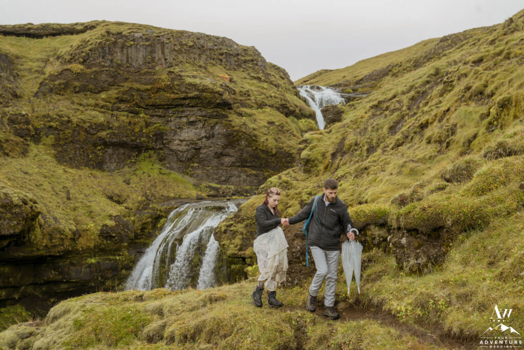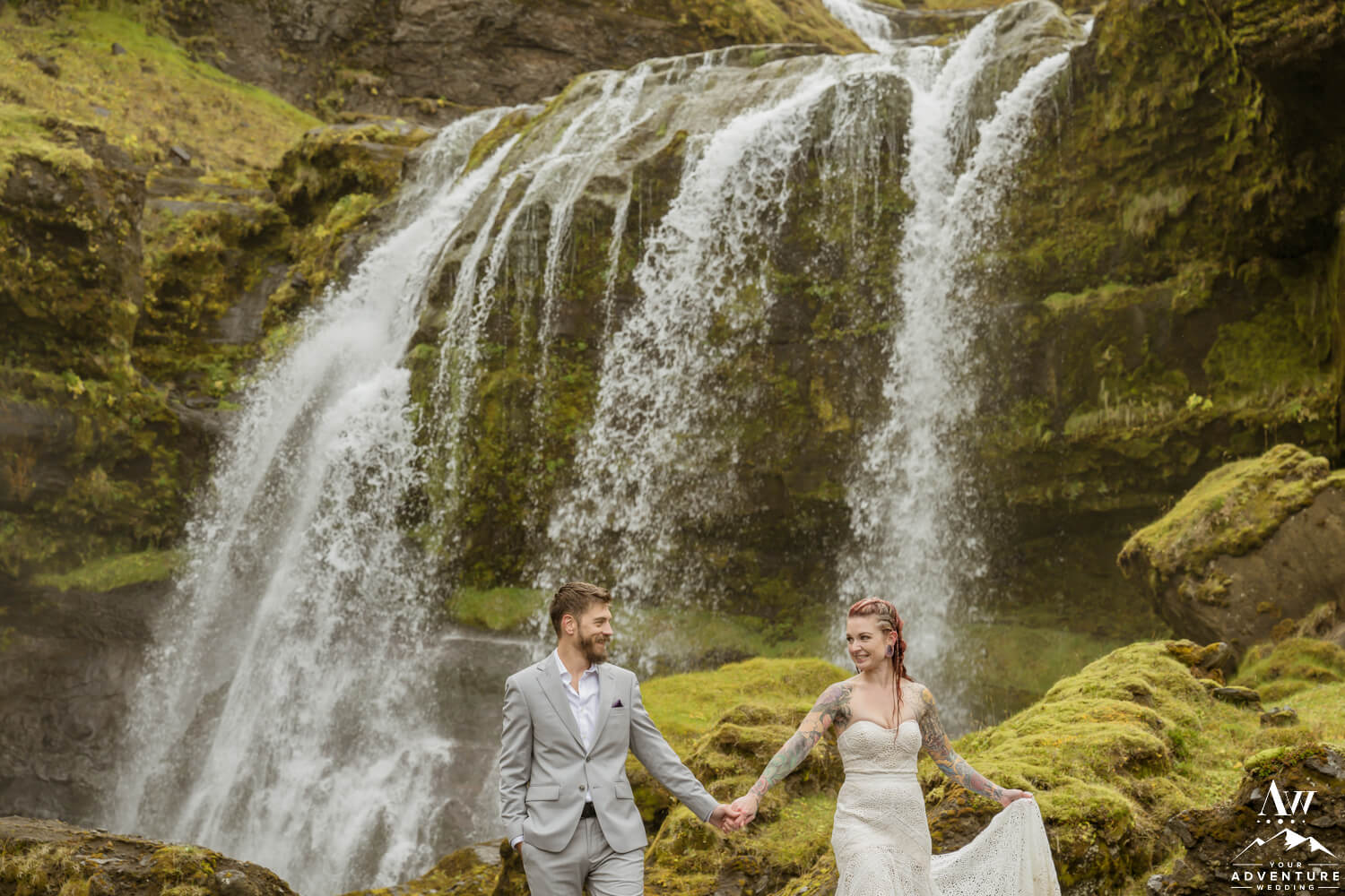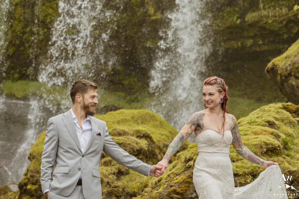 Emily and Aaron were ready for anything following their September hiking elopement ceremony. Including running around in the mist of the massive waterfall they just wed in front of! Talk about creating memorable moments on your elopement in Iceland, right?! Likewise you’ll see by their smiles said it all!