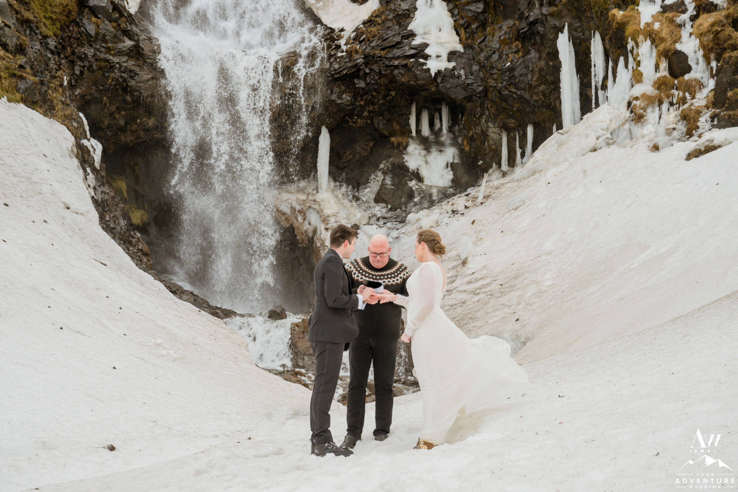 Meanwhile, Katarzyna and Jacek began their February Iceland elopement with an intimate wedding ceremony in front of a private winter waterfall. Surrounded by snowdrifts, frozen icicles, and the roar of fresh falling water. It was here they exchanged vows, rings, and celebrated their new commitment with a kiss! The bride’s Iceland wedding dress flowed in the wind while the groom wore classic black a perfect contrast!