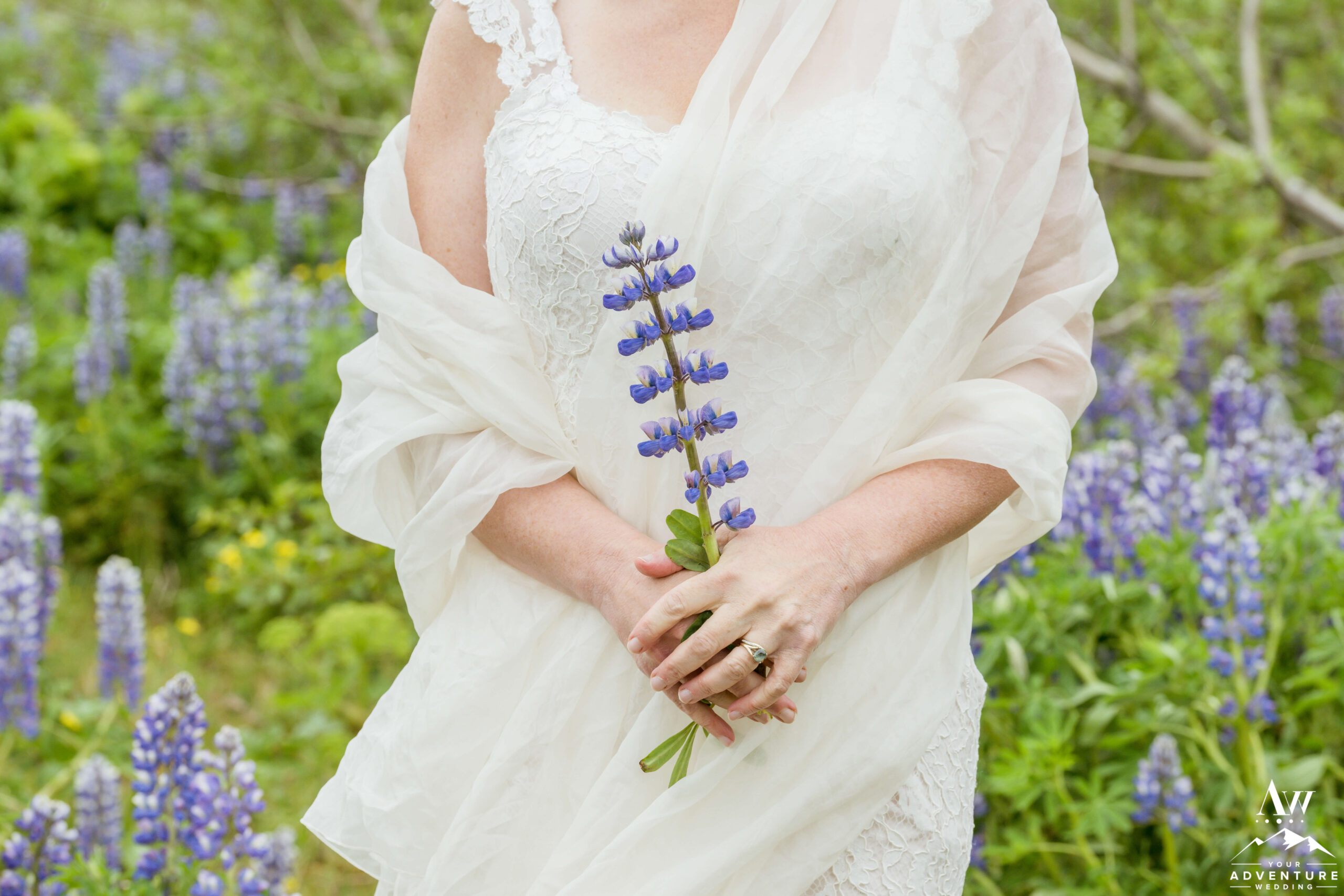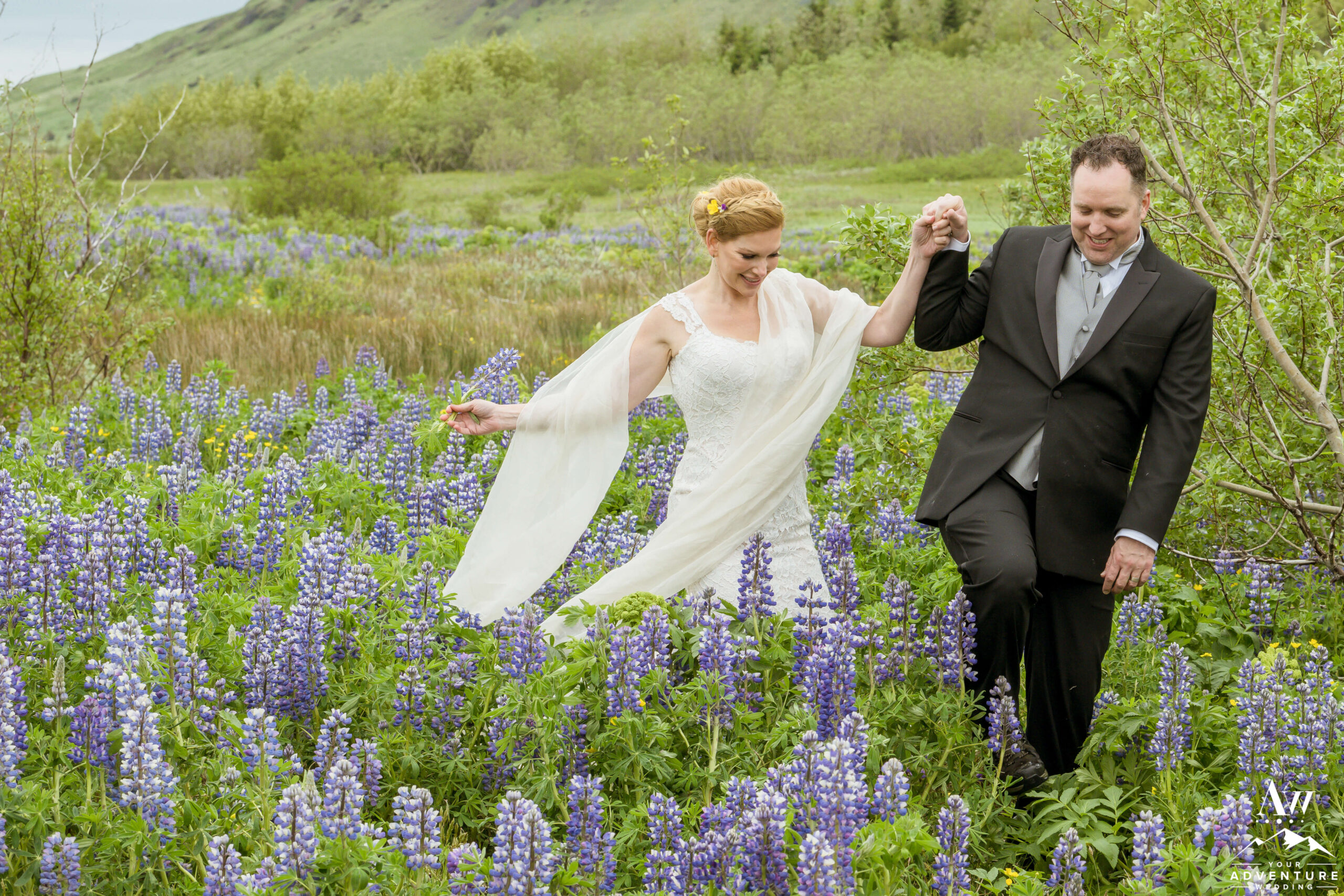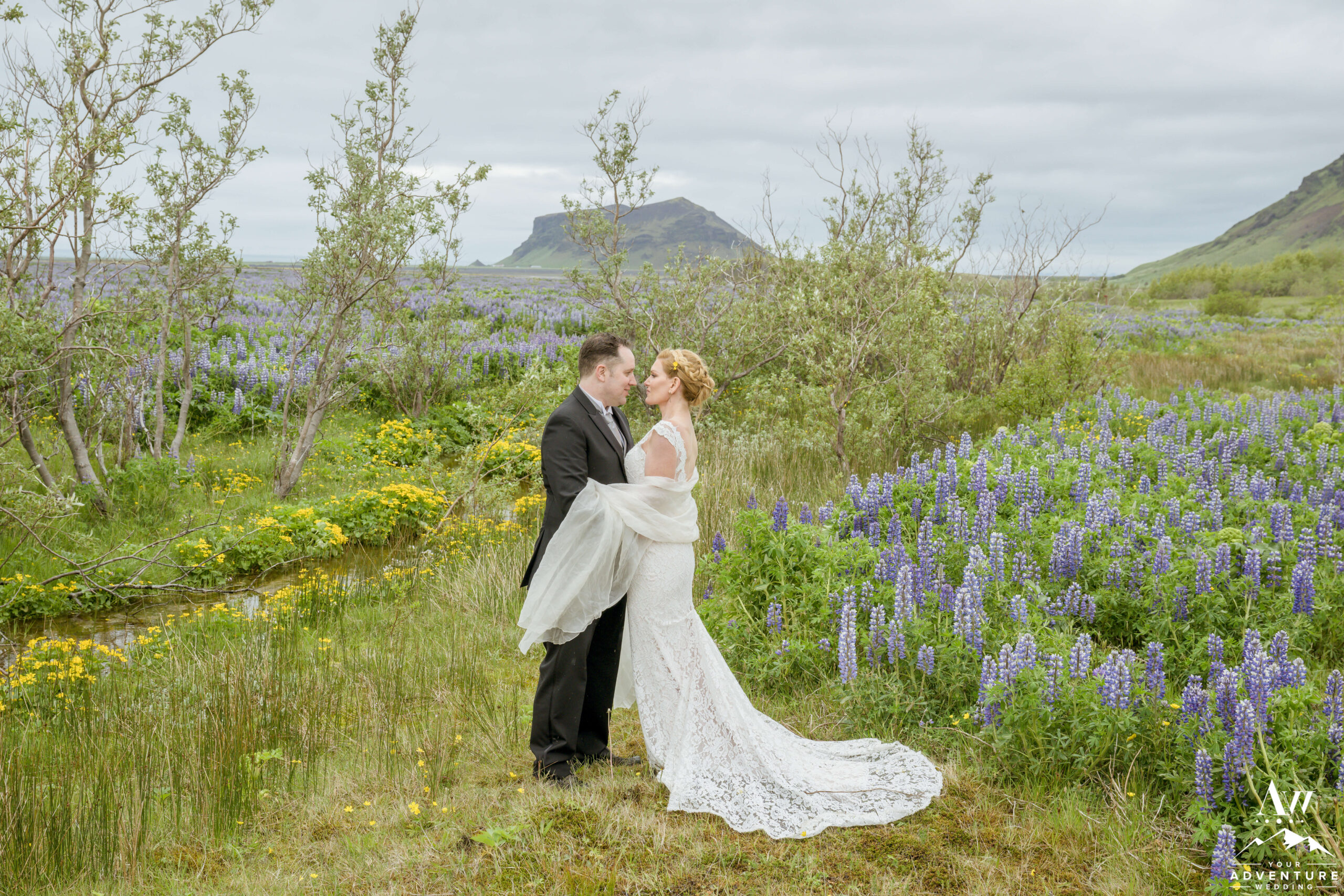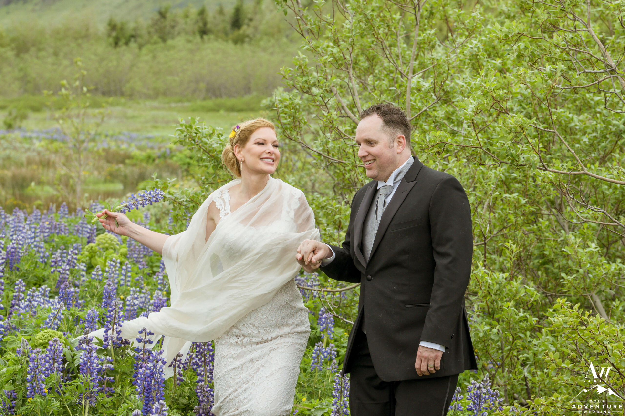 The day began with a drive into the Icelandic Highlands, where purple Icelandic lupine roll across the hills and valleys. The flowers were in peak bloom, truly creating a dreamy backdrop against glacial rivers. Meanwhile, the couple took time to wander through the blooms, hand in hand, taking in the quietness of the Highlands before their waterfall wedding vows.