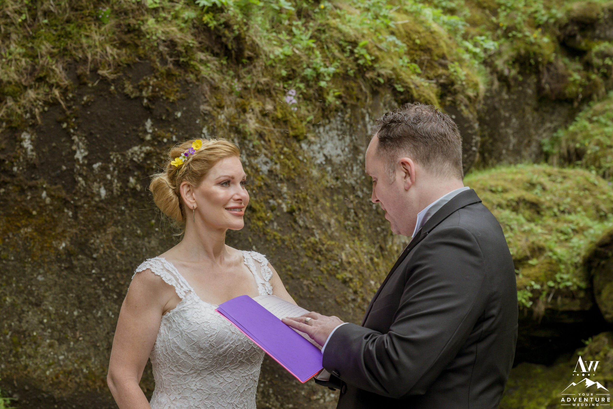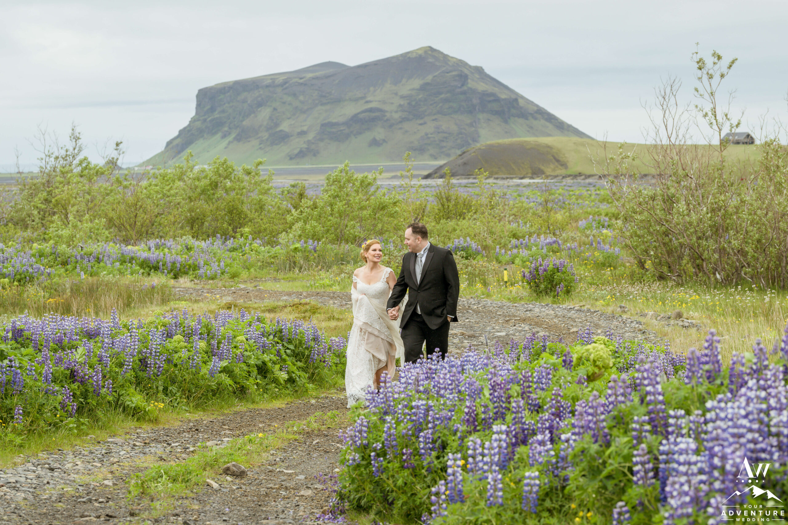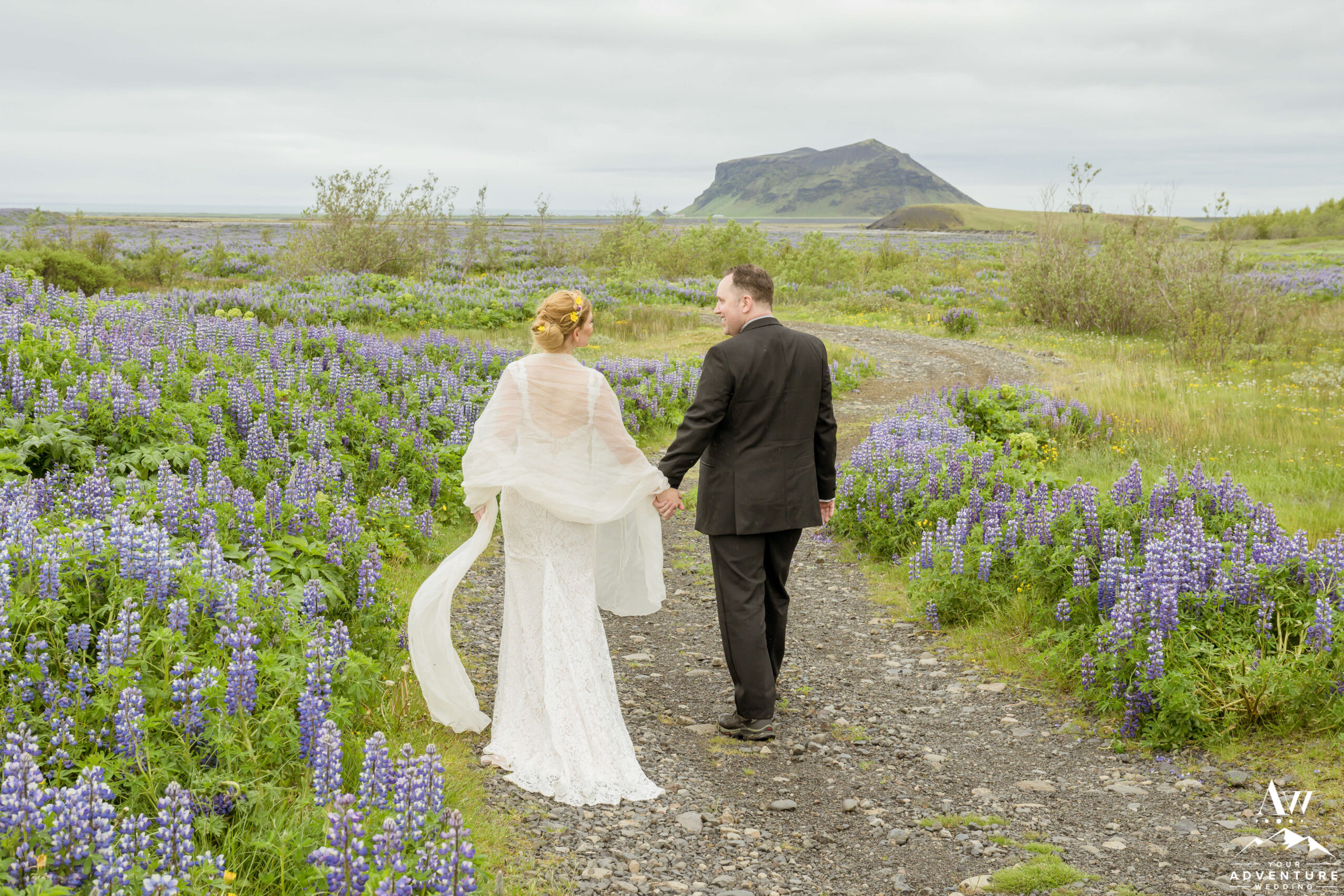 The day began with a drive into the Icelandic Highlands, where purple Icelandic lupine roll across the hills and valleys. The flowers were in peak bloom, truly creating a dreamy backdrop against glacial rivers. Meanwhile, the couple took time to wander through the blooms, hand in hand, taking in the quietness of the Highlands before their waterfall wedding vows.