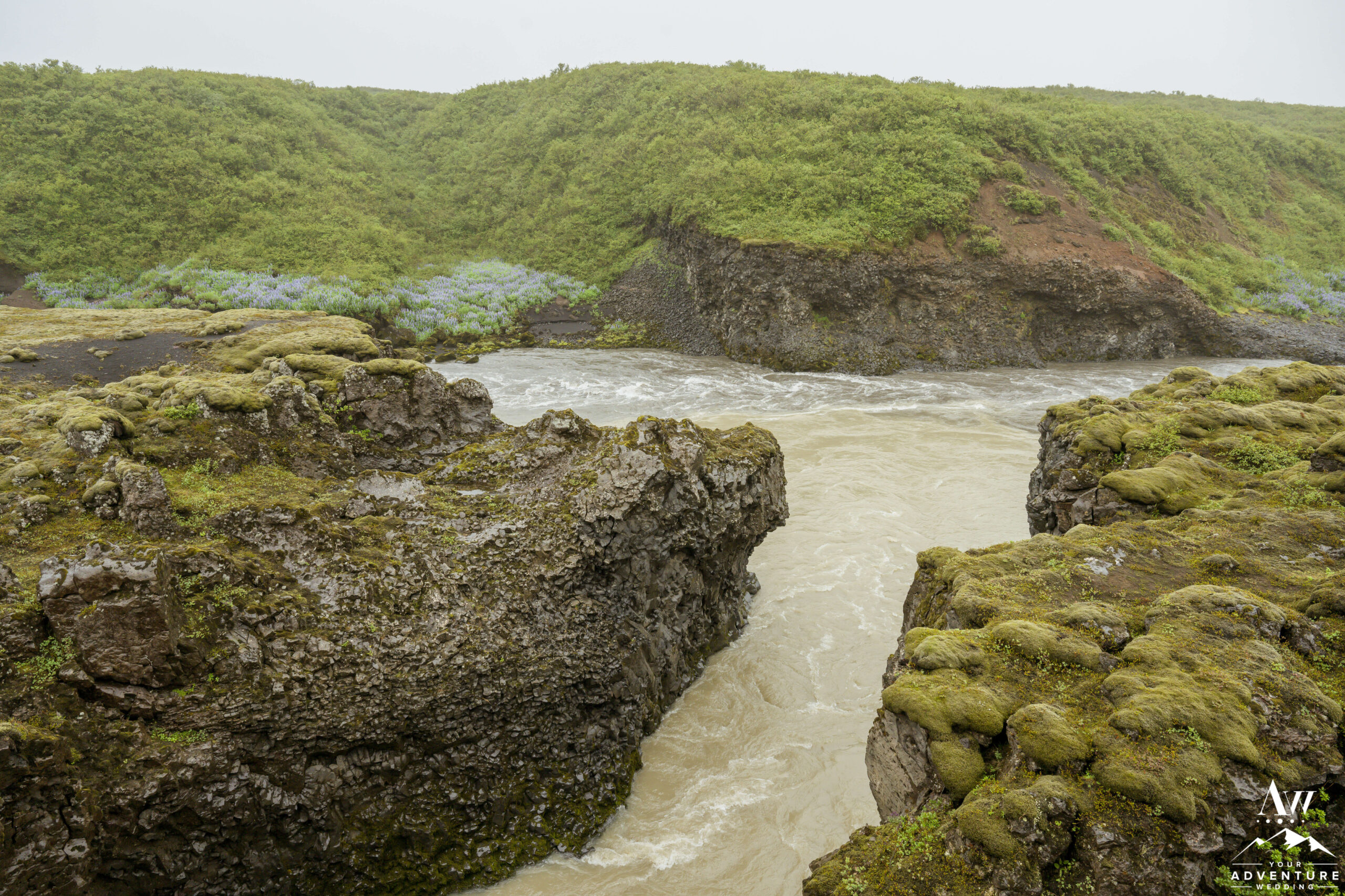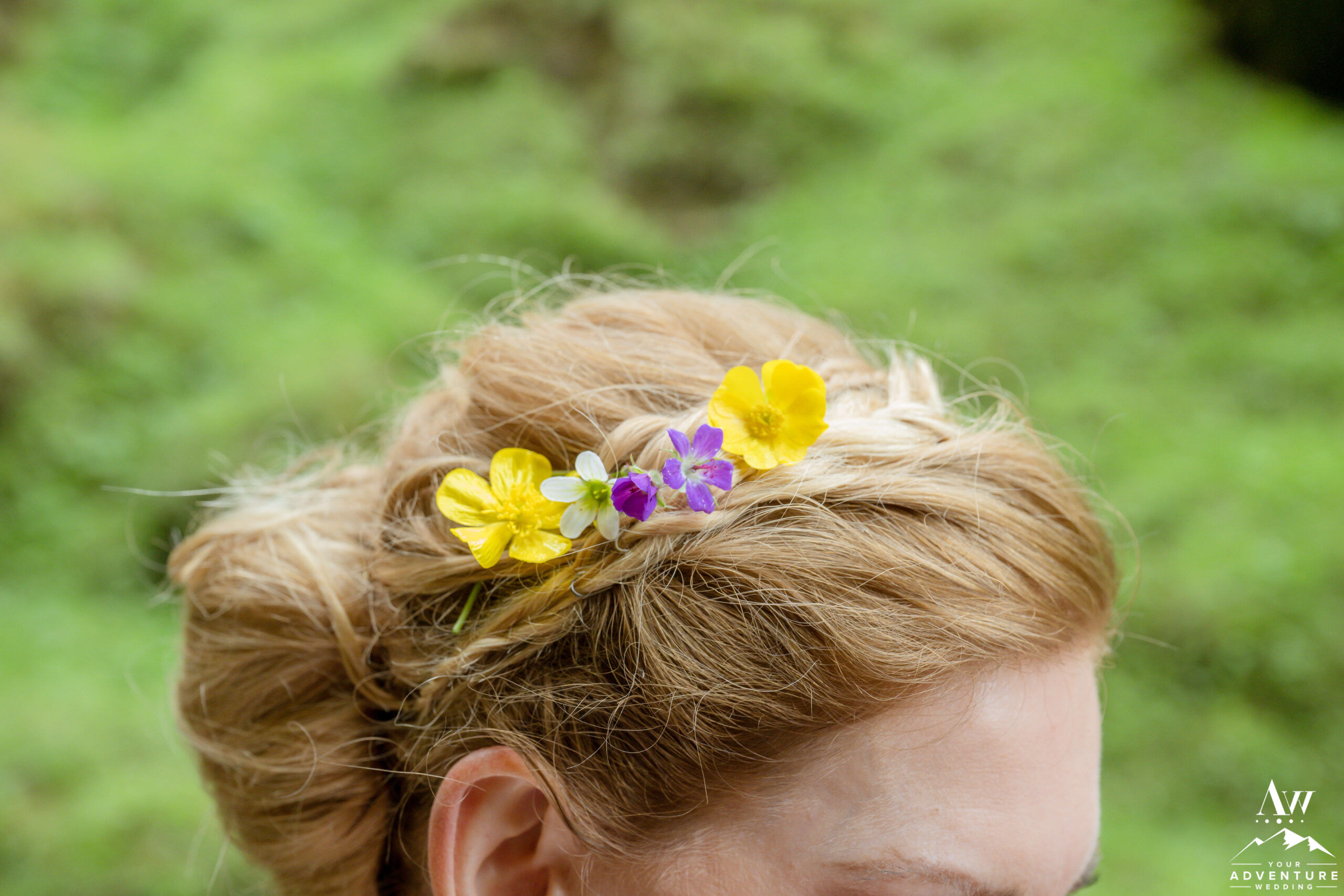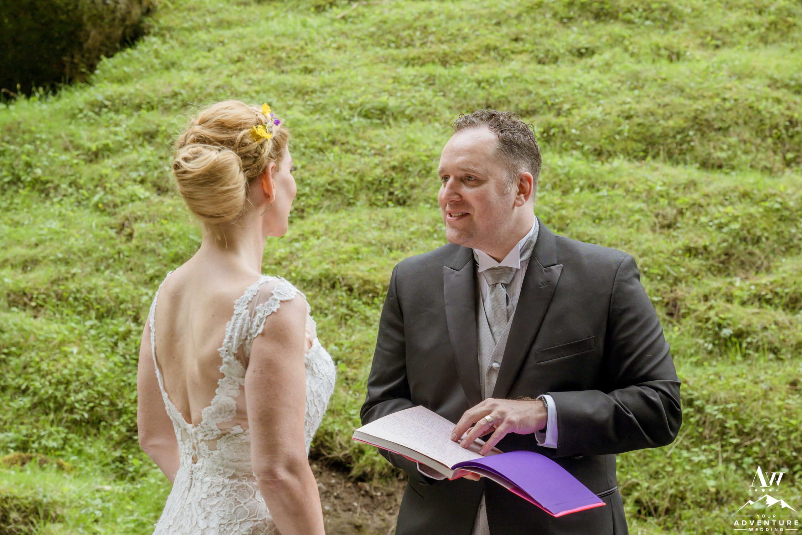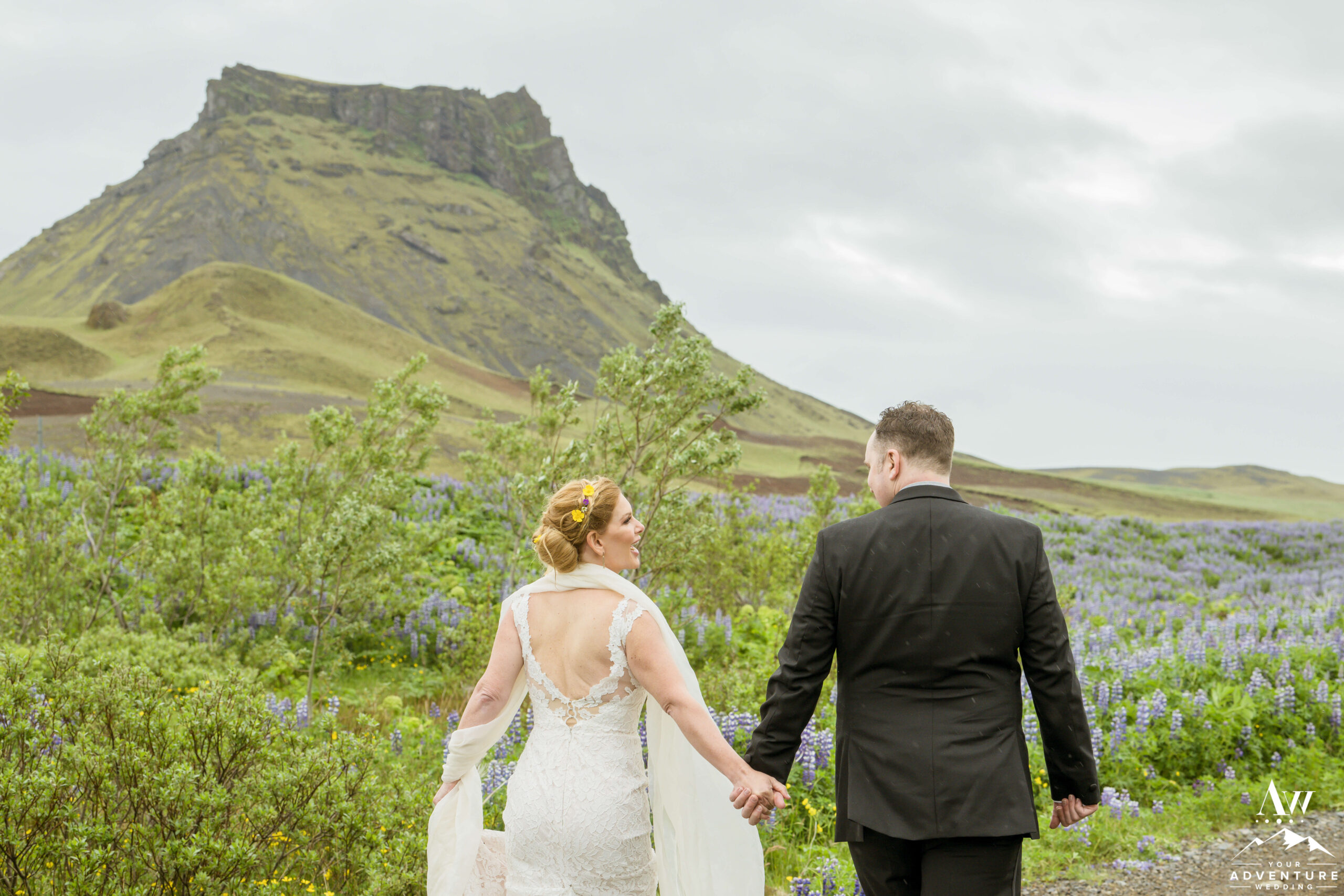 The day began with a drive into the Icelandic Highlands, where purple Icelandic lupine roll across the hills and valleys. The flowers were in peak bloom, truly creating a dreamy backdrop against glacial rivers. Meanwhile, the couple took time to wander through the blooms, hand in hand, taking in the quietness of the Highlands before their waterfall wedding vows.