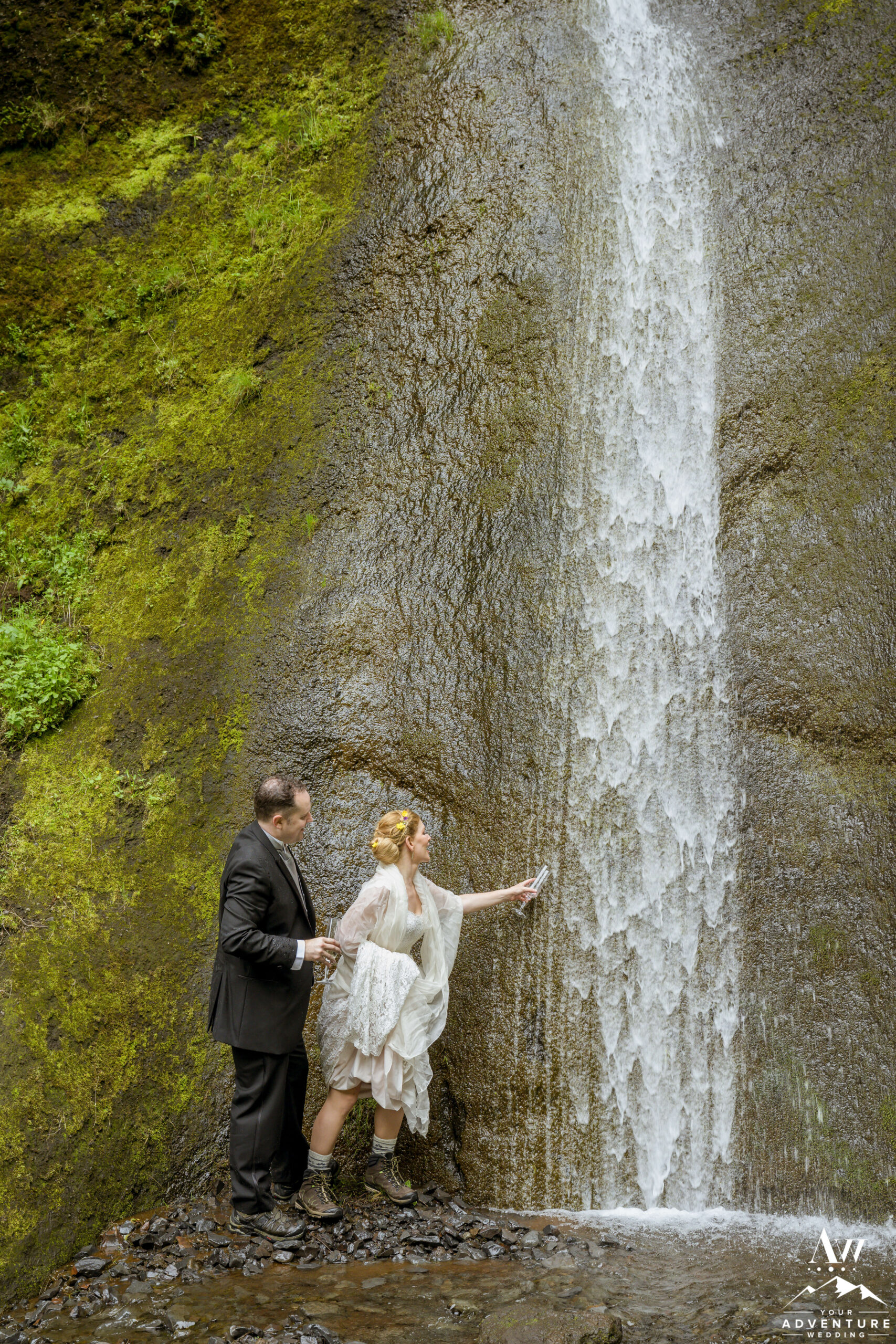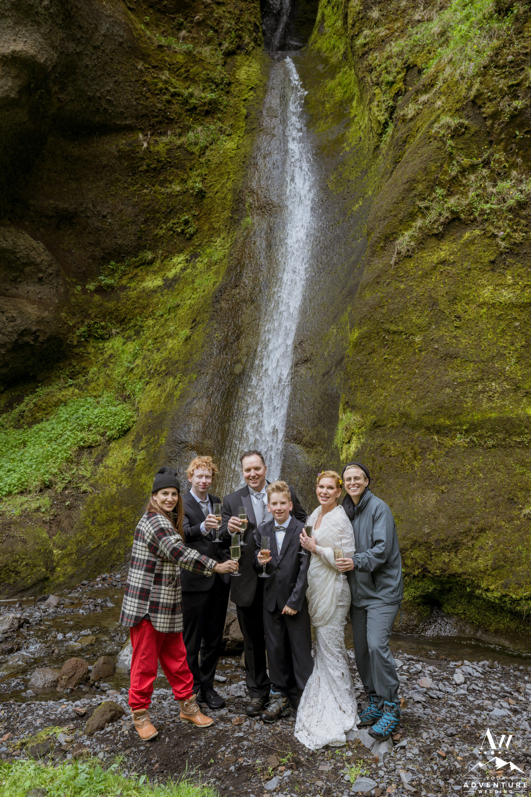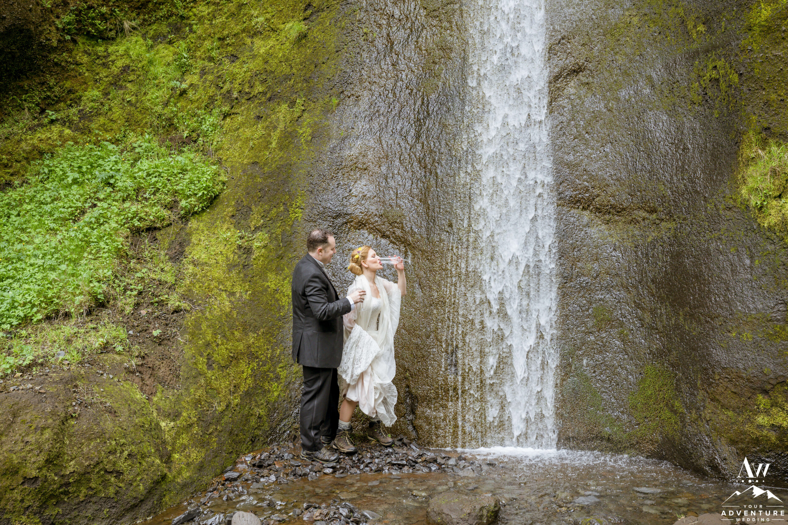 Next, the main event took place at a very hard to get to and secluded private waterfall in a narrow canyon. Furthermore, the group was surrounded by the rumble of falling water as Brandon and Joan exchanged their waterfall wedding vows. Additionally, the group kicked off this new chapter for the newlyweds with bubbles! How fabulous, right?