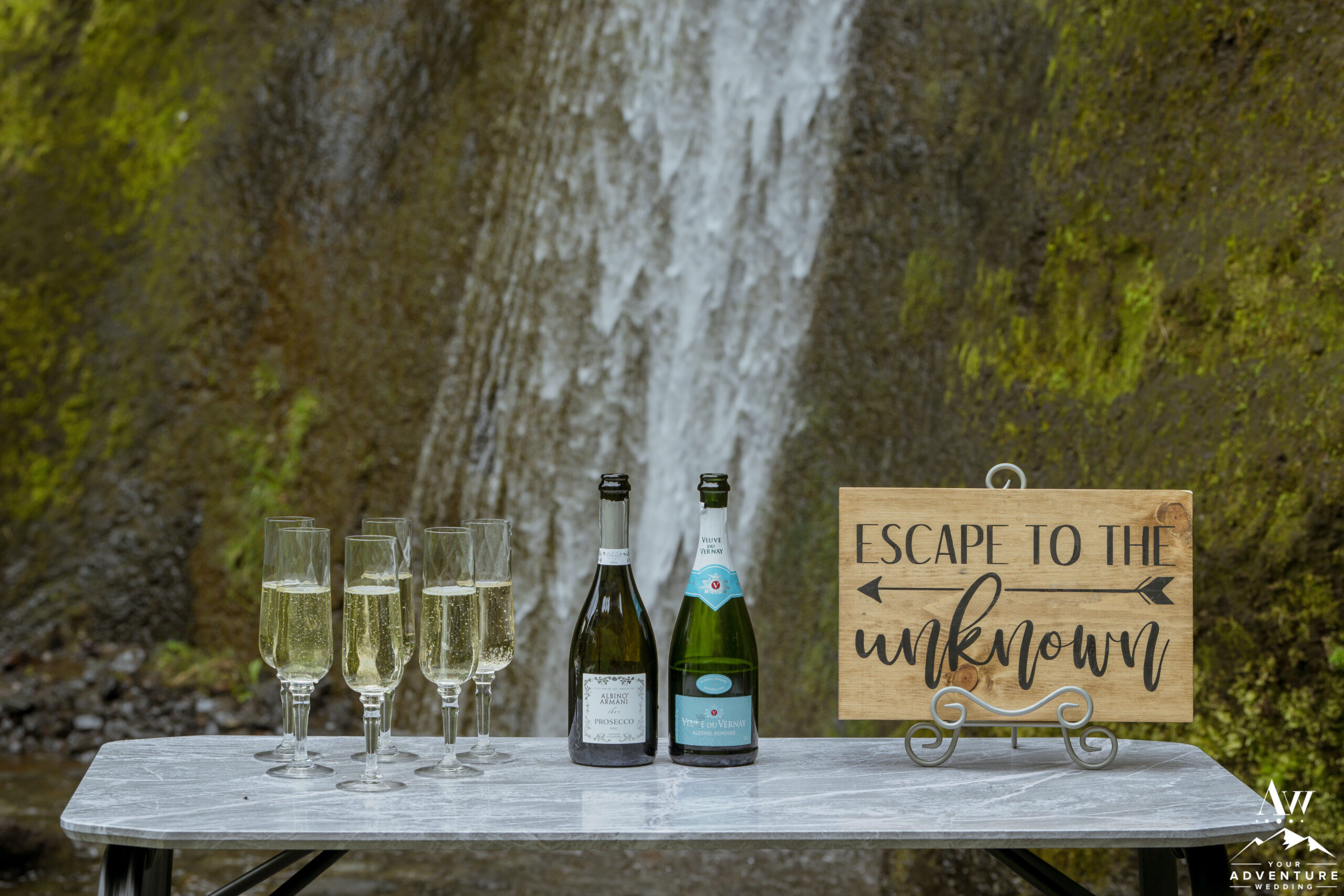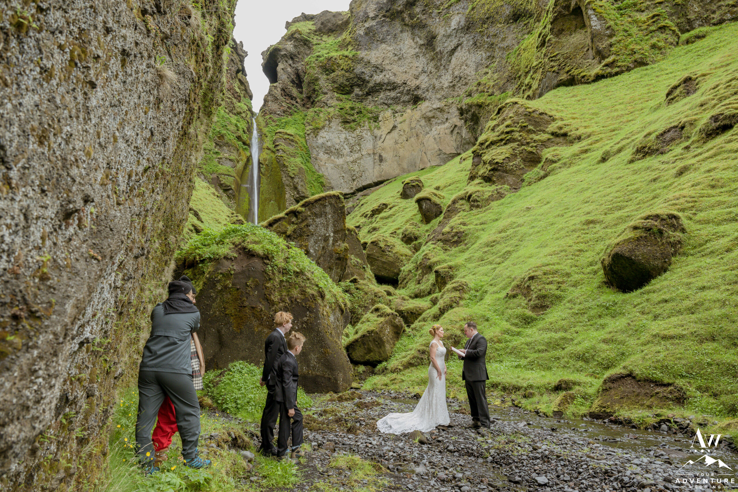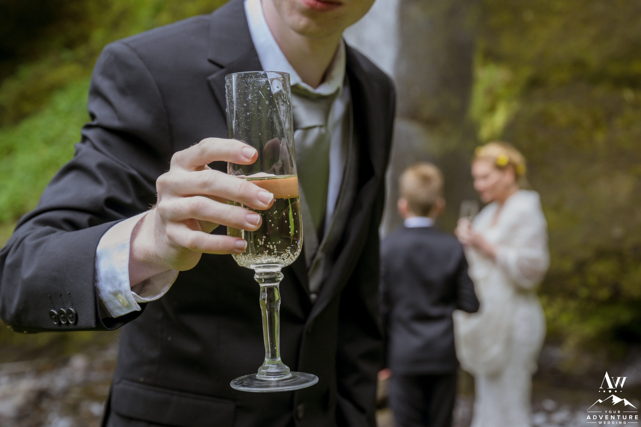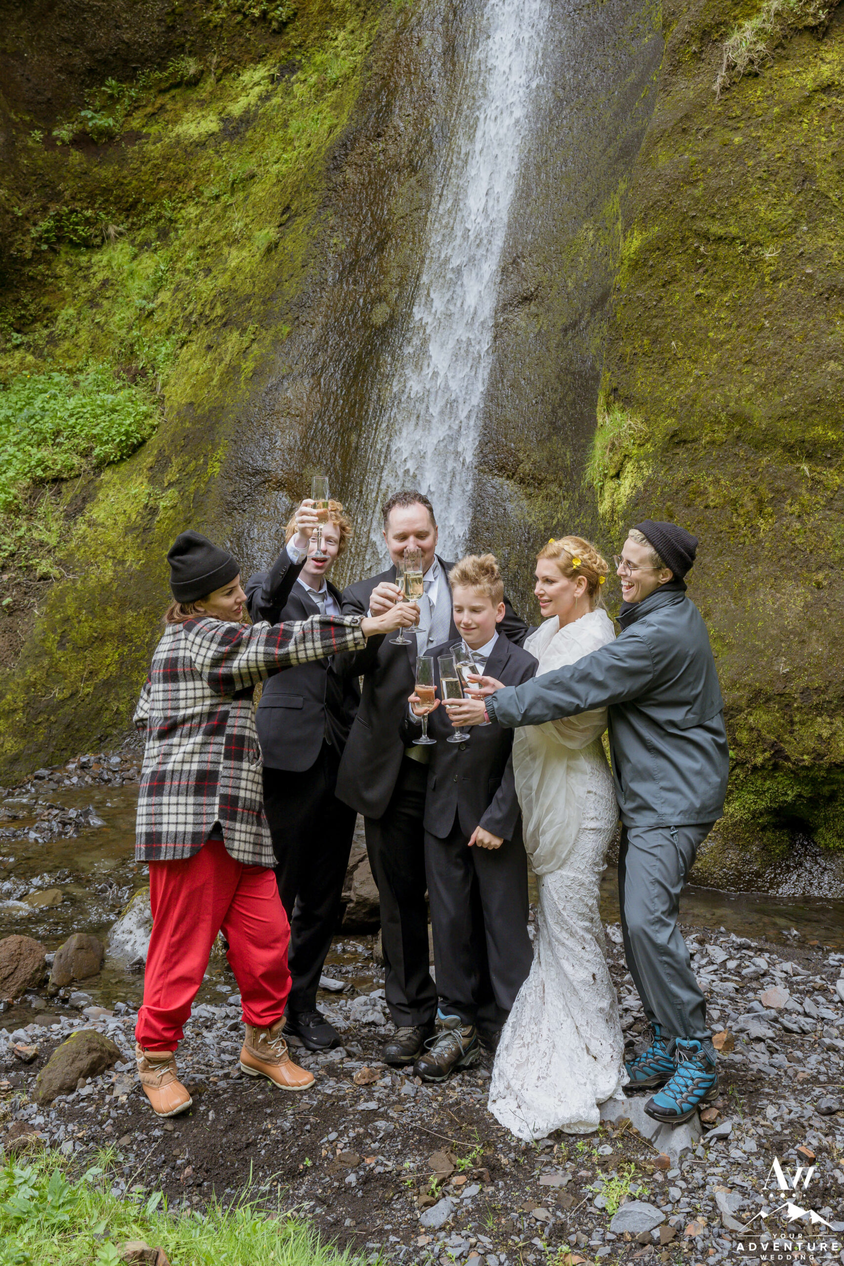 Next, the main event took place at a very hard to get to and secluded private waterfall in a narrow canyon. Furthermore, the group was surrounded by the rumble of falling water as Brandon and Joan exchanged their waterfall wedding vows. Additionally, the group kicked off this new chapter for the newlyweds with bubbles! How fabulous, right?