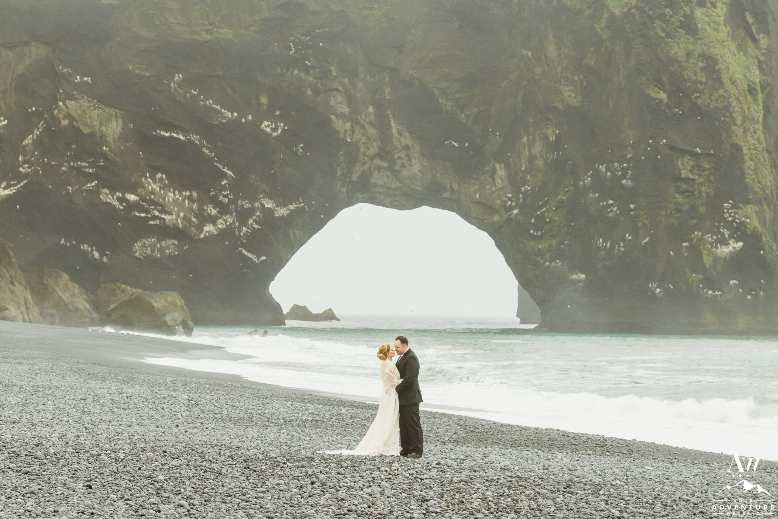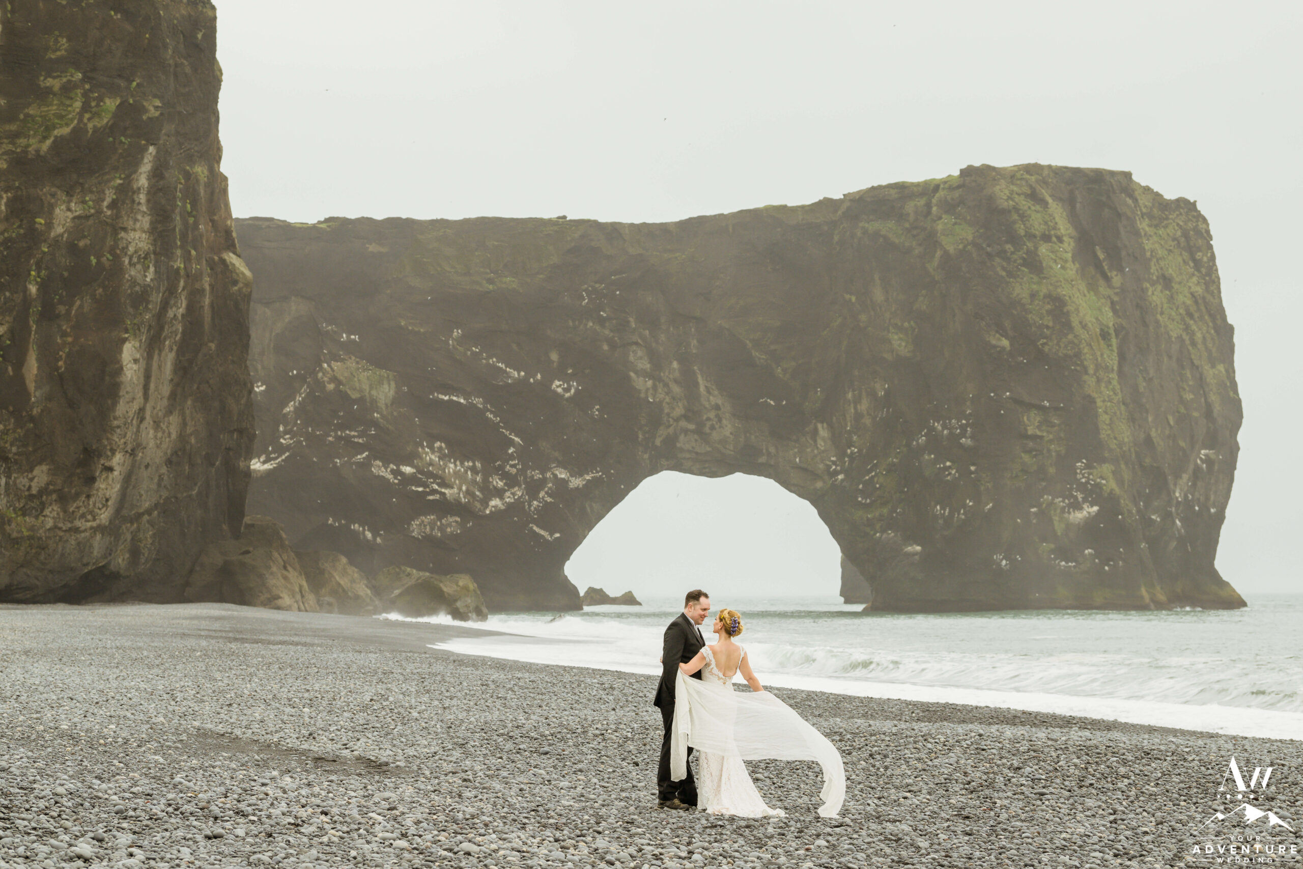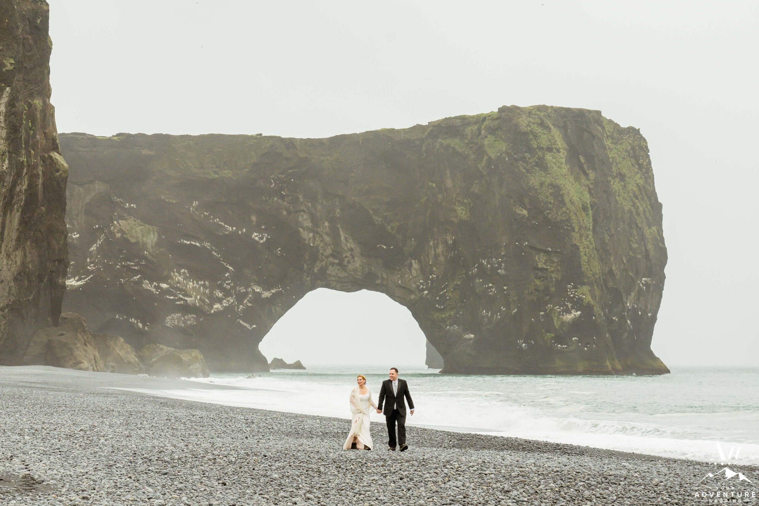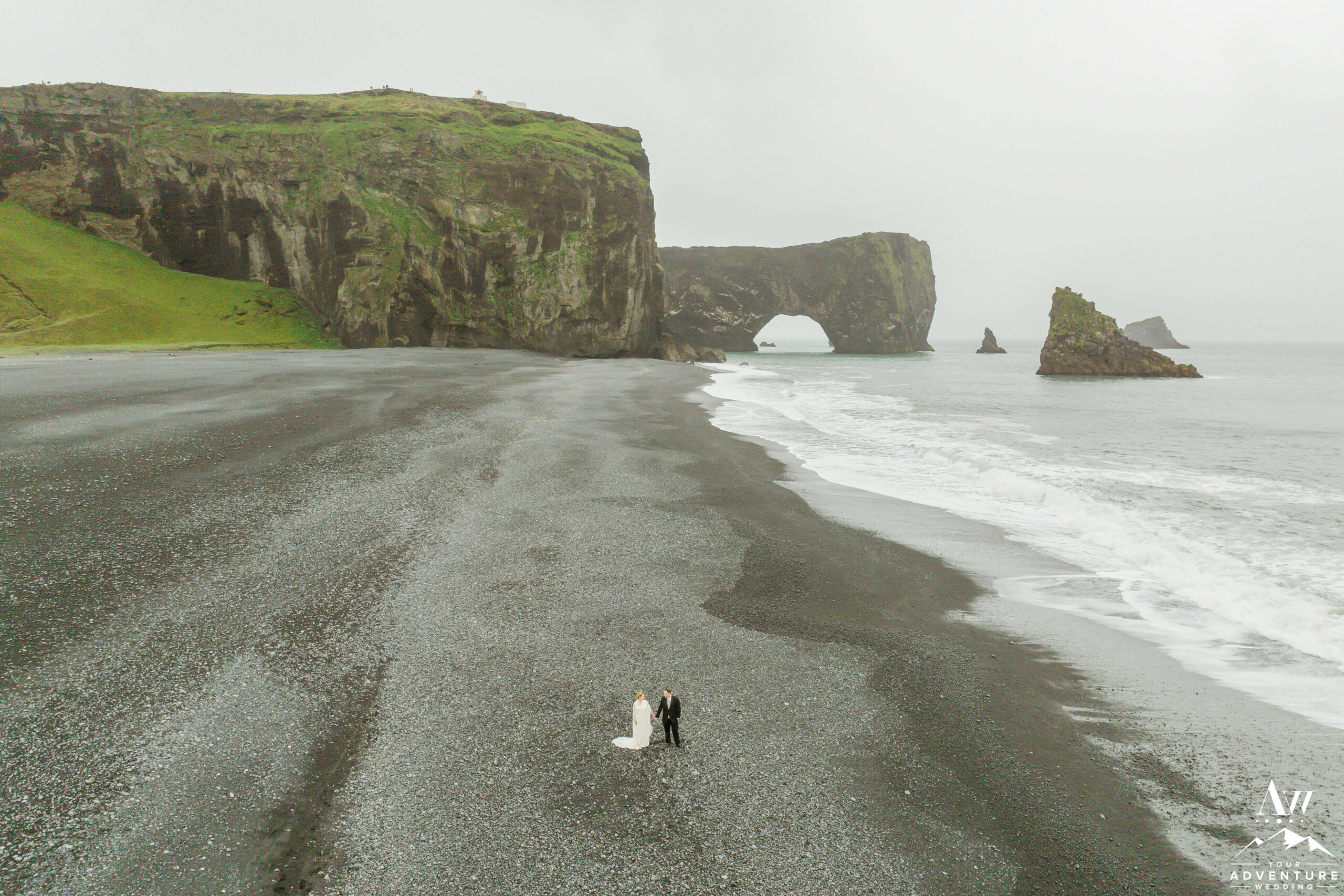 After their waterfall wedding vows the group journey to the private side of Dyrhólaey Black Sand Beach. Here waves crashed dramatically against a towering sea arch. For example, the contrast of dark volcanic sands and the bride’s flowing dress created cinematic moments at every turn, truly! 100% sure this location is perfect for couples who want both natural drama and serene romance in their Iceland wedding photos!