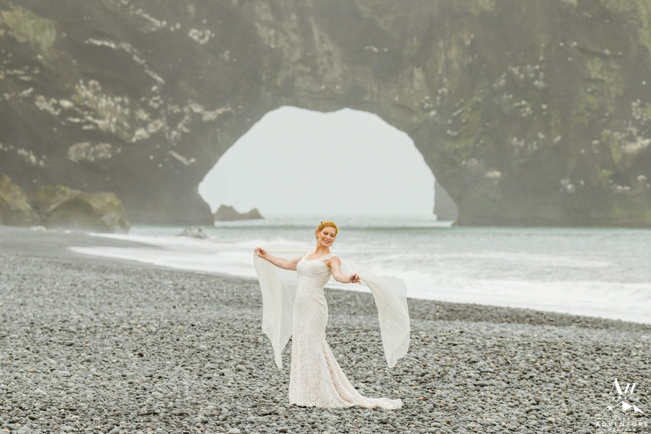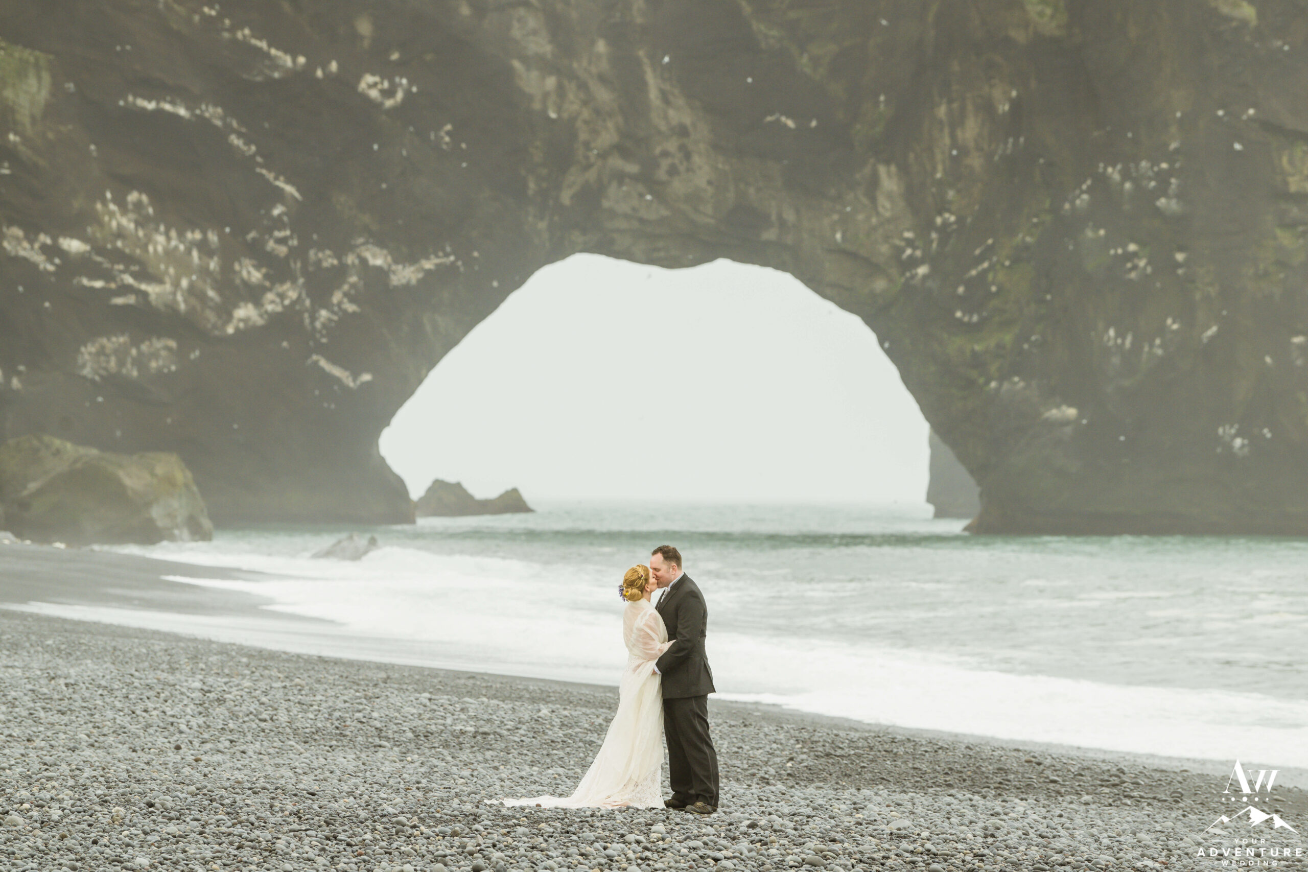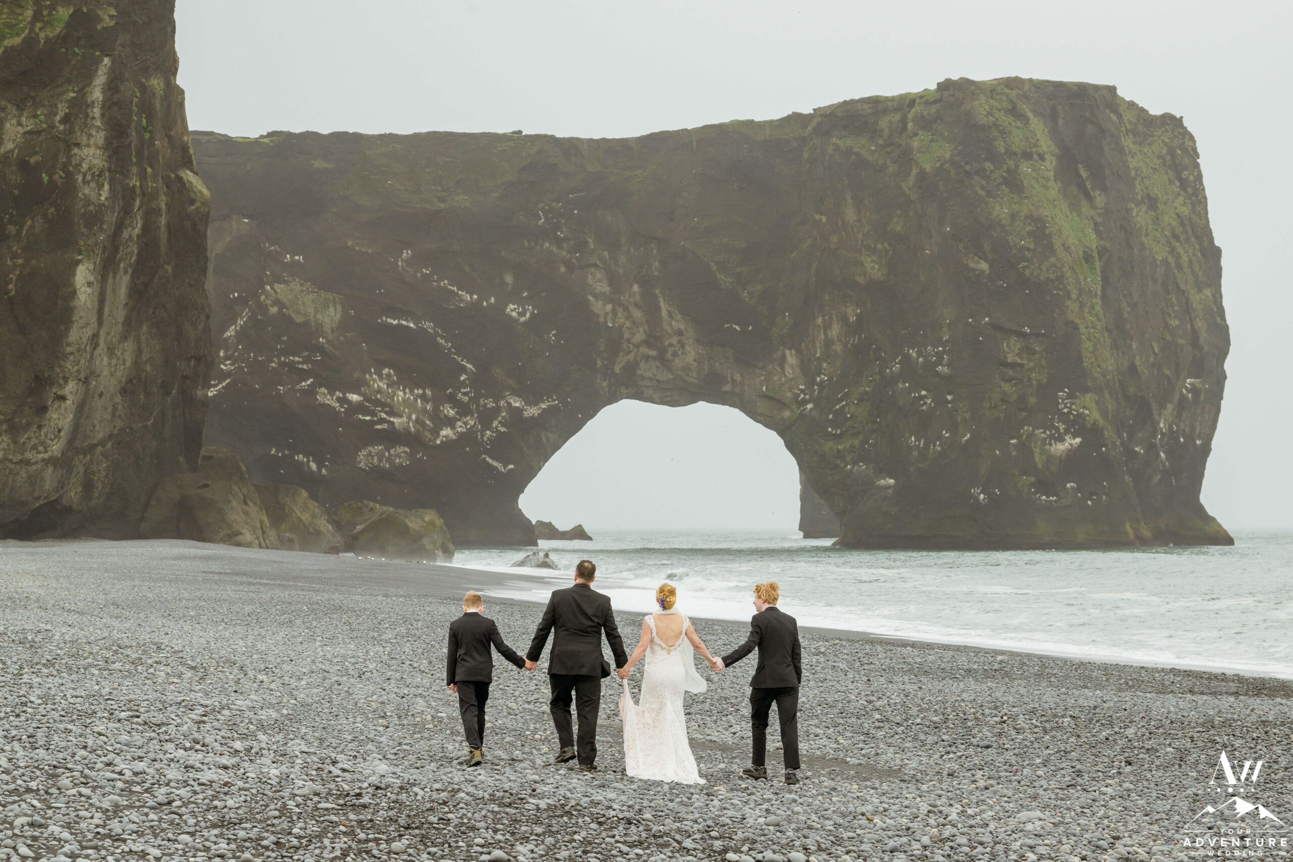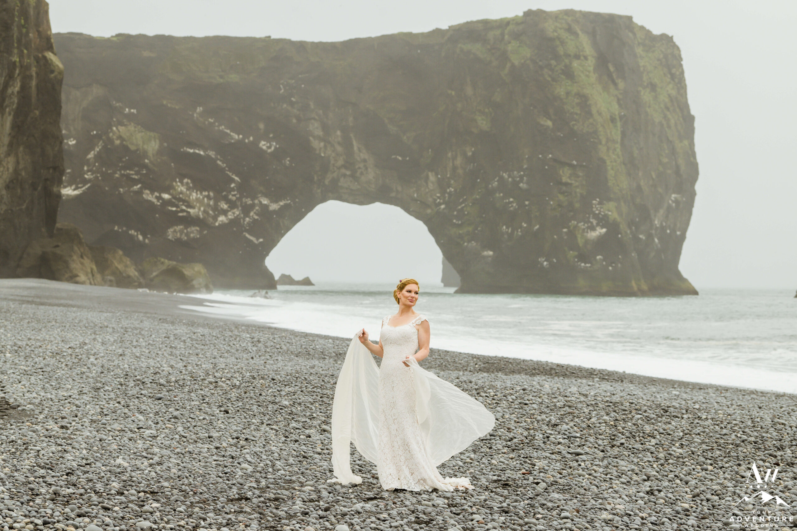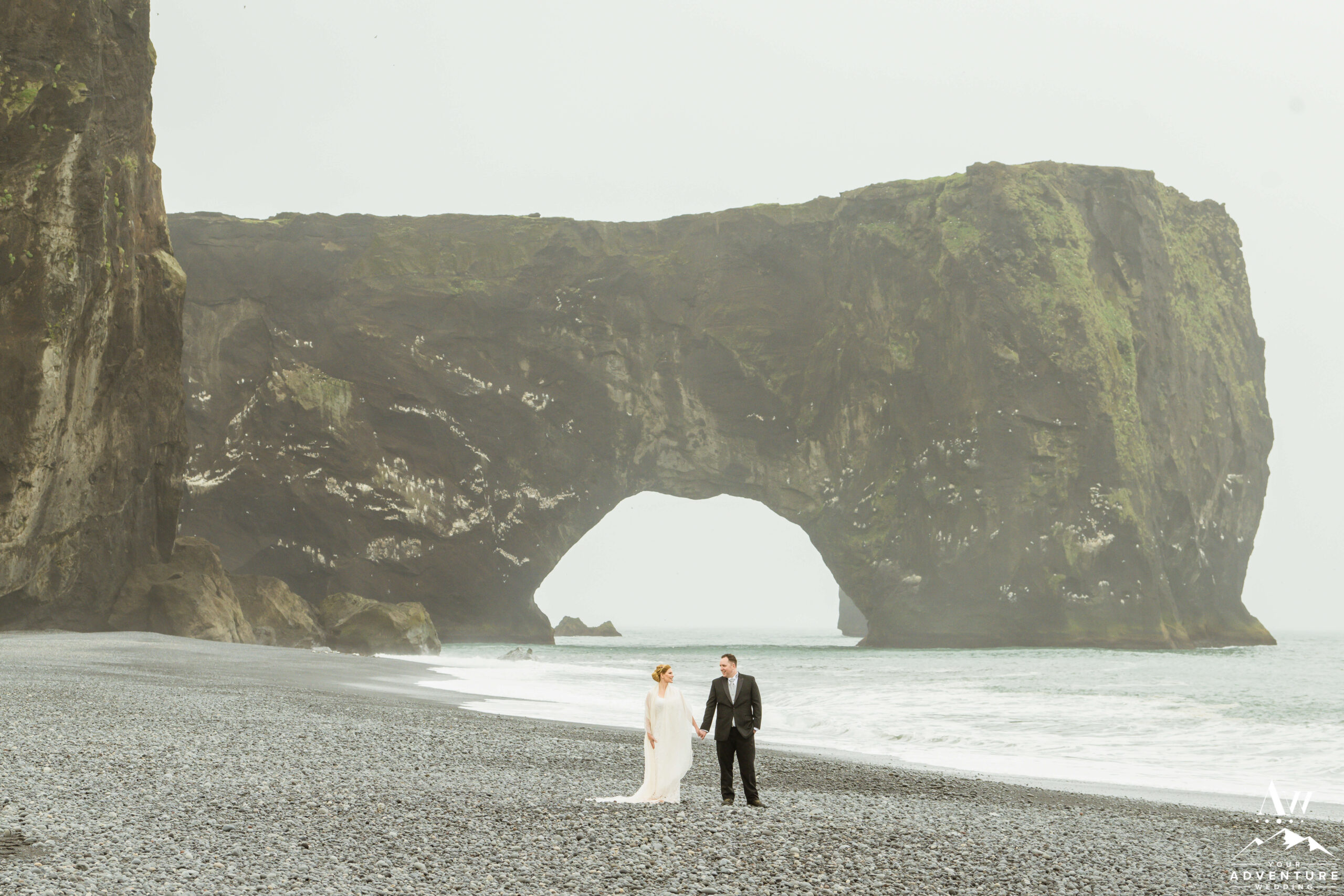 After their waterfall wedding vows the group journey to the private side of Dyrhólaey Black Sand Beach. Here waves crashed dramatically against a towering sea arch. For example, the contrast of dark volcanic sands and the bride’s flowing dress created cinematic moments at every turn, truly! 100% sure this location is perfect for couples who want both natural drama and serene romance in their Iceland wedding photos!