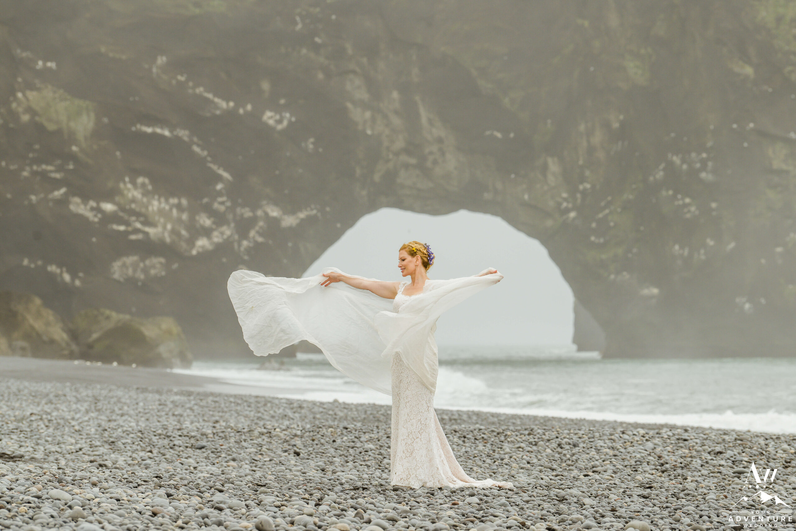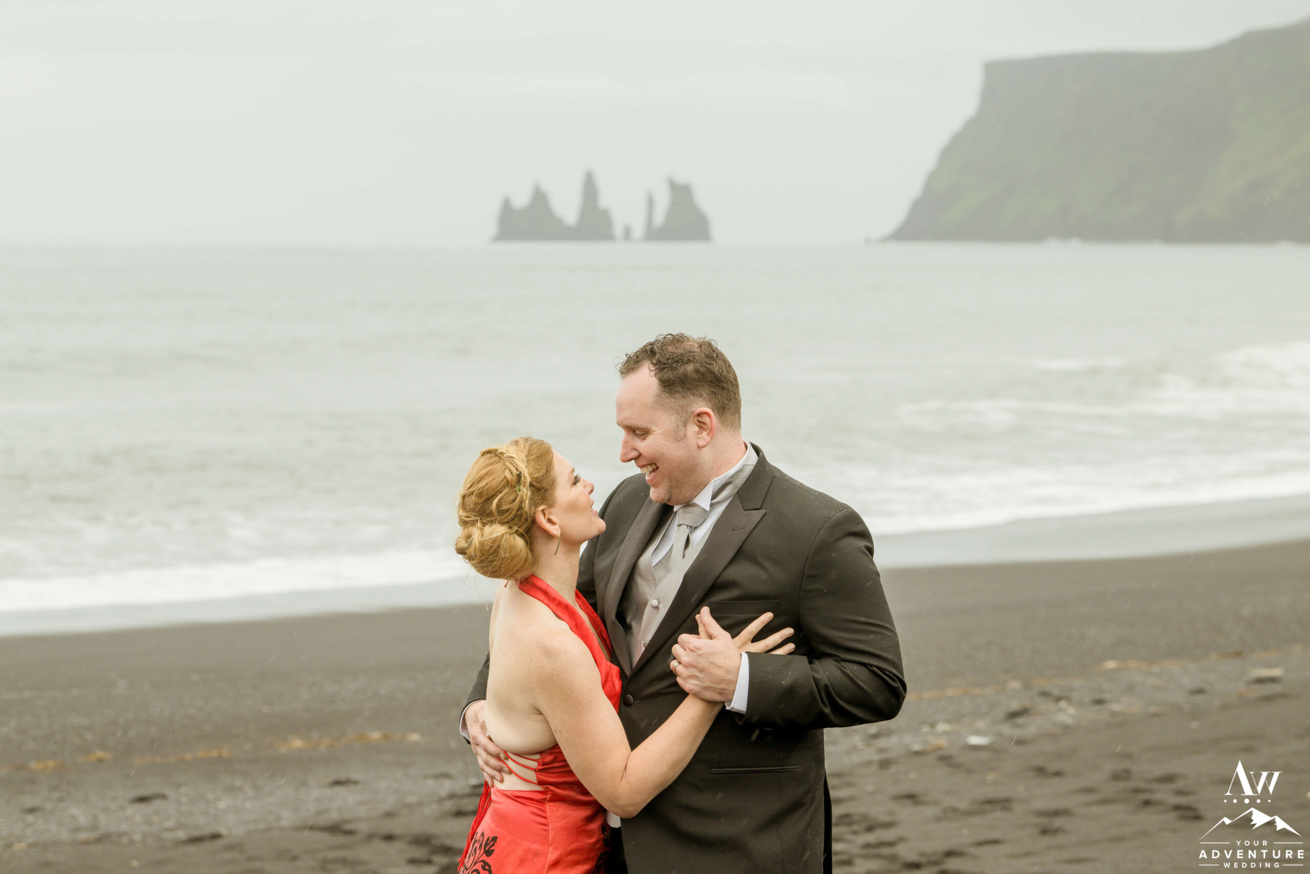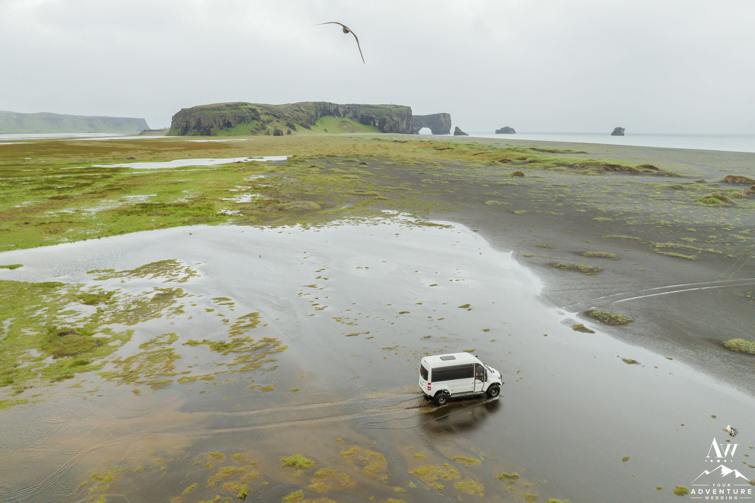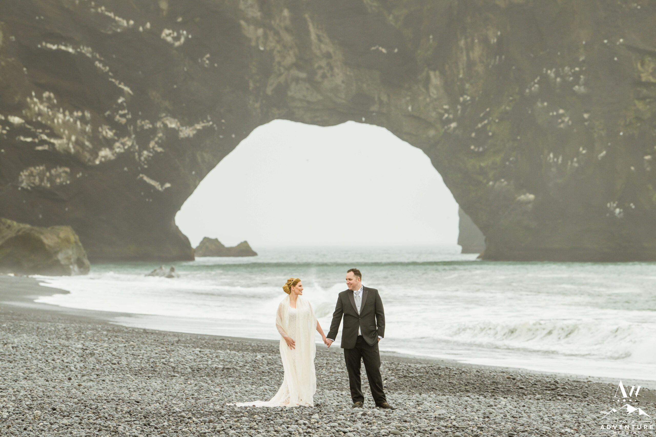 After their waterfall wedding vows the group journey to the private side of Dyrhólaey Black Sand Beach. Here waves crashed dramatically against a towering sea arch. For example, the contrast of dark volcanic sands and the bride’s flowing dress created cinematic moments at every turn, truly! 100% sure this location is perfect for couples who want both natural drama and serene romance in their Iceland wedding photos!