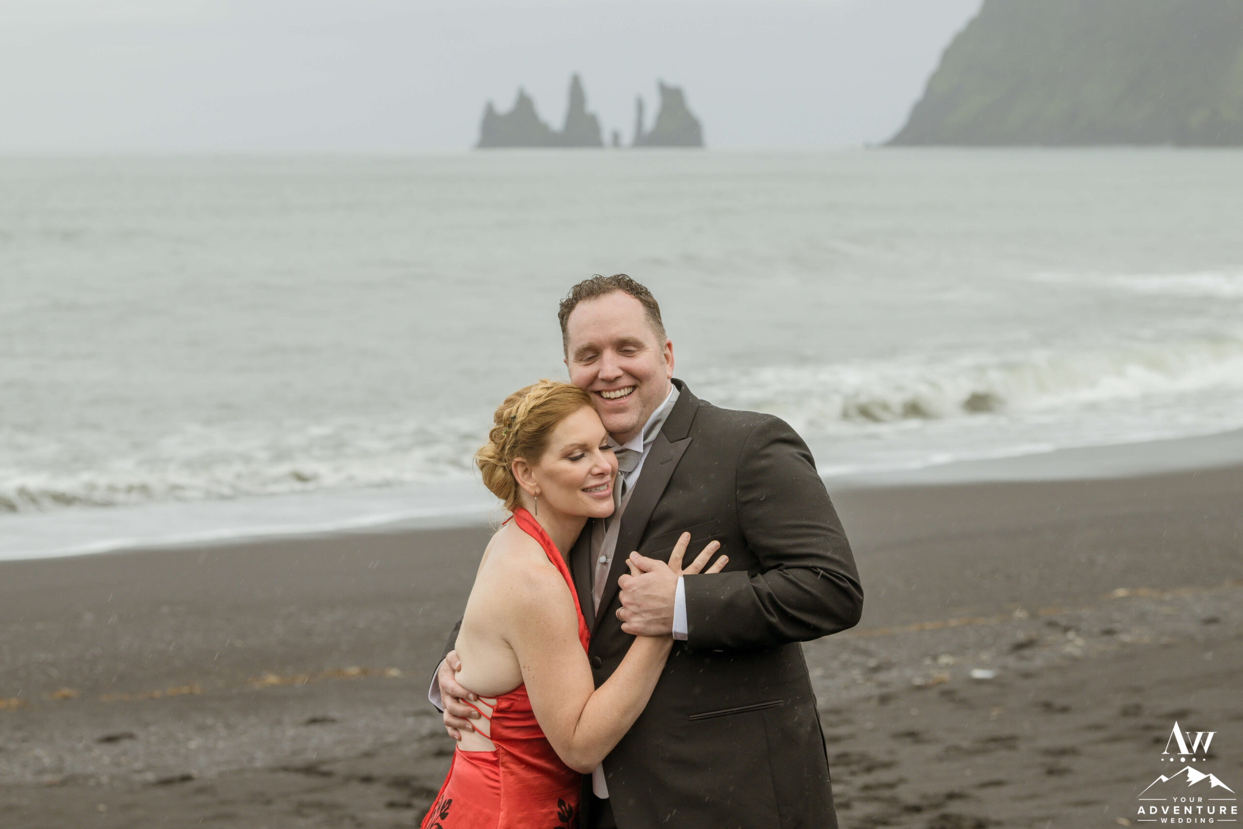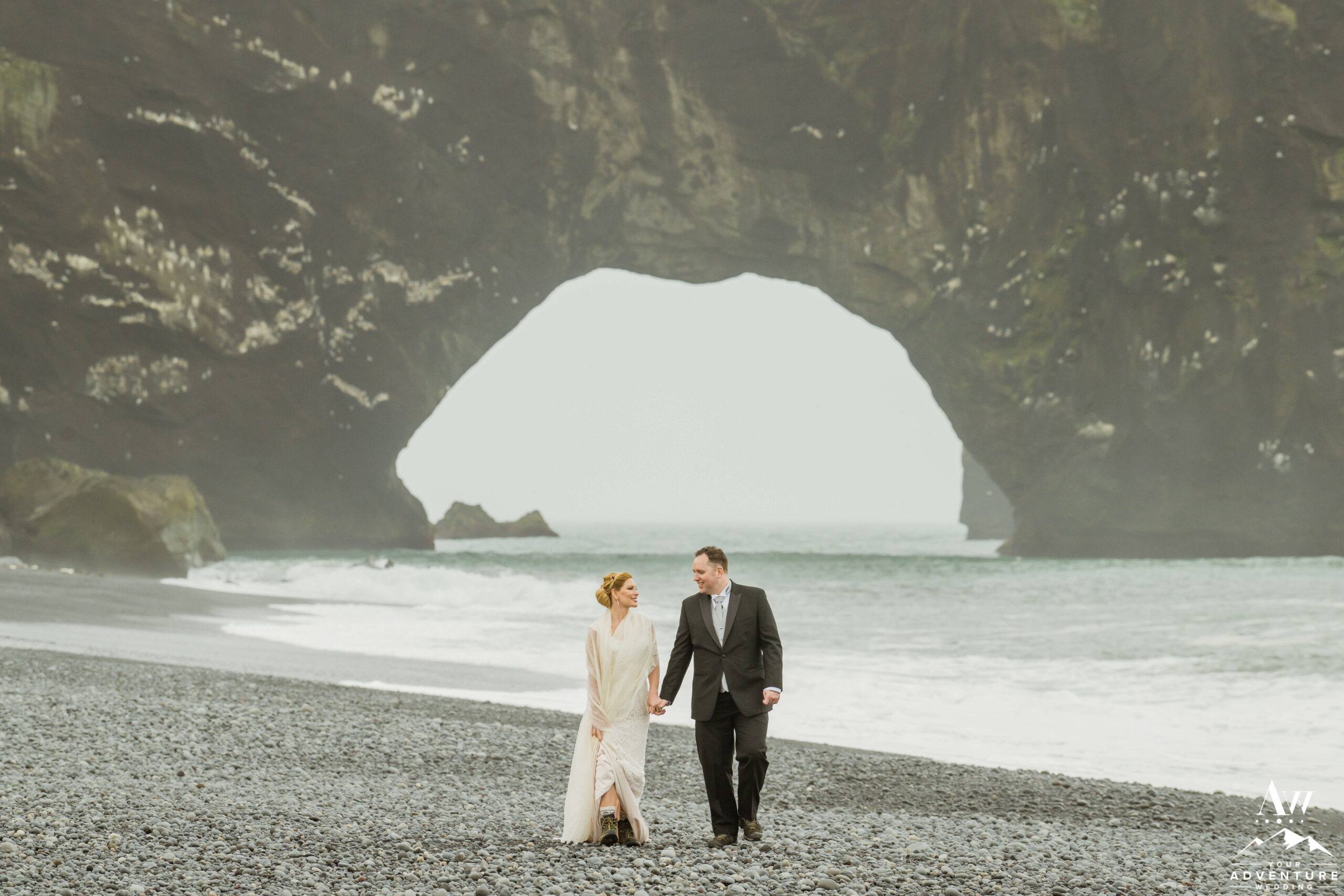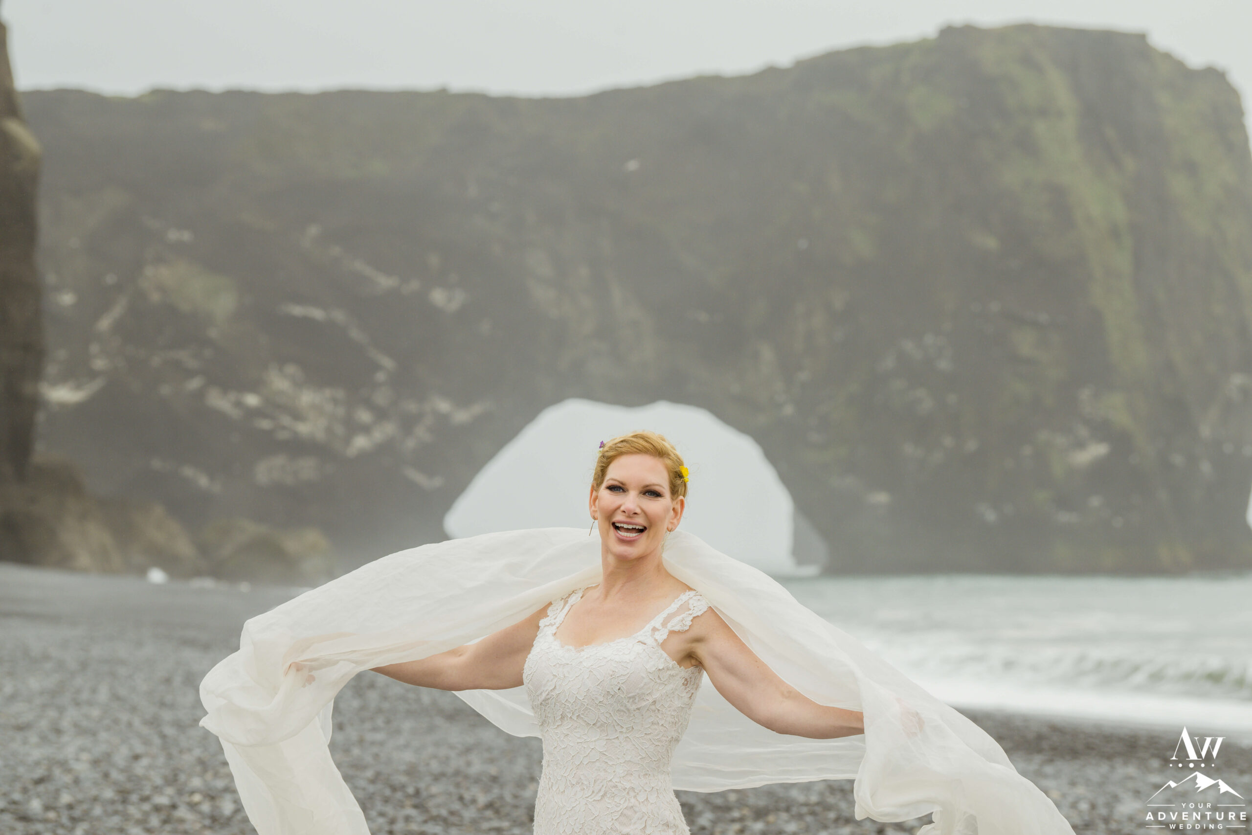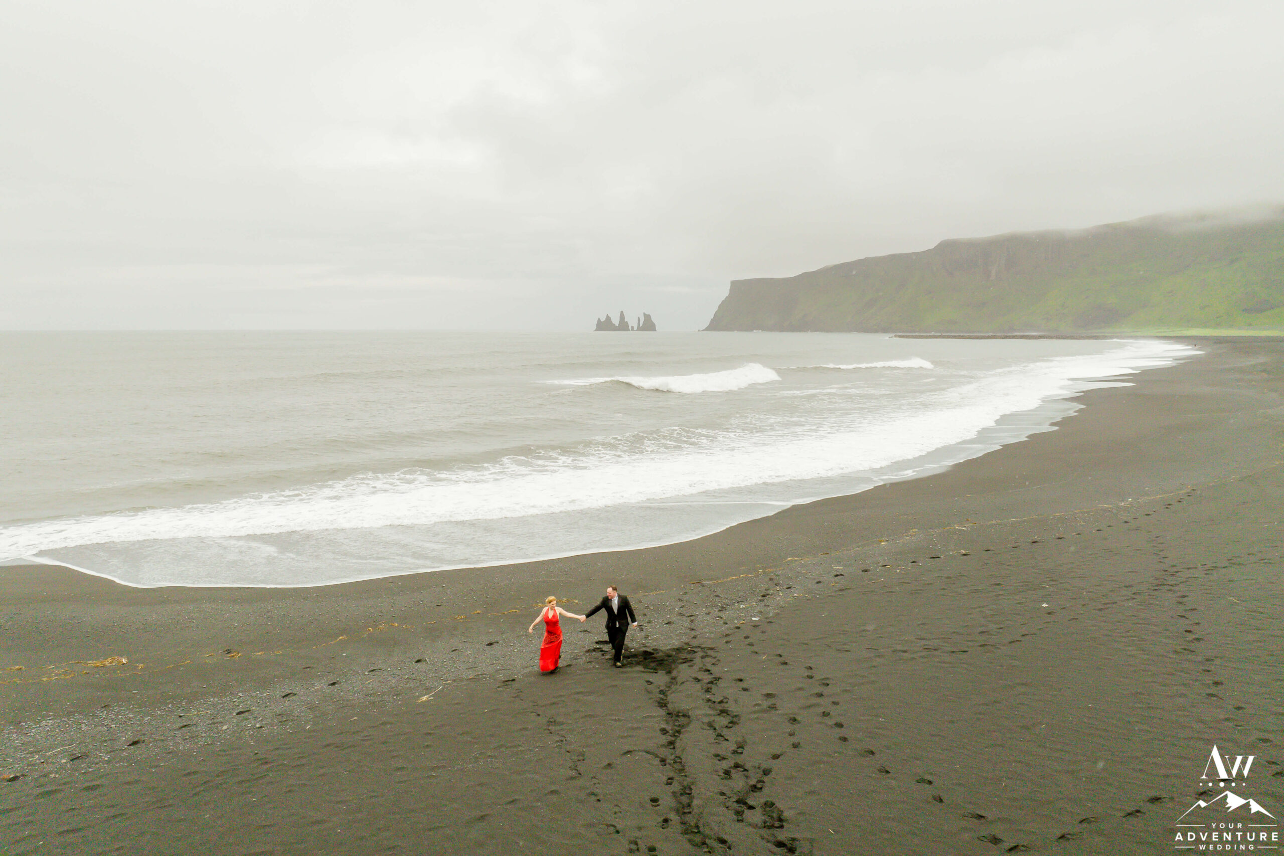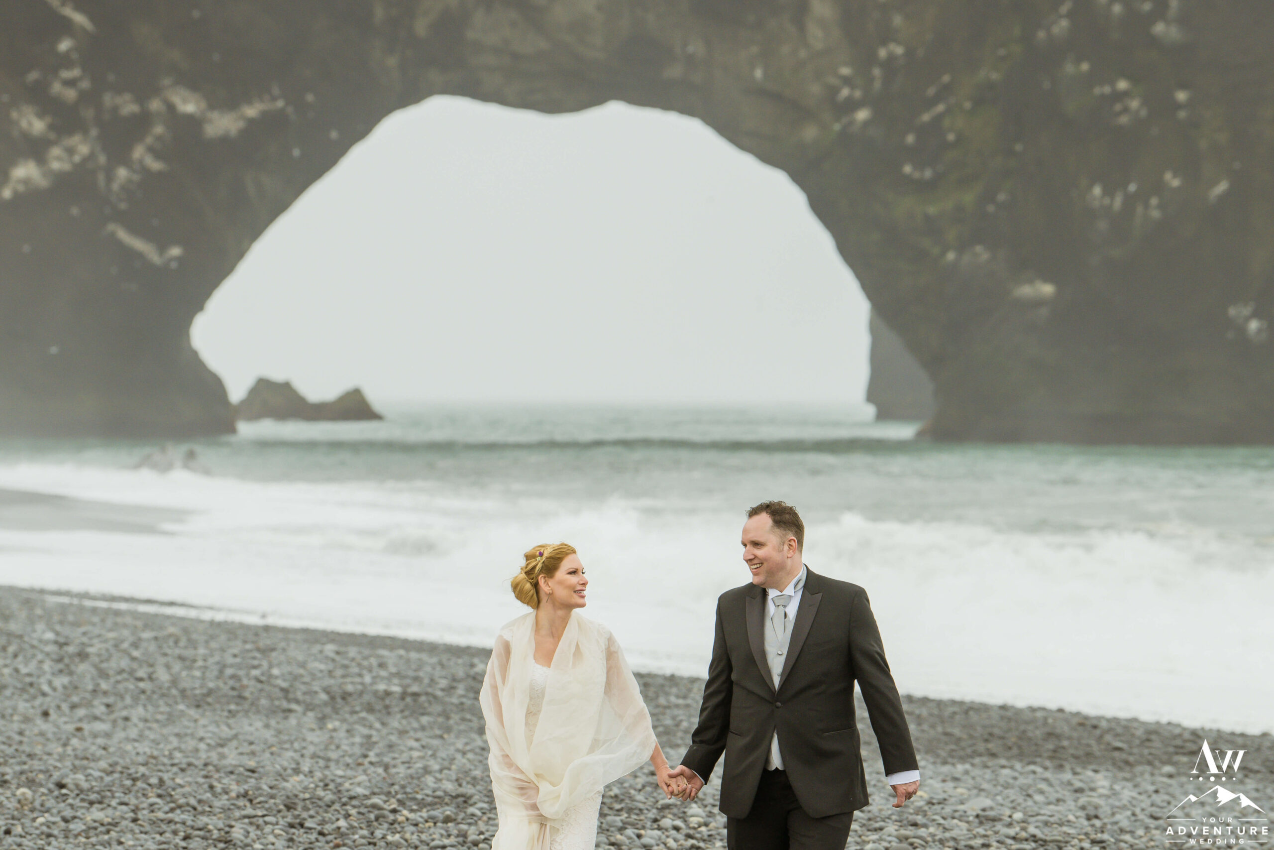 After their waterfall wedding vows the group journey to the private side of Dyrhólaey Black Sand Beach. Here waves crashed dramatically against a towering sea arch. For example, the contrast of dark volcanic sands and the bride’s flowing dress created cinematic moments at every turn, truly! 100% sure this location is perfect for couples who want both natural drama and serene romance in their Iceland wedding photos!