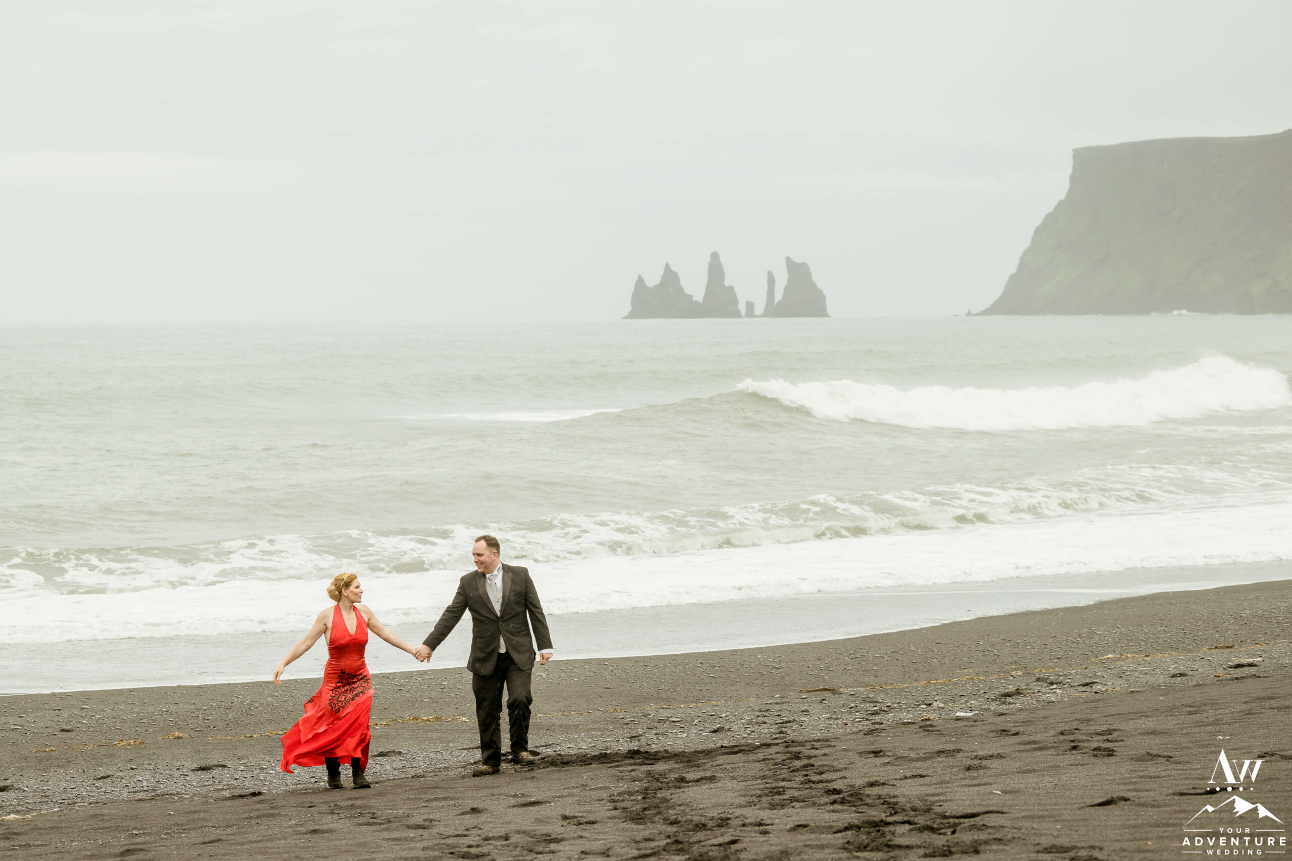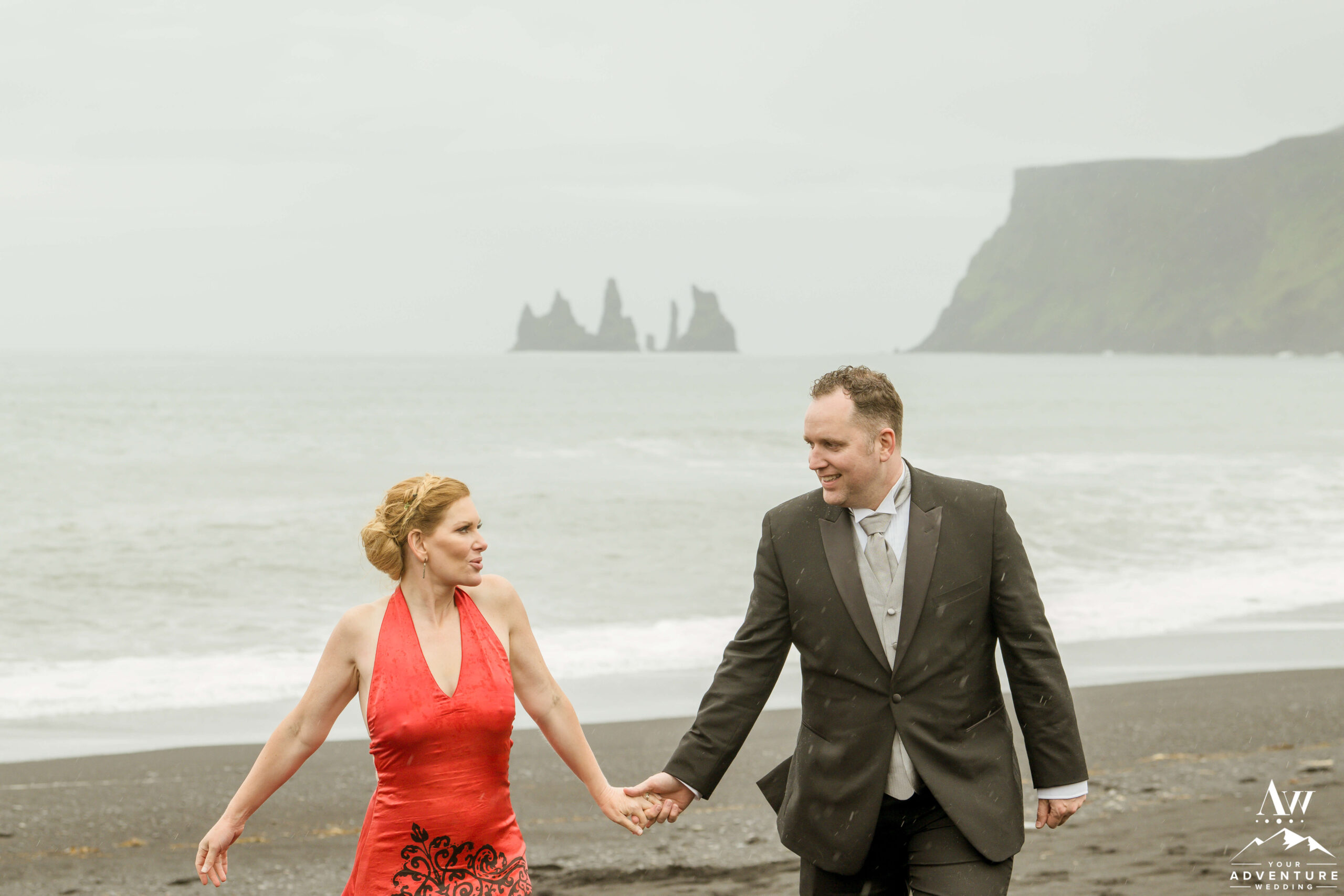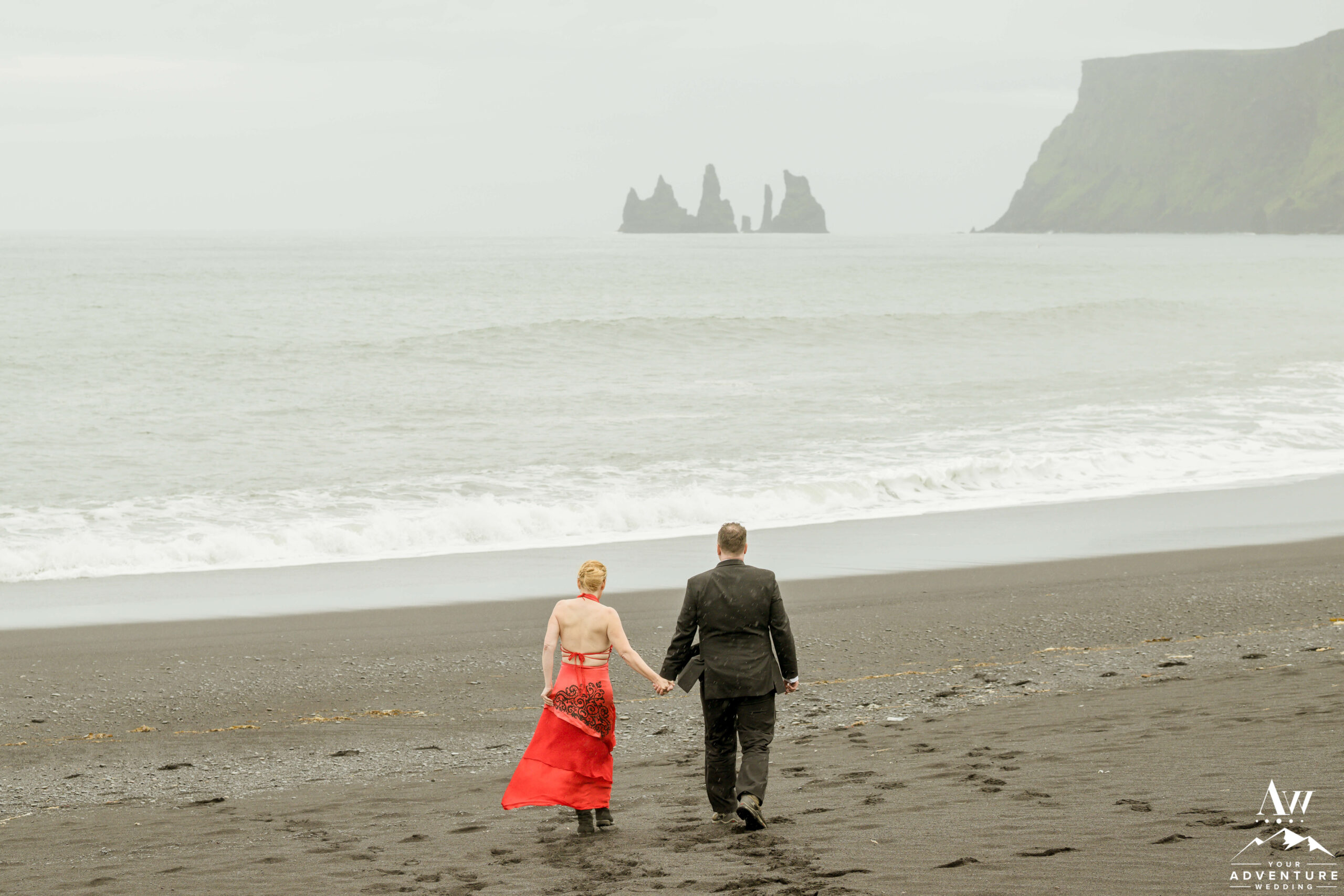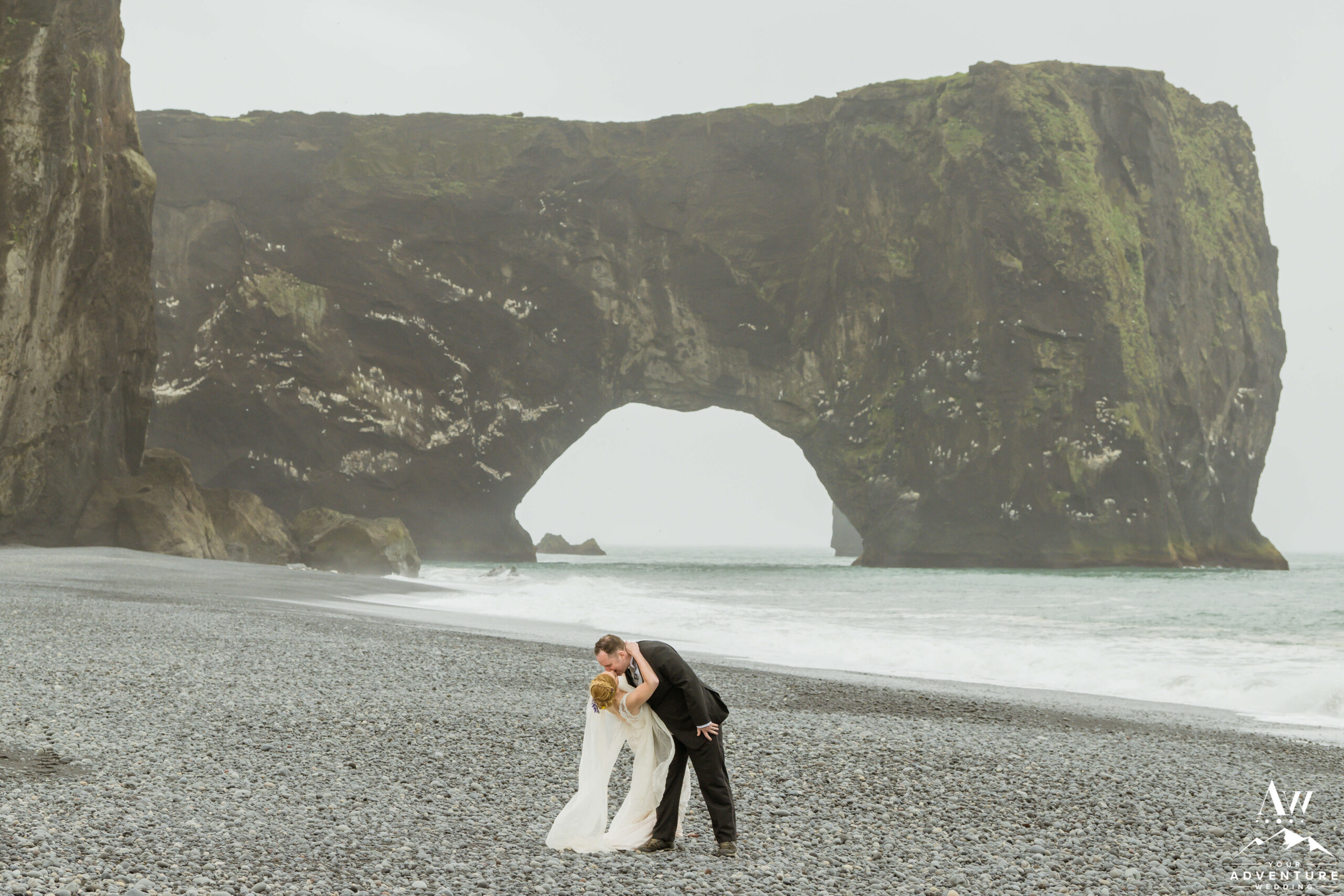 After their waterfall wedding vows the group journey to the private side of Dyrhólaey Black Sand Beach. Here waves crashed dramatically against a towering sea arch. For example, the contrast of dark volcanic sands and the bride’s flowing dress created cinematic moments at every turn, truly! 100% sure this location is perfect for couples who want both natural drama and serene romance in their Iceland wedding photos!