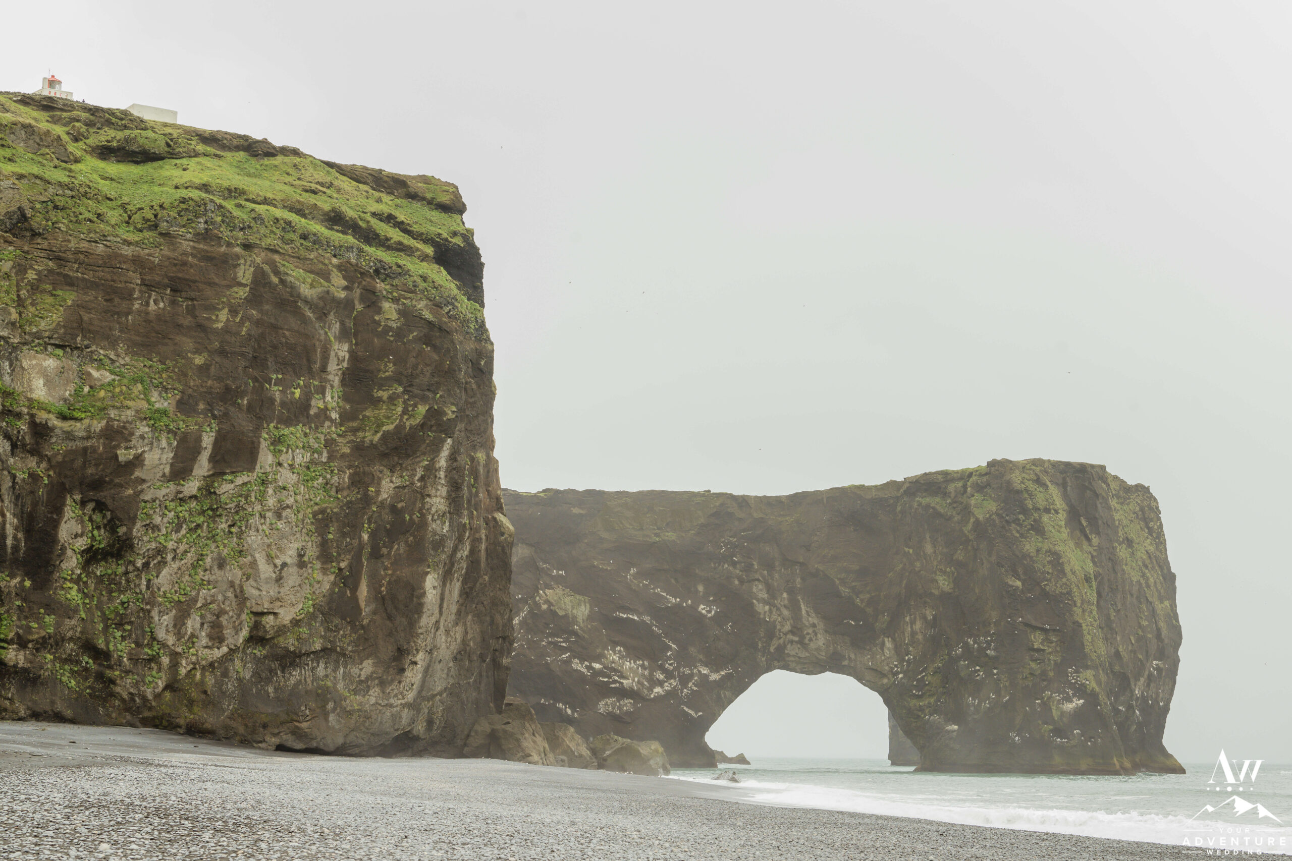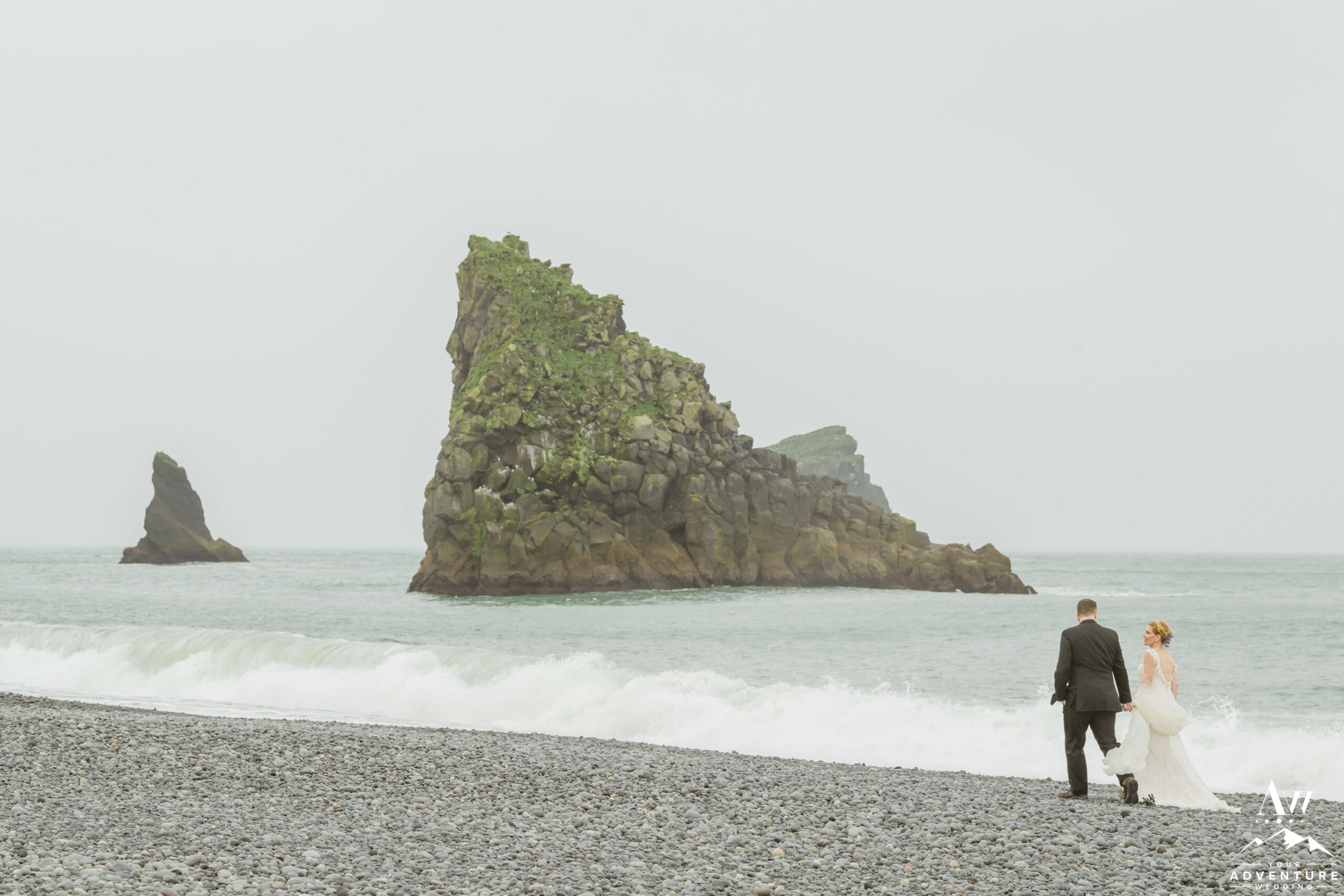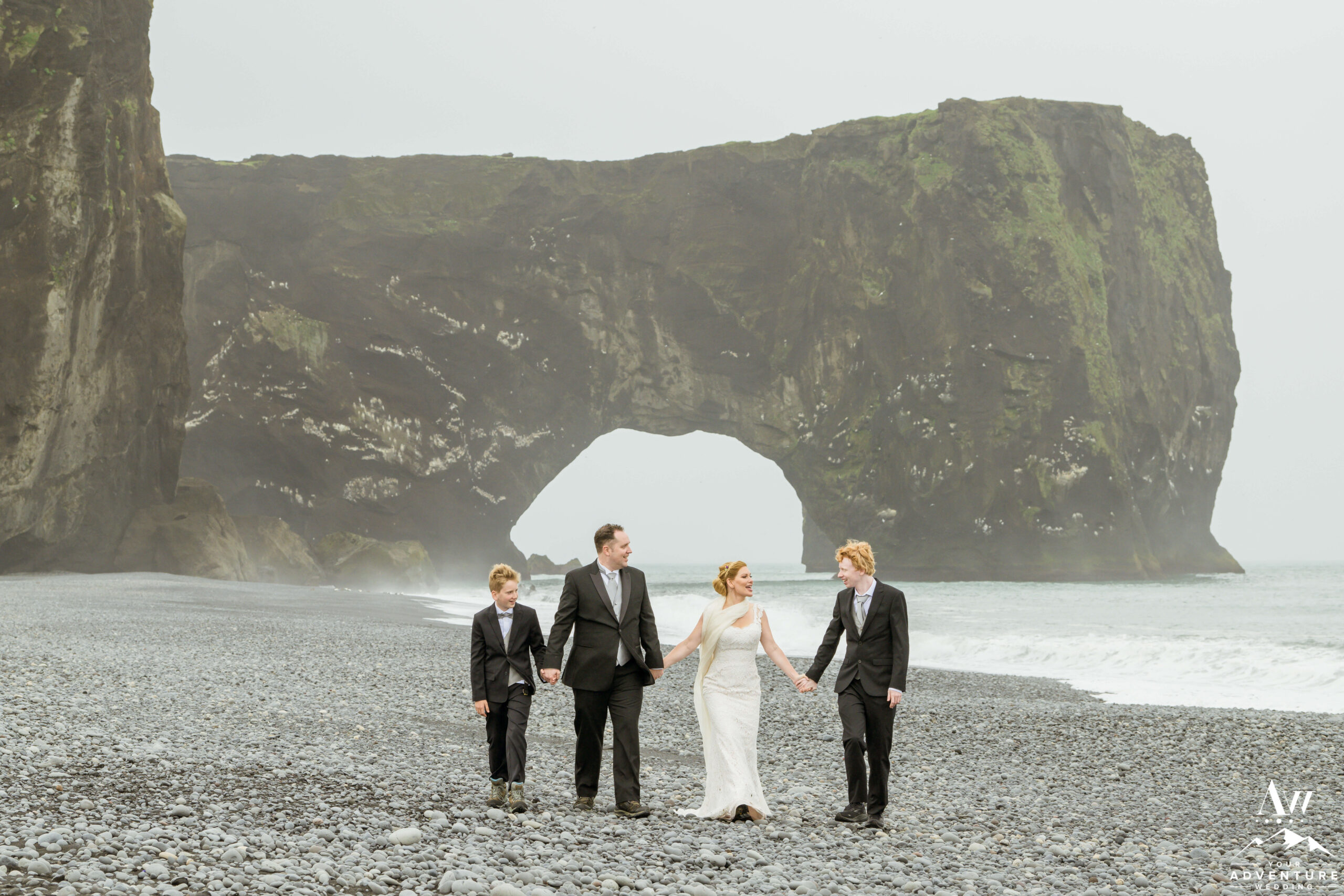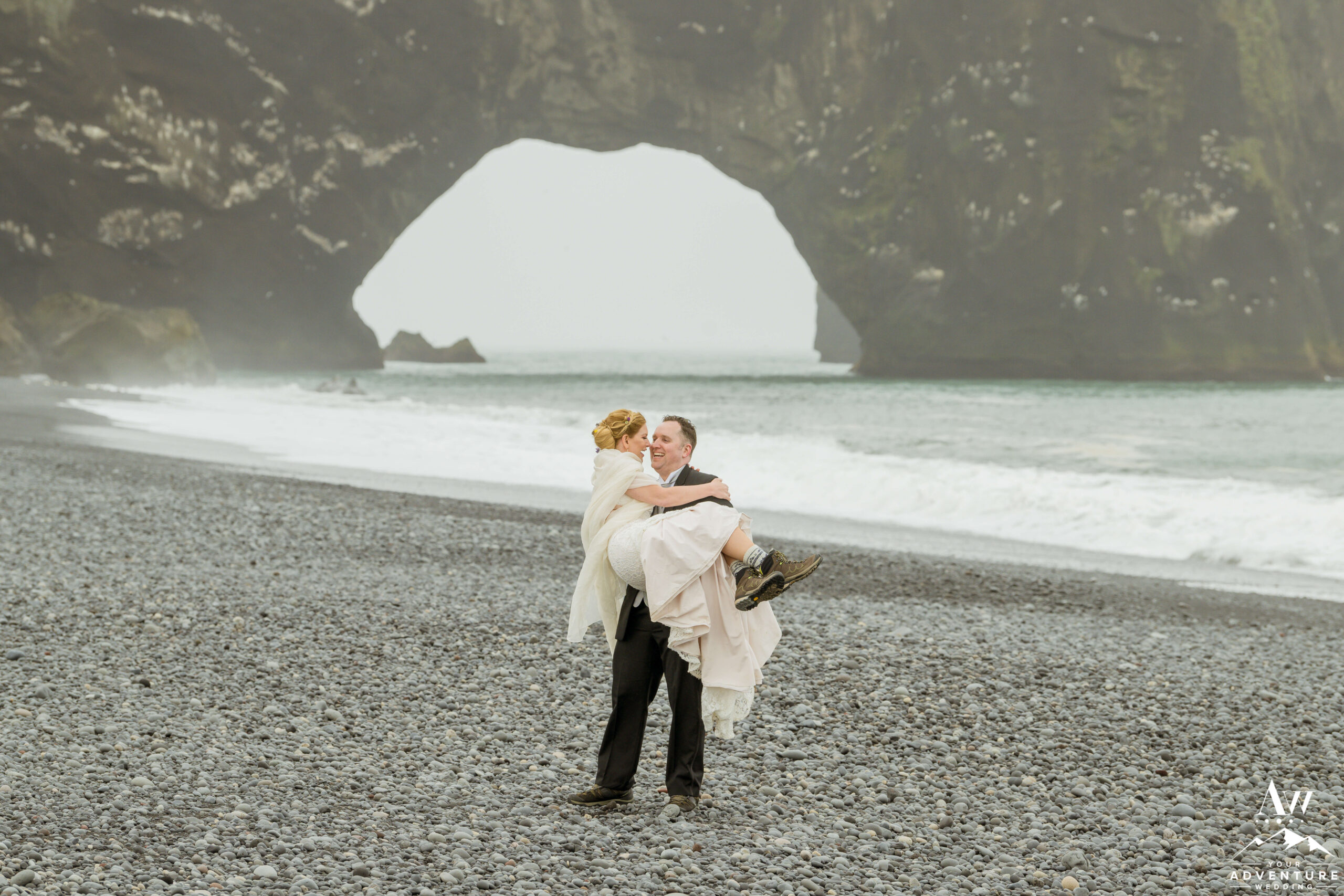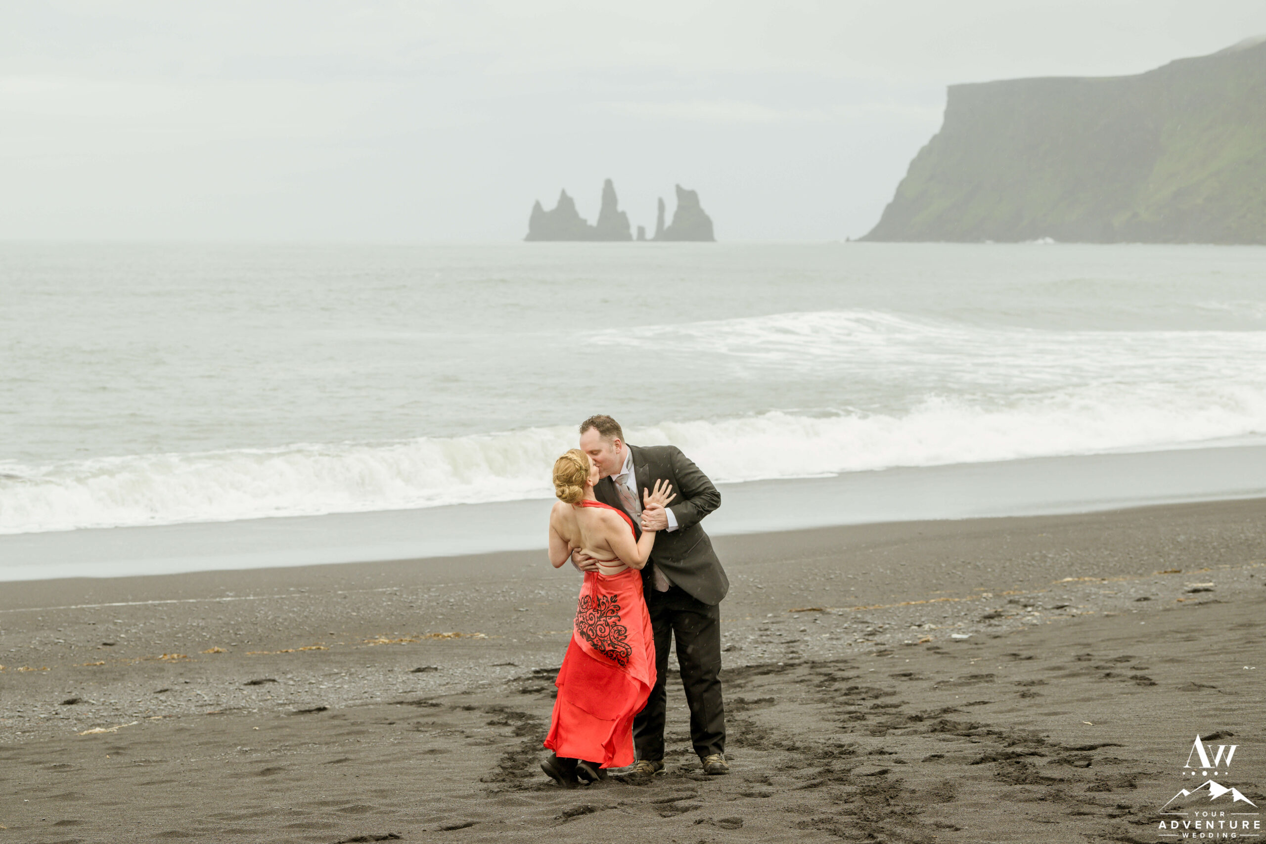 After their waterfall wedding vows the group journey to the private side of Dyrhólaey Black Sand Beach. Here waves crashed dramatically against a towering sea arch. For example, the contrast of dark volcanic sands and the bride’s flowing dress created cinematic moments at every turn, truly! 100% sure this location is perfect for couples who want both natural drama and serene romance in their Iceland wedding photos!