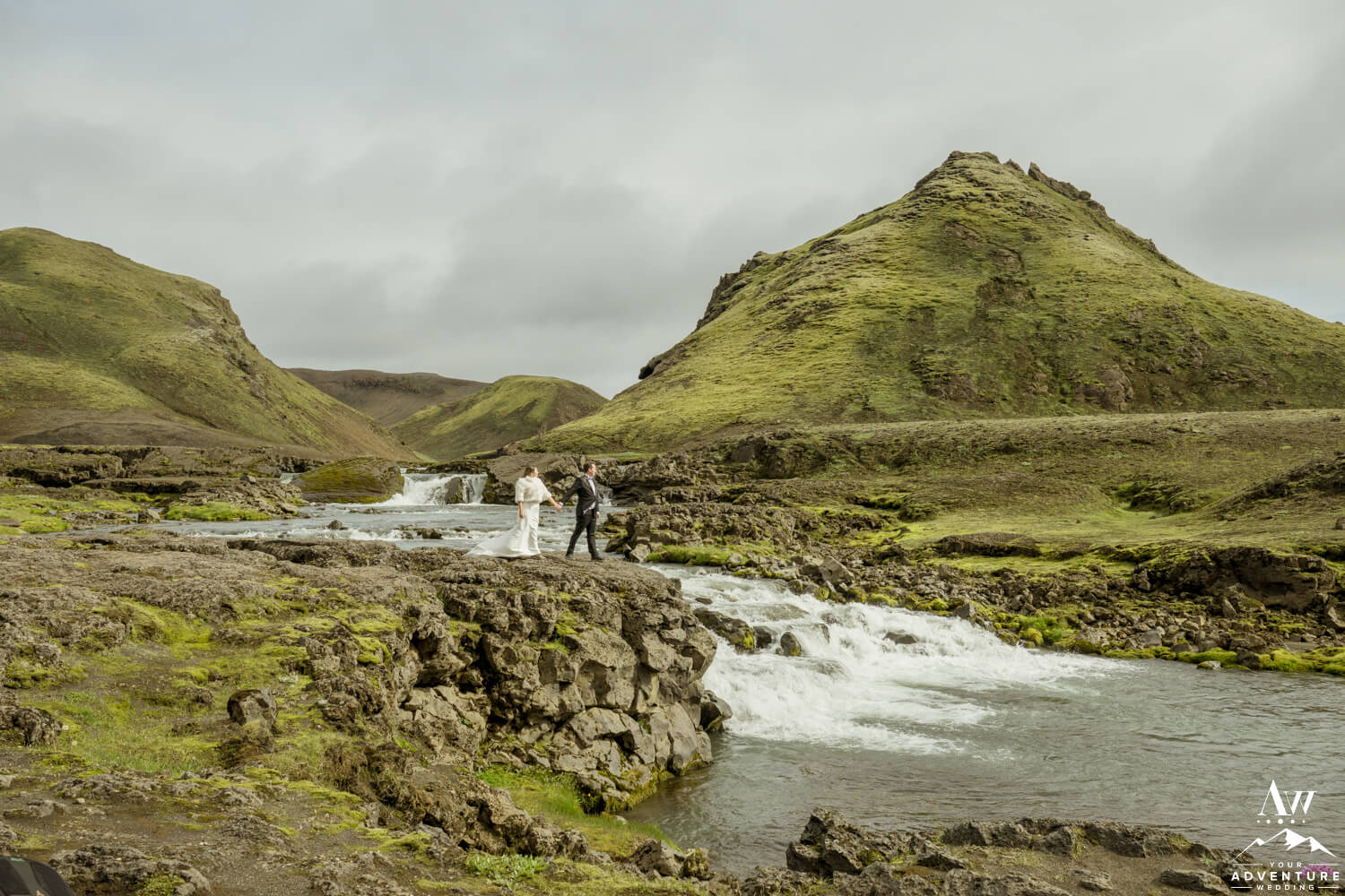 No Iceland highland wedding adventure would be complete without a bit of hiking! Daphne and Ben couple spent part of the afternoon trekking through an area unknown by most. Furthermore, this also allowed the newlyweds to spend time connecting during the hikes! Even in late July, the weather was refreshingly cool especially when they made their way to the top of the waterfall!