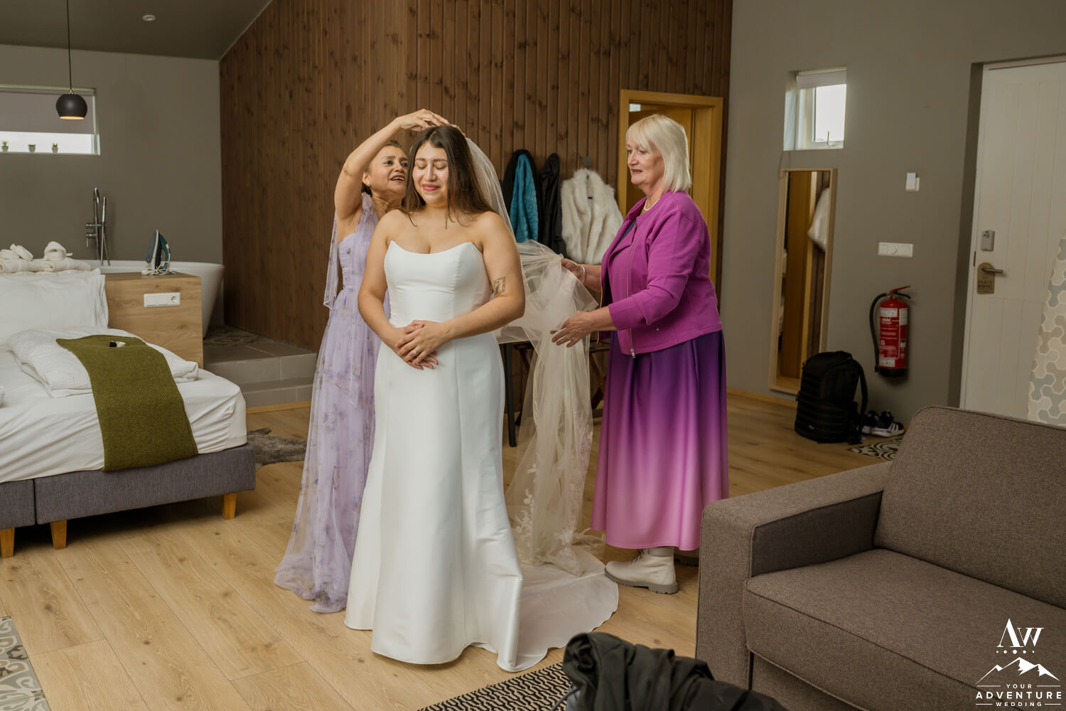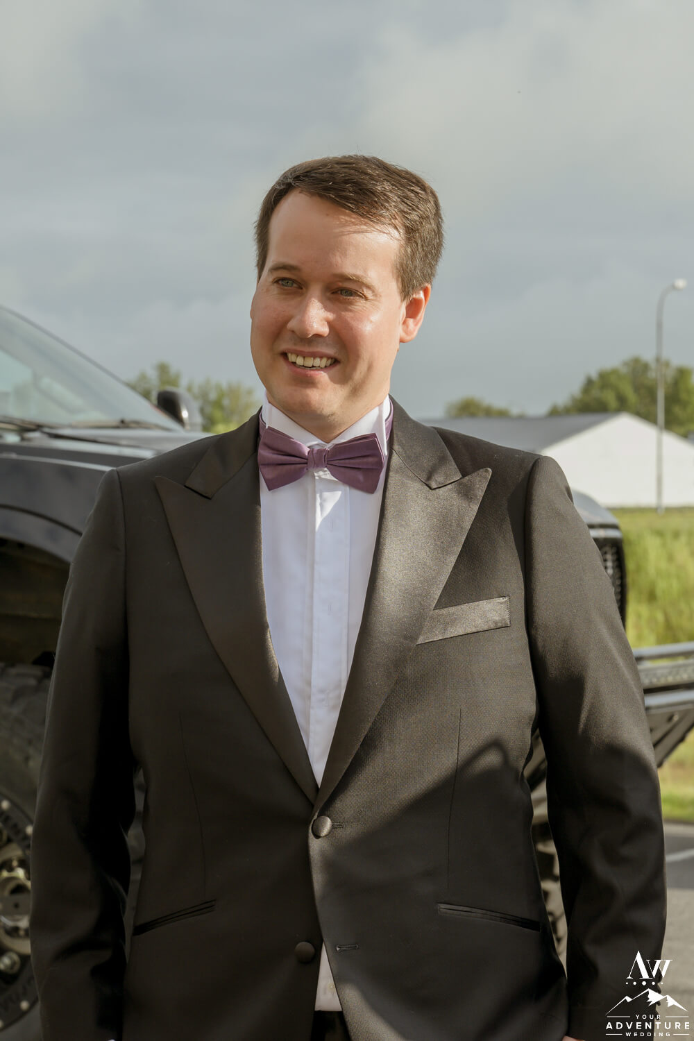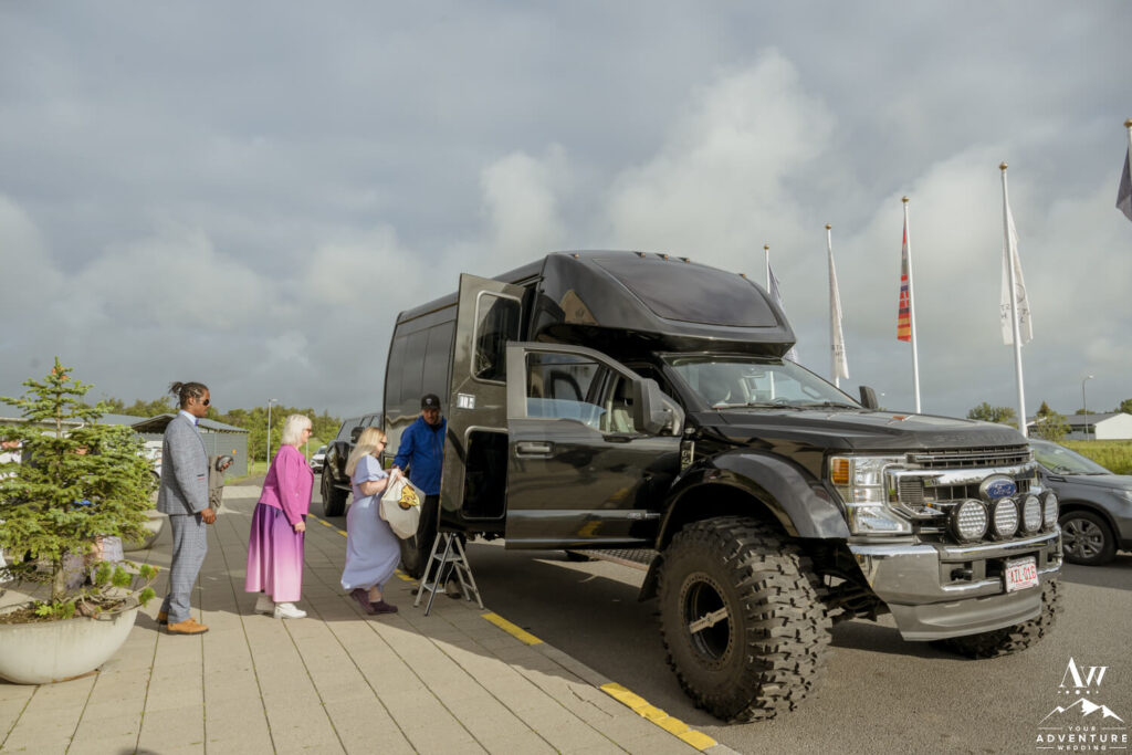 The morning of July 30th 2024, began with quiet ease between Daphne and Ben in their suite at Hotel Stracta. However they did part ways as the beautiful bride began getting ready. Next, our Iceland wedding photographer began photographing all of their lovely details. For example, the brides dress and groom details were all thoroughly documented to begin the start of the story’s day. The pair had around 10 guests join them on their highland waterfall wedding adventure. Before loading into the super jeep for the day all the guests had their go bags ready in hand and posed for a quick photo!