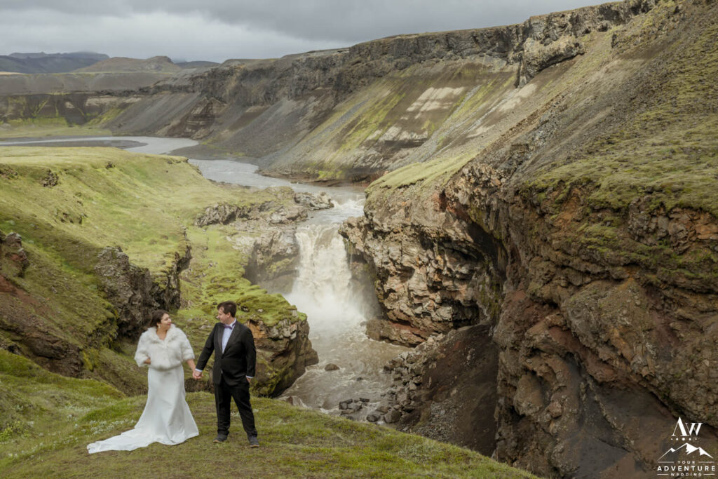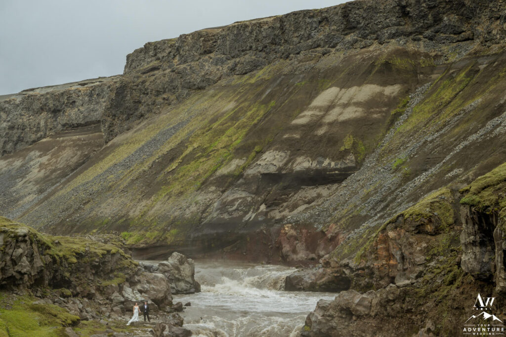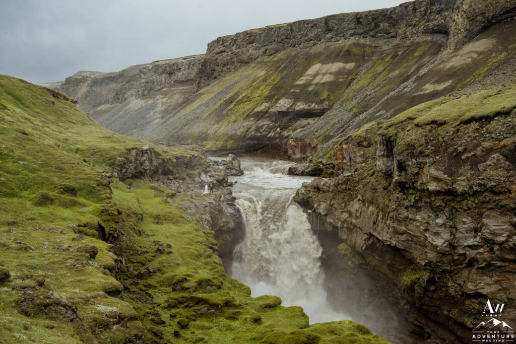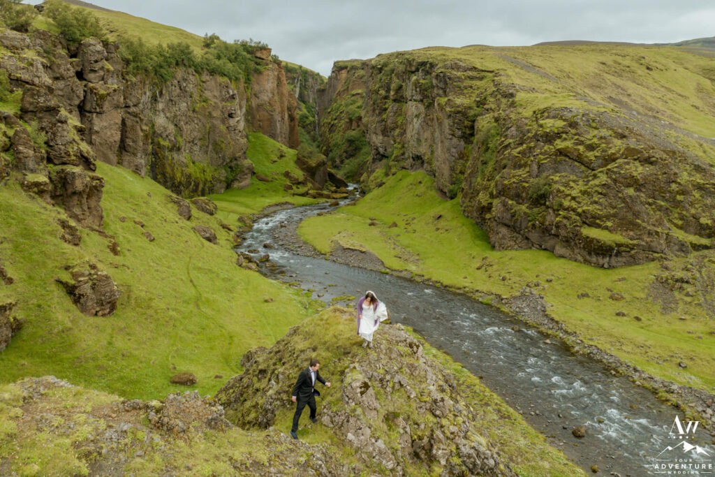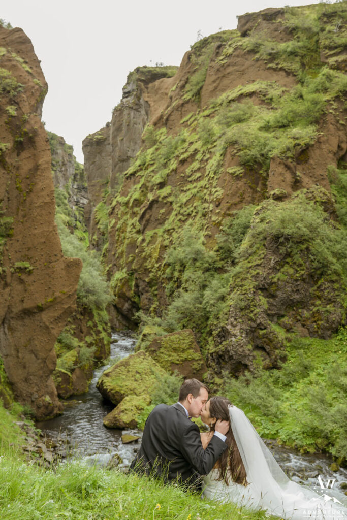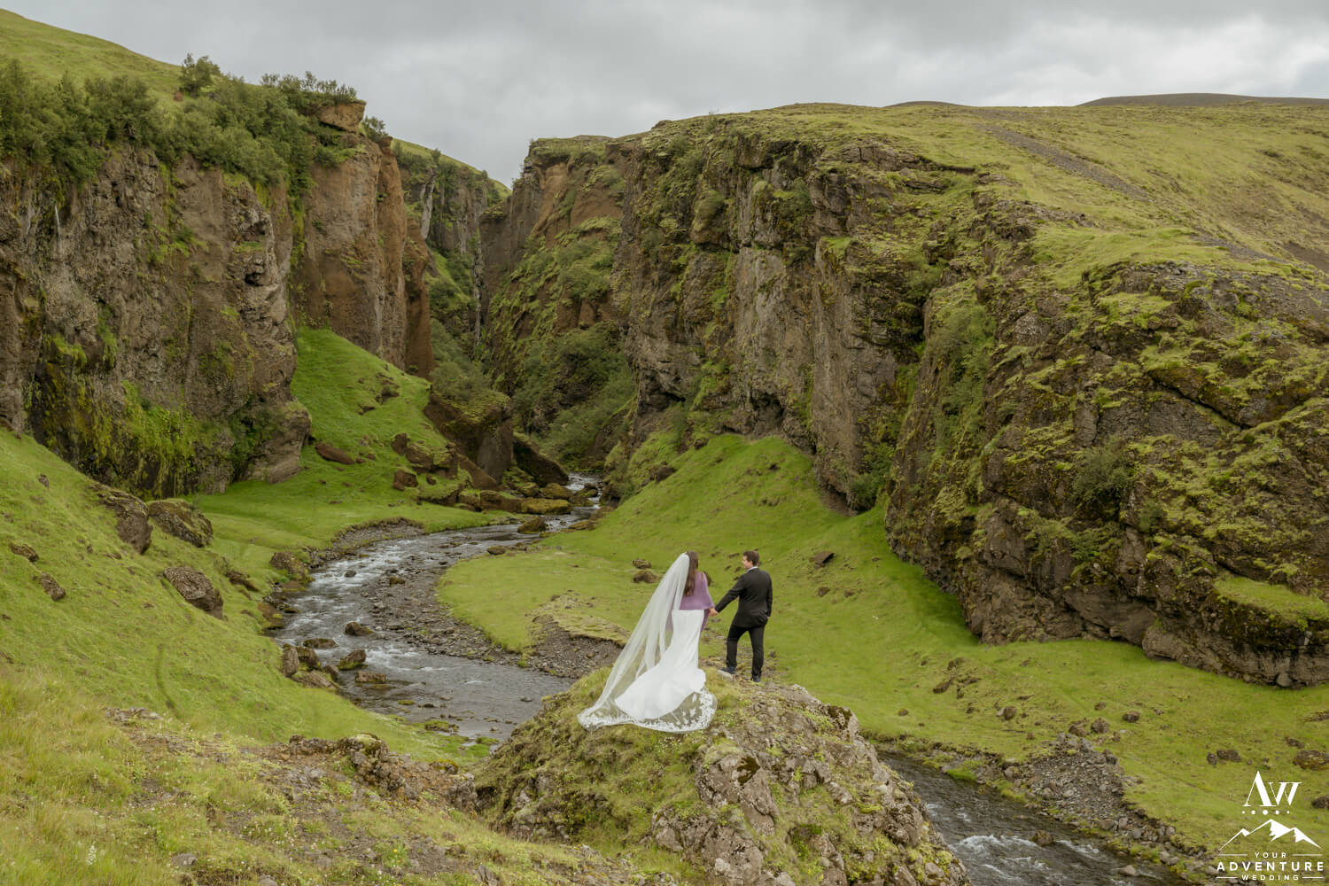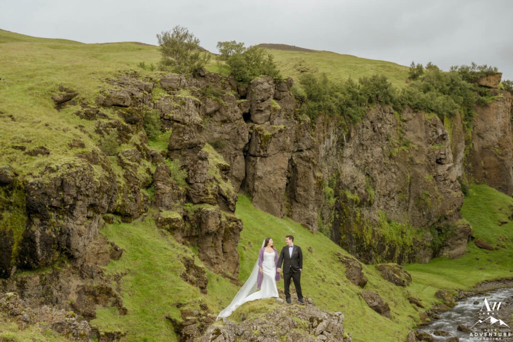 Meanwhile, did you know that there are several places in Iceland that give off Hawaii or Kauai vibes? To illustrate, the next location on their Iceland wedding itinerary is definitely classified as one of them! Here Daphne and Ben explored a picturesque canyon often compared to something out of Hawaii. Why you might wonder? Well! Lush green meets steep cliffs, and a stunning river flowing through lava rock!